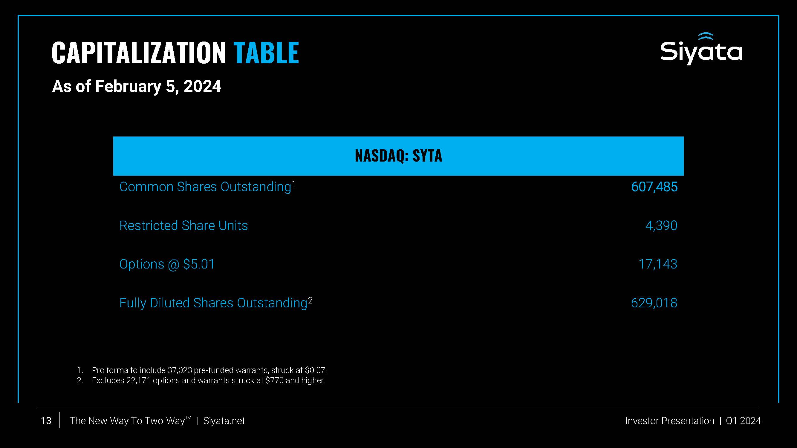 资本化表1。备考纳入37,023只预筹认股证,报0.07美元。2.不包括在770美元及以上的22,171份期权和认股权证。13 The New Way to Two Way TM | Siyata.net投资者介绍|截至2024年2月5日的2024年第一季度NASDAQ:SYTA 607,485股已发行普通股14,390股限制性股票单位17,143份期权@5.01629,018美元已完全稀释流通股2