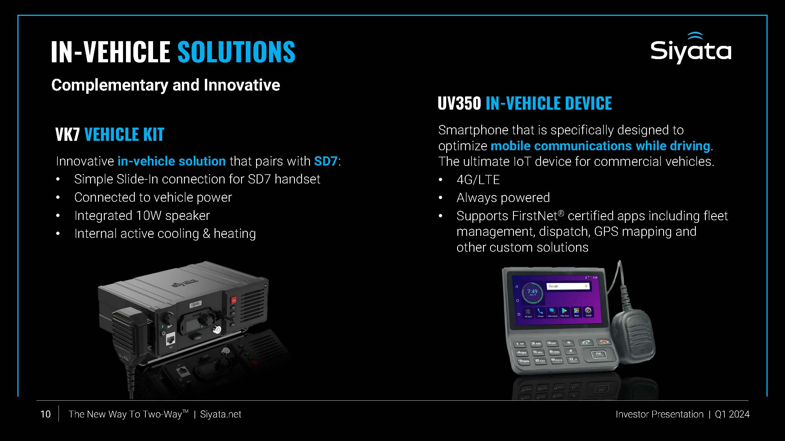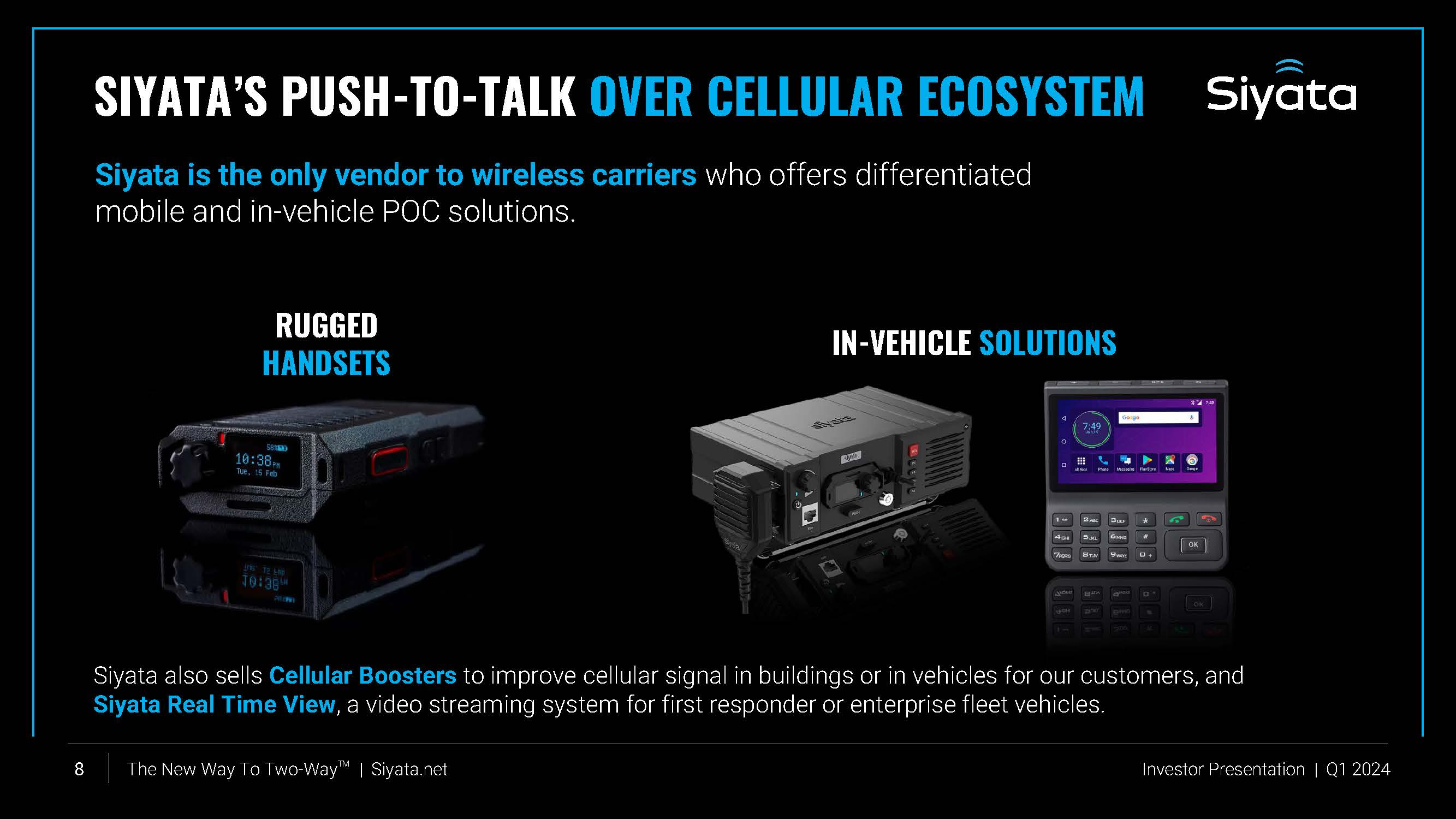 SIYATA对细胞生态系统的一键通SIYATA是无线运营商唯一一家提供差异化移动和车载POC解决方案的供应商。Rugged HANDSETS 8 The New Way to Two-Way TM | Siyata.net投资者介绍| 2024年第一季度IN-Vehicle Solutions Siyata还为我们的客户销售用于改善建筑物或车辆中的蜂窝信号的蜂窝助推器,以及用于急救人员或企业车队车辆的视频流系统Siyata Real Time View。