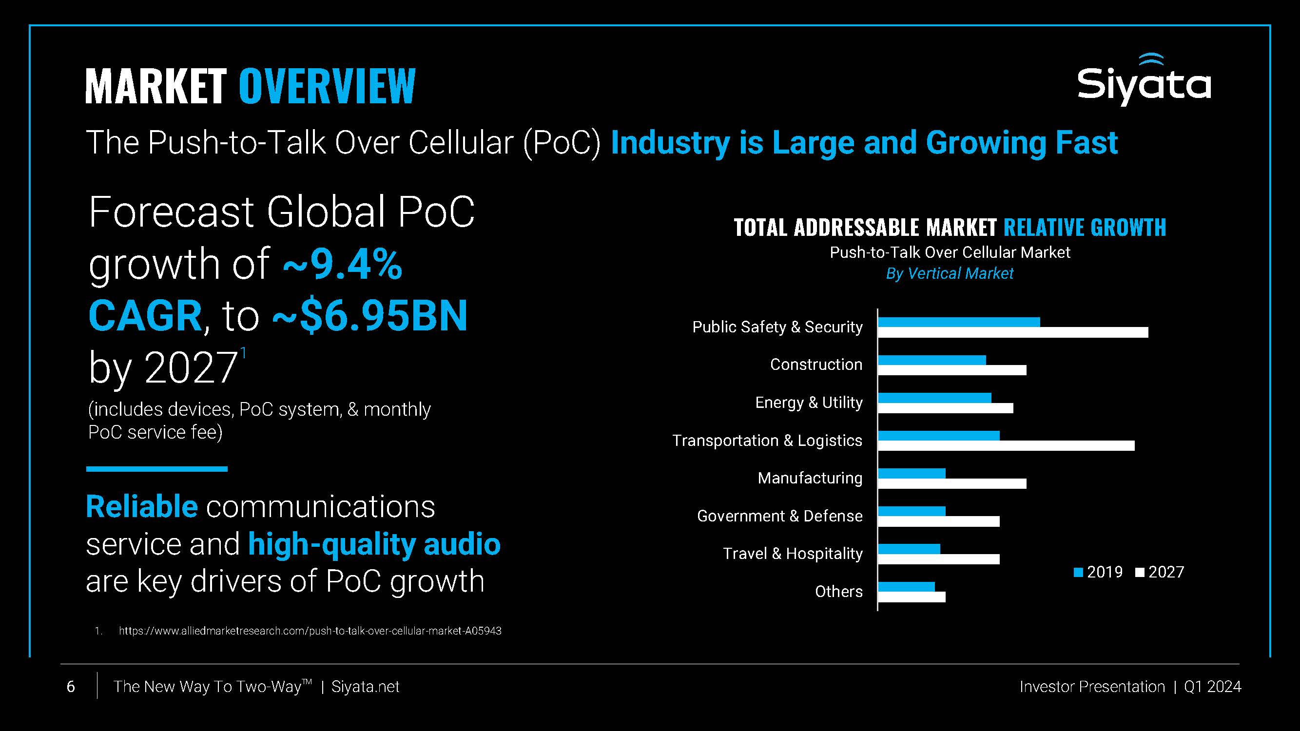 市场概览预测全球POC复合年增长率约为9.4%,到2027年将达到约69.5亿美元1(包括设备、POC系统、&月POC服务费)一键通(POC)行业规模大且增长快可靠通信服务和高质量的音频是POC增长的关键驱动力1. https://www.alliedmarketresearch.com/push-to-talk-over-cellul-market-A05943公共安全与安保建设能源与公用事业运输与物流制造政府与国防旅行与酒店其他20192027 6双向的新方式TM | Siyata.net投资者介绍| 2024年第一季度总可寻址市场相对增长按垂直市场推-to-talk over cellular market