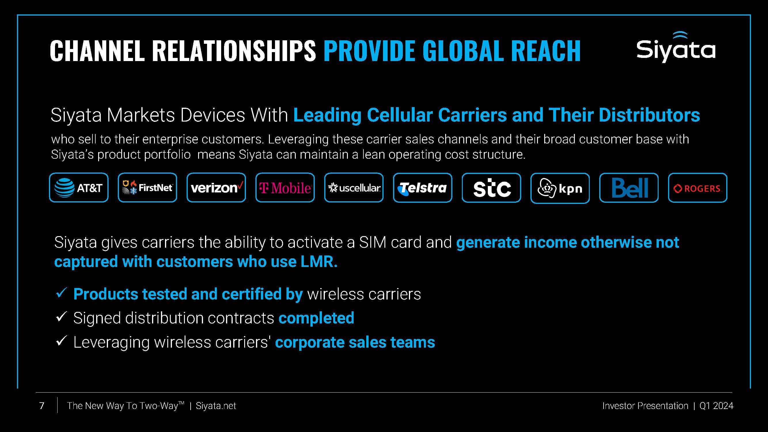 Channel RelationSHIPS为Global REACH Siyata Markets设备提供领先的蜂窝运营商及其分销商,这些分销商向其企业客户进行销售。凭借Siyata的产品组合,利用这些运营商销售渠道及其广泛的客户群,意味着Siyata可以保持精益的运营成本结构。Siyata为运营商提供了激活SIM卡并产生收入的能力,否则这些收入不会在使用LMR的客户中获得。x无线运营商测试和认证的产品x已签署的分销合同完成x利用无线运营商的企业销售团队7双路新途径-TM | Siyata.net投资者介绍| 2024年第一季度