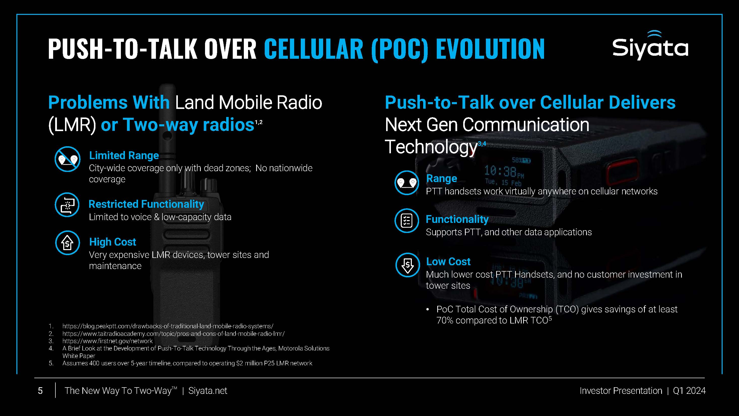 通过Land Mobile Radio(LMR)或双向无线电1,2有限范围城市-仅有死区的广泛覆盖;没有全国范围的覆盖受限功能仅限于语音和低容量数据高成本非常昂贵的LMR设备、铁塔站点和维护Push to Talk over Cellular提供下一代通信技术3,4种范围的PTT手机几乎可以在蜂窝网络上的任何地方工作。功能支持PTT,其他数据应用低成本低得多的PTT手机,与LMR TCO 51相比,无需客户投资塔址• POC总拥有成本(TCO)可节省至少70%。https://blog.peakptt.com/drawbacks-of-traditional-land-mobile-radio-systems/2. https://www.taitradioacademy.com/topic/pros-and-cons-of-land-mobile-radio-lmr/3. https://www.firstnet.gov/network 4。一览Push to Talk技术的发展历代历程,摩托罗拉解决方案白皮书5。假设在5年时间内有400个用户,而运营200万美元的P25 LMR网络5是通往双向TM的新方式| Siyata.net投资者介绍| 2024年第一季度