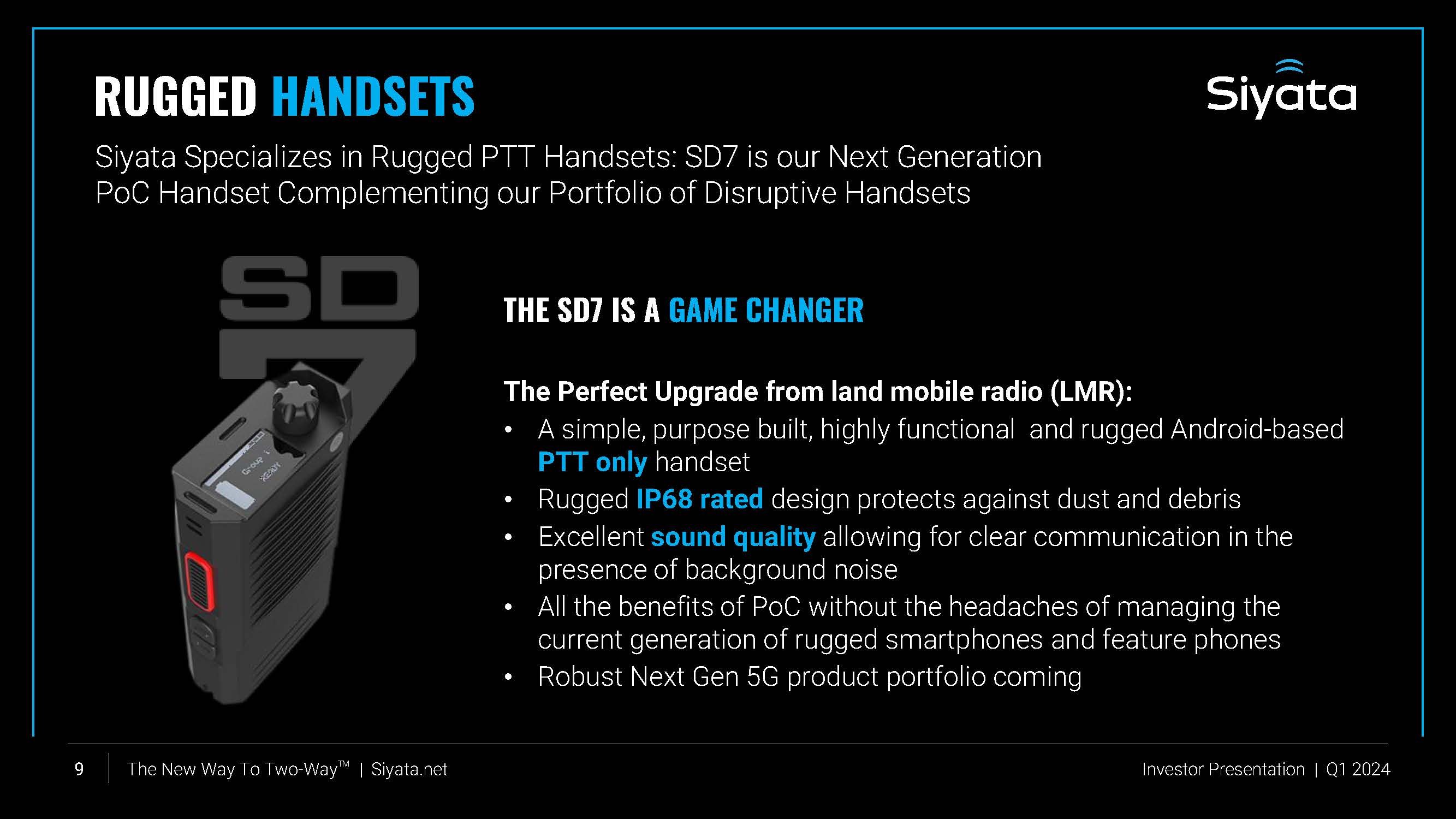 Rugged HandSETS Siyata专攻Rugged PTT Handsets:SD7是我们的下一代POC Handset,补充了我们的颠覆性手机产品组合SD7是一款游戏改变者从陆地移动无线电(LMR)的完美升级:•一个简单、有目的的构建,功能强大且坚固耐用的基于Android的PTT only手机•坚固的IP68级设计可防止灰尘和碎片•出色的音质允许在存在背景噪音时进行清晰的通信• POC的所有好处,而无需为管理当前这一代坚固耐用的智能手机和功能手机而头疼•稳健的下一代5G产品组合即将到来9 The New Way to Two-Way TM | Siyata.net投资者介绍| 2024年第一季度