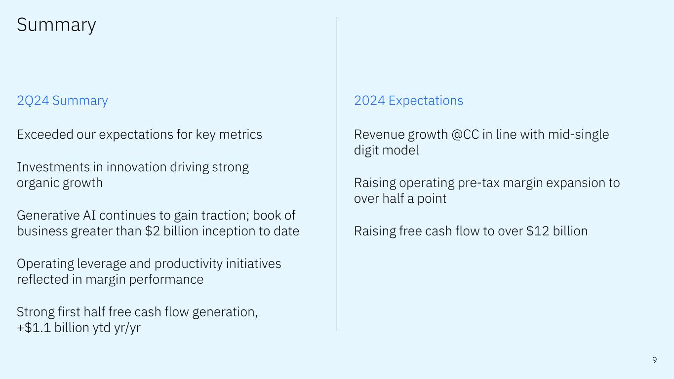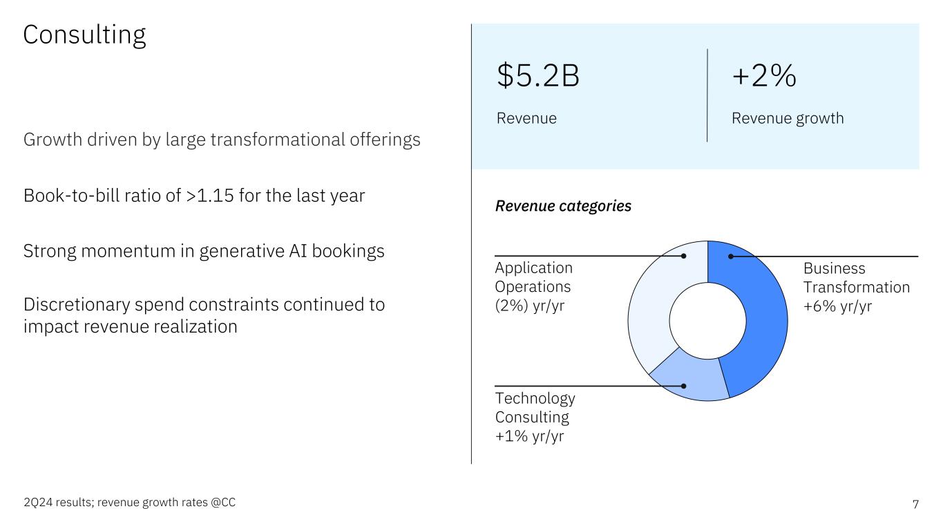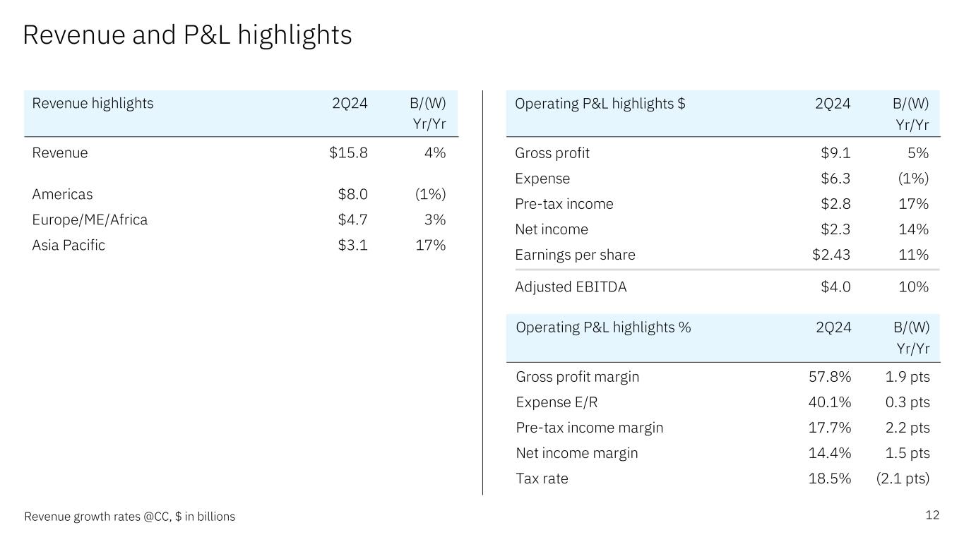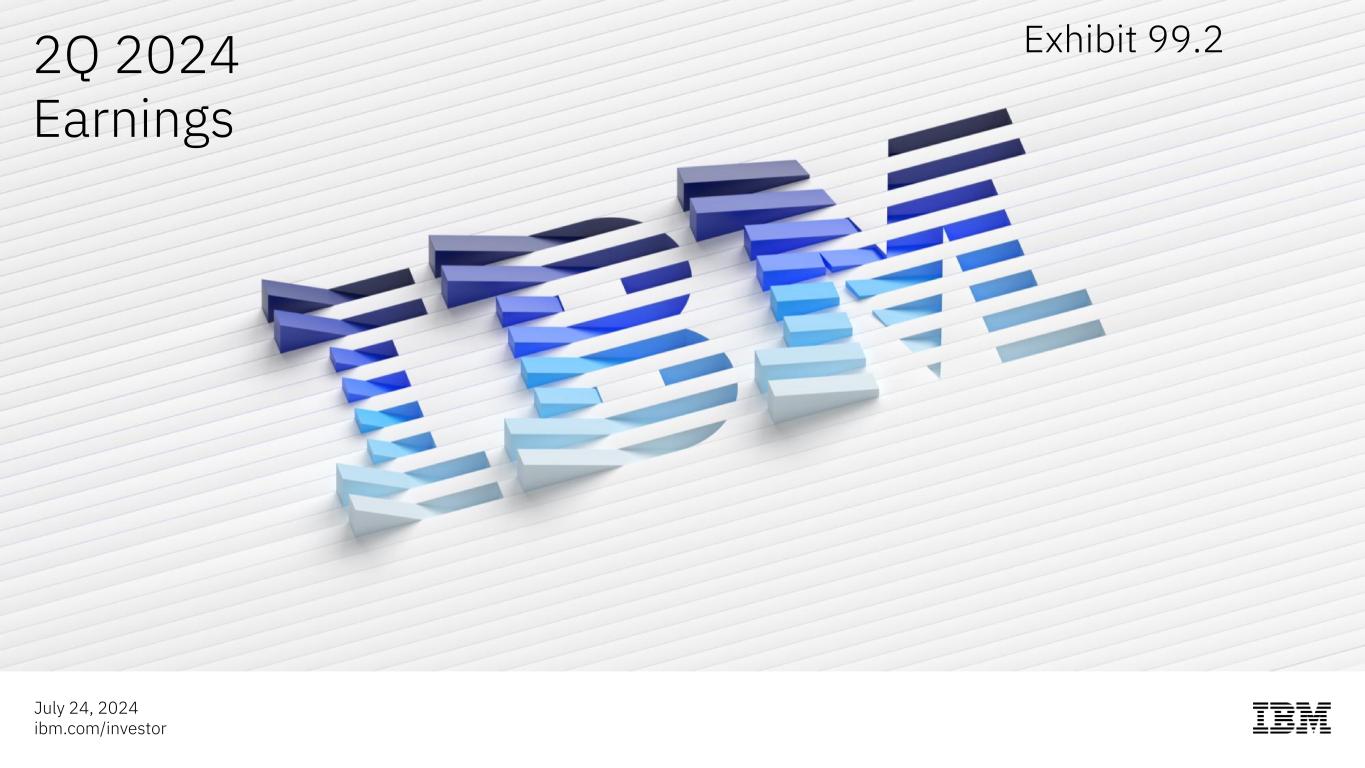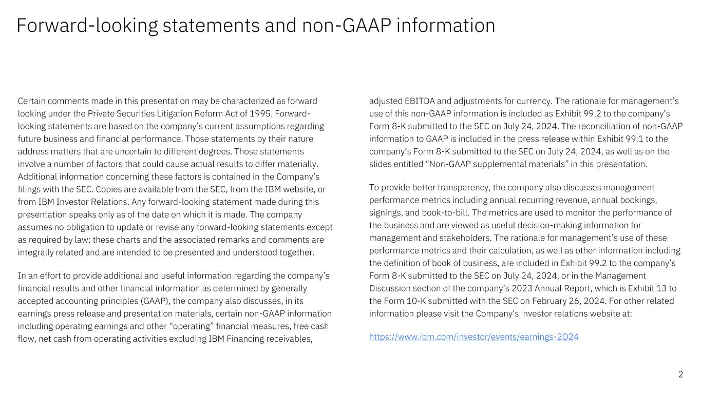 前瞻性陈述和非GAAP信息根据1995年《私人证券诉讼改革法案》,本演示文稿中的某些评论可能被定性为前瞻性。前瞻性陈述是基于公司目前对未来业务和财务业绩的假设。这些声明本质上涉及不同程度不确定的问题。这些声明涉及许多因素,可能导致实际结果出现重大差异。有关这些因素的更多信息包含在该公司提交给SEC的文件中。副本可从SEC、IBM网站或IBM投资者关系部获得。本演示文稿期间所做的任何前瞻性陈述仅代表其发表之日的情况。除法律要求外,公司不承担更新或修改任何前瞻性陈述的义务;这些图表以及相关的评论和评论是完整相关的,旨在一起呈现和理解。为了努力提供有关该公司财务业绩和其他根据公认会计原则(GAAP)确定的财务信息的额外有用信息,该公司还在其收益新闻稿和演示材料中讨论了某些非GAAP信息,包括营业收入和其他“经营”财务指标、自由现金流、经营活动产生的净现金(不包括IBM应收融资款)、调整后的EBITDA和货币调整。管理层使用这些非GAAP信息的理由作为附件 99.2包含在该公司于2024年7月24日提交给SEC的8-K表格中。非GAAP信息与GAAP的对账情况包含在该公司于2024年7月24日提交给SEC的8-K表格附件 99.1中的新闻稿中,以及本演示文稿中题为“非GAAP补充材料”的幻灯片中。为了提供更好的透明度,该公司还讨论了管理绩效指标,包括年度经常性收入、年度预订、签约和订单到账单。这些指标用于监测业务绩效,并被视为对管理层和利益相关者有用的决策信息。管理层使用这些绩效指标及其计算的理由,以及包括商业账簿定义在内的其他信息,均包含在公司于2024年7月24日提交给SEC的8-K表格的附件 99.2中,或公司2023年年度报告的管理层讨论部分,即2024年2月26日提交给SEC的10-K表格的附件 13中。其他相关信息请访问公司投资者关系网站:https://www.ibm.com/investor/events/earnings-2Q24 2
