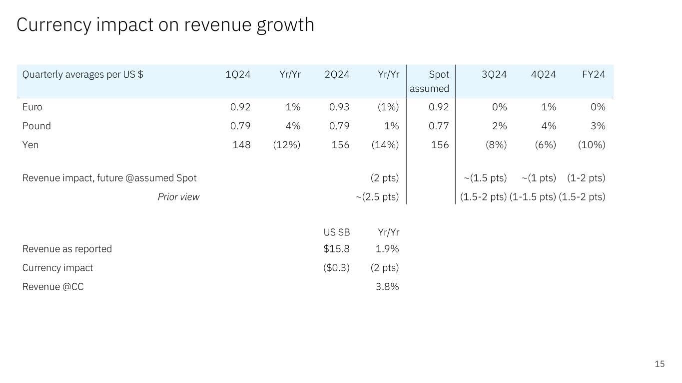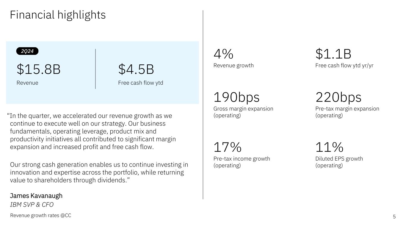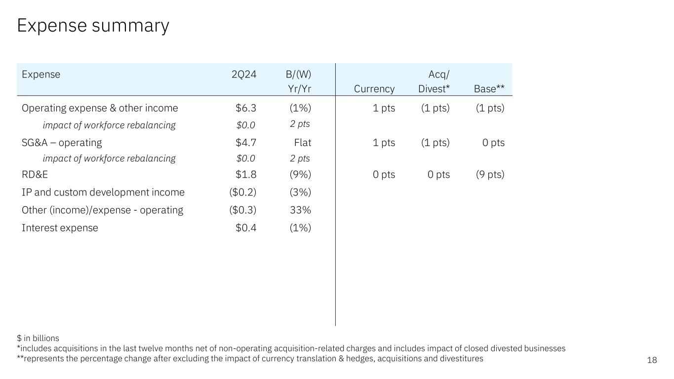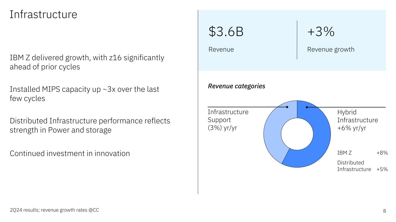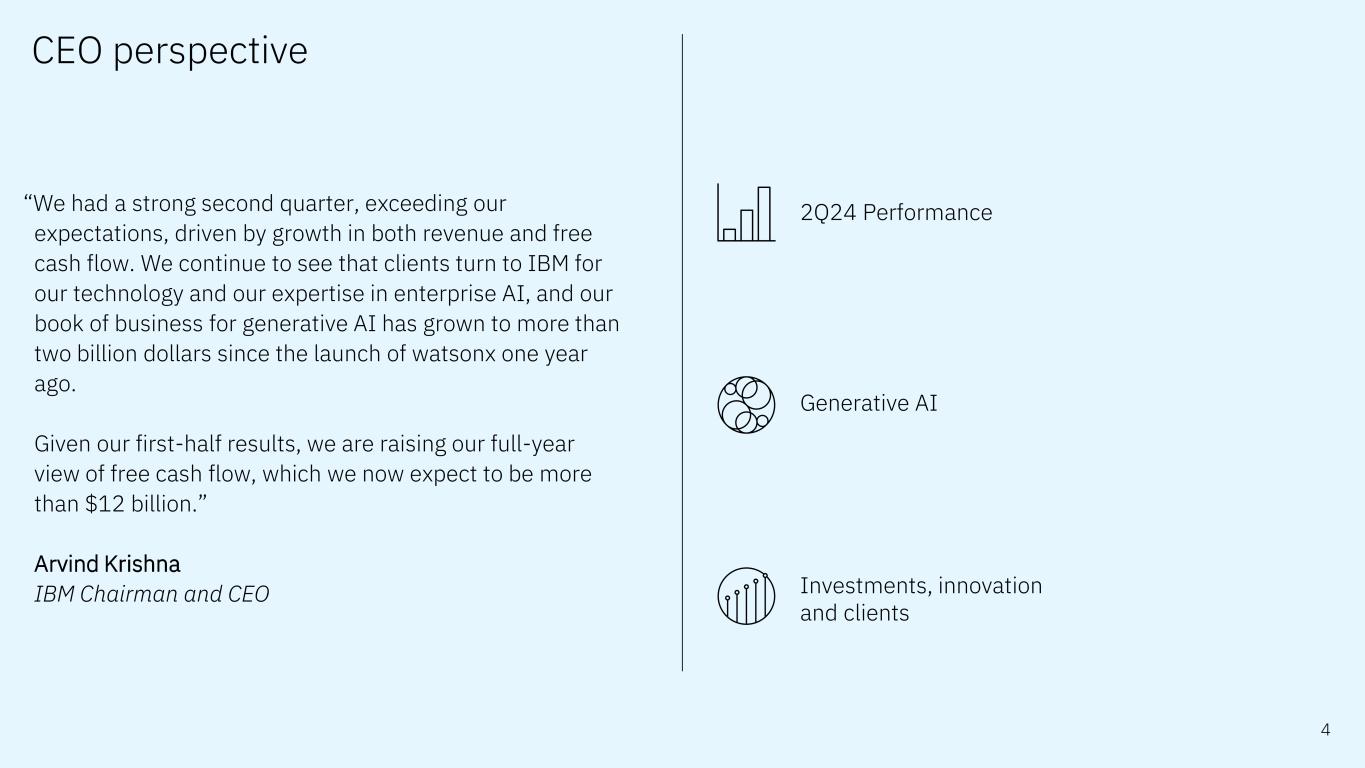 前瞻性陈述和非GAAP信息根据1995年《私人证券诉讼改革法案》,本演示文稿中的某些评论可能被定性为前瞻性。前瞻性陈述是基于公司目前对未来业务和财务业绩的假设。这些声明本质上涉及不同程度不确定的问题。这些声明涉及许多因素,可能导致实际结果出现重大差异。有关这些因素的更多信息包含在该公司提交给SEC的文件中。副本可从SEC、IBM网站或IBM投资者关系部获得。本演示文稿期间所做的任何前瞻性陈述仅代表其发表之日的情况。除法律要求外,公司不承担更新或修改任何前瞻性陈述的义务;这些图表以及相关的评论和评论是完整相关的,旨在一起呈现和理解。为了努力提供有关该公司财务业绩和其他根据公认会计原则(GAAP)确定的财务信息的额外有用信息,该公司还在其收益新闻稿和演示材料中讨论了某些非GAAP信息,包括营业收入和其他“经营”财务指标、自由现金流、经营活动产生的净现金(不包括IBM应收融资款)、调整后的EBITDA和货币调整。管理层使用这些非GAAP信息的理由作为附件 99.2包含在该公司于2024年7月24日提交给SEC的8-K表格中。非GAAP信息与GAAP的对账情况包含在该公司于2024年7月24日提交给SEC的8-K表格附件 99.1中的新闻稿中,以及本演示文稿中题为“非GAAP补充材料”的幻灯片中。为了提供更好的透明度,该公司还讨论了管理绩效指标,包括年度经常性收入、年度预订、签约和订单到账单。这些指标用于监测业务绩效,并被视为对管理层和利益相关者有用的决策信息。管理层使用这些绩效指标及其计算的理由,以及包括商业账簿定义在内的其他信息,均包含在公司于2024年7月24日提交给SEC的8-K表格的附件 99.2中,或公司2023年年度报告的管理层讨论部分,即2024年2月26日提交给SEC的10-K表格的附件 13中。其他相关信息请访问公司投资者关系网站:https://www.ibm.com/investor/events/earnings-2Q24 2