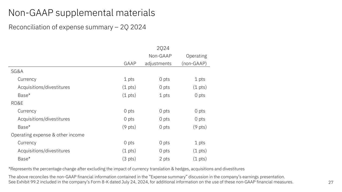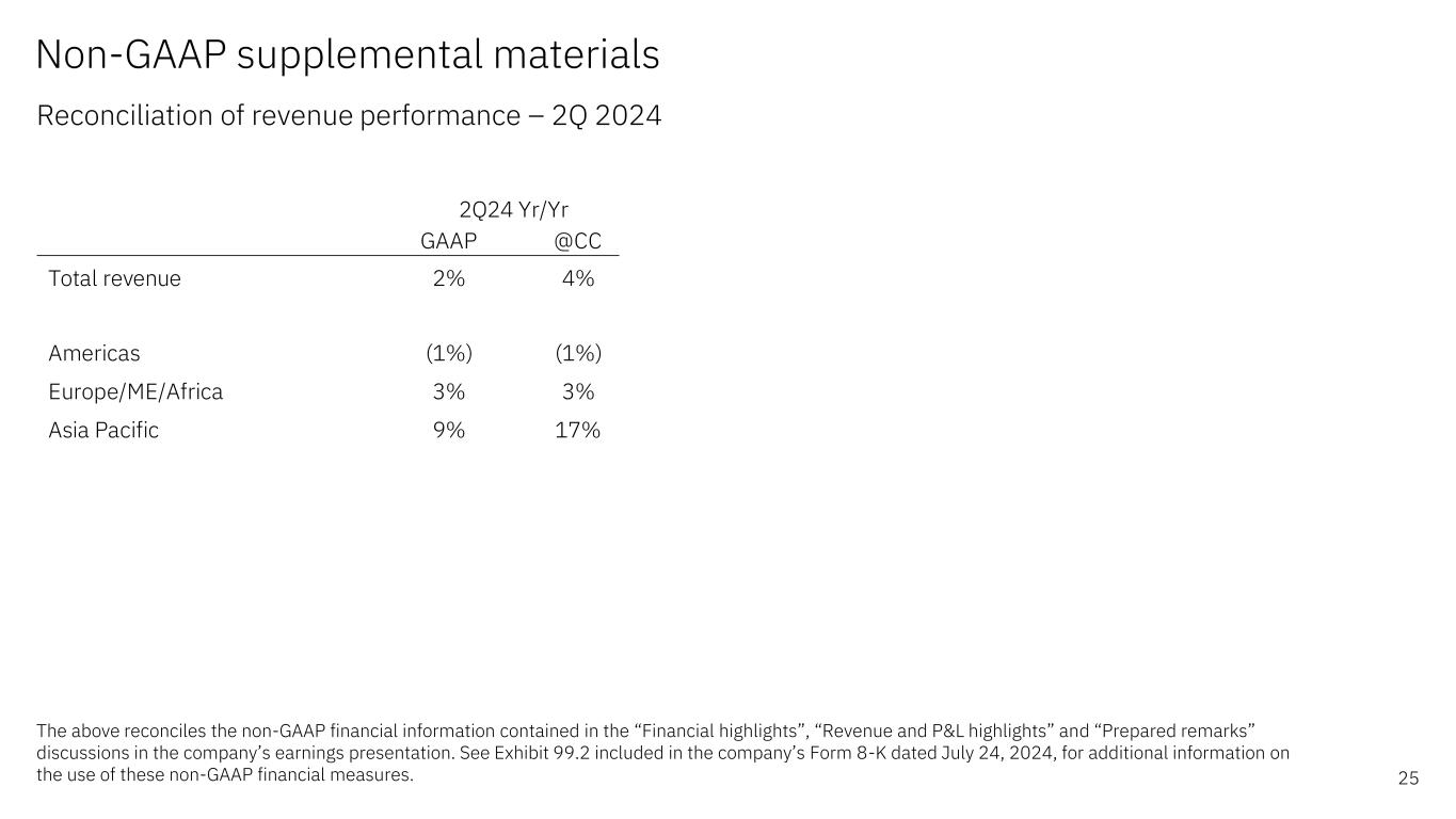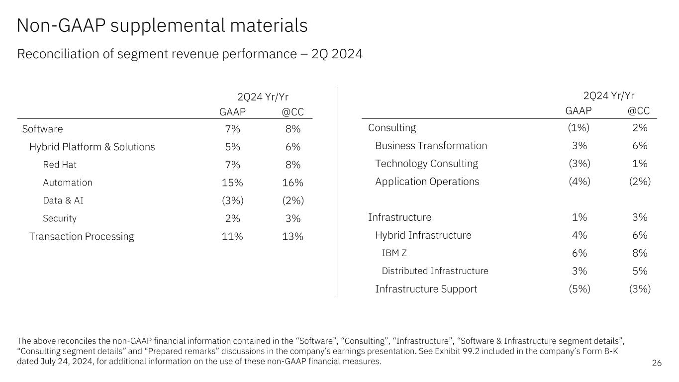 GAAP @ CC Software 7% 8% Hybrid Platform & Solutions 5% 6% 红帽 7% 8% Automation 15% 16% Data & AI(3%)(2%)Security 2% 3% Transaction Processing 11% 13% 2Q24 Yr/Yr GAAP @ CC Consulting(1%)2% Business Transformation 3% 6% Technology Consulting(3%)1% Application Operations(4%)(2%)Infrastructure 1% 3% Hybrid Infrastructure 4% 6% TERMZ6 % 8% Distributed Infrastructure 3% 5% Infrastructure Support(5%)(3%)2Q24 Yr/Yr Non-GAAP Supplementary Materials Reconciliation of Segment Revenue Performance – 2Q“软件和基础设施分部细节”、“咨询分部细节”和“准备好的评论”在公司的收益报告中进行了讨论。有关使用这些非公认会计准则财务指标的更多信息,请参见该公司2024年7月24日的8-K表格中包含的附件 99.2。
