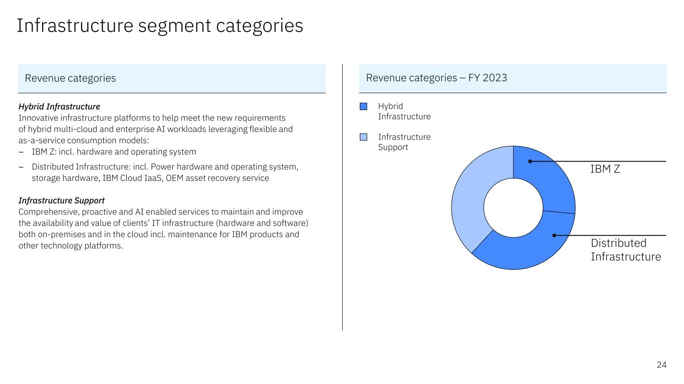 基础设施细分类别混合基础设施创新基础设施平台,帮助满足混合多云和利用灵活的即服务消费模式的企业AI工作负载的新要求:– IBM Z:包括硬件和操作系统–分布式基础设施:包括。power硬件和操作系统、存储硬件、IBM Cloud IaaS、OEM资产回收服务基础设施支持全面、主动和AI赋能的服务,以维护和提高客户端IT基础设施(硬件和软件)在本地和云端的可用性和价值,包括对IBM产品和其他技术平台的维护。混合基础设施支持收入类别– 2023财年24个收入类别IBM Z分布式基础设施