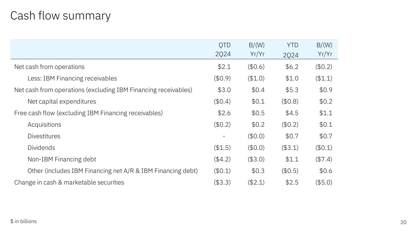现金流概要20美元十亿QTD B/(W)YTD B/(W)2Q24 YR/YR 2Q24 YR/YR来自运营的净现金$ 2.1($ 0.6)$ 6.2($ 0.2)减:IBM应收融资款($ 0.9)($ 1.0)$ 1.0($ 1.1)来自运营的净现金(不包括丨应收融资款)$ 3.0 $ 0.4 $ 5.3 $ 0.9净资本支出($ 0.4)$ 0.1($ 0.8)$ 0.2自由现金流(不包括应收IBM融资款)$ 2.6 $ 0.5 $ 4.5 $ 1.1收购($ 0.2)$ 0.2($ 0.2)$ 0.1资产剥离-($ 0.0)$ 0.7 $ 0.7股息($ 1.5)($ 0.0)($ 3.1)($ 0.1)非IBM融资债务($ 4.2)($ 3.0)$ 1.1有价证券(3.3美元)(2.1美元)2.5美元(5.0美元)