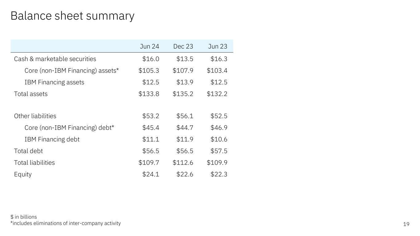 资产负债表摘要19十亿美元*包括冲销公司间活动6月24日12月23日现金和有价证券16.0美元13.5美元16.3美元核心(非IBM融资)资产* 105.3美元107.9美元103.4美元IBM融资资产12.5美元13.9美元12.5美元总资产133.8美元135.2美元132.2美元其他负债53.2美元56.1美元52.5美元核心(非IBM融资)债务* 45.4美元44.7美元46.9美元IBM融资债务11.1美元11.9美元10.6总债务56.5美元56.5美元57.5总负债109.7美元112.6美元109.9股权24.1美元22.6美元22.3美元