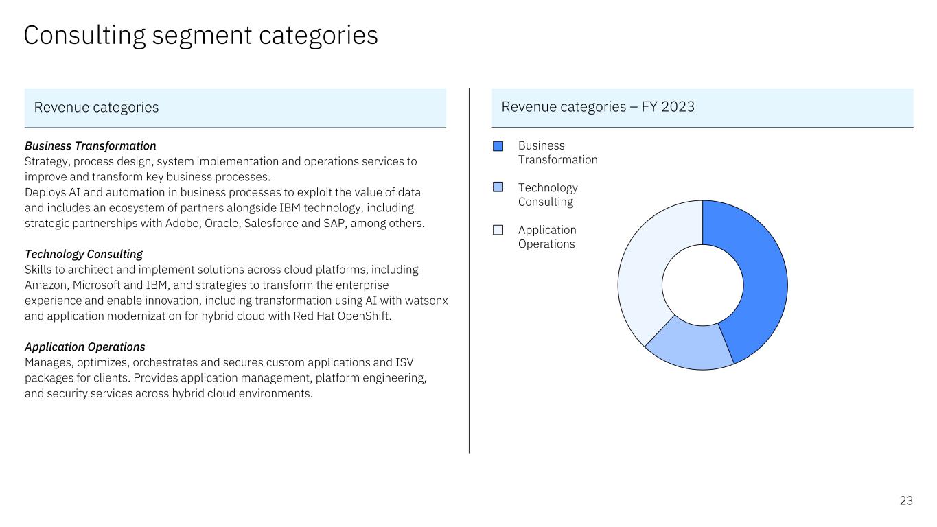 业务转型技术咨询应用运营咨询板块类别业务转型战略、流程设计、系统实施及运营服务完善改造关键业务流程。将人工智能和自动化部署在业务流程中,以利用数据的价值,其中包括与IBM技术一起的合作伙伴生态系统,包括与Adobe、Oracle、赛富时和SAP等建立战略合作伙伴关系。技术咨询技能,以构建和实施跨云平台的解决方案,包括亚马逊、微软和IBM,以及转变企业体验和支持创新的战略,包括使用带有watsonx的AI进行转型,以及使用带有红帽 OpenShift的混合云的应用程序现代化。应用程序运营为客户端管理、优化、编排和保护自定义应用程序和ISV包。提供跨混合云环境的应用程序管理、平台工程和安全服务。收入类别– 2023财年23收入类别