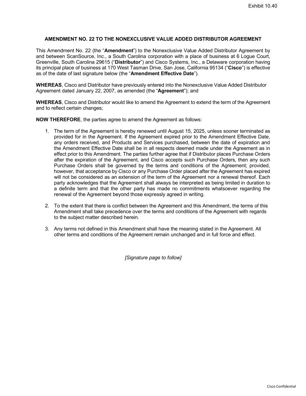 思科对非独家增值分销商协议的第22号机密修订这项对非独家增值分销商协议的第22号修订(“修订”)由营业地点为6 Logue Court,Greenville,South Carolina 29615的南卡罗来纳州公司数码扫描,Inc.与主要营业地点为170 West Tasman Drive,San Jose,California 95134(“思科”)的特拉华州公司思科公司(“Cisco”)之间的非独家增值分销商协议(“修订生效日期”)自以下最后一次签署之日起生效(“修订生效日期”)。鉴于思科与分销商先前已订立经修订的日期为2007年1月22日的非排他性增值分销商协议(“协议”);而鉴于思科与分销商希望修订协议以延长协议的期限并反映某些变化;因此,双方同意修订协议如下:1。本协议的期限特此延长至2025年8月15日,除非按照本协议的规定提前终止。如果协议在修订生效日期之前到期,则在到期日期和修订生效日期之间收到的任何订单以及购买的产品和服务在所有方面均应被视为根据本协议在本修订之前生效。双方进一步同意,如果分销商在协议到期后下达采购订单,而思科接受此类采购订单,则任何此类采购订单应受协议条款和条件的约束;但前提是,思科的接受或协议到期后下达的任何采购订单将不被视为协议期限的延长或续签。每一方均承认,协议应始终被解释为期限限制为一个确定的期限,并且另一方没有就续签协议作出任何超出书面明确约定的承诺。2.在本协议与本修正案之间存在冲突的情况下,本修正案的条款应优先于本协议中关于本协议所述标的的条款和条件。3.本修正案中未定义的任何术语应具有协议中所述的含义。该协议的所有其他条款和条件保持不变,并完全有效。[关注的签名页] 附件 10.40