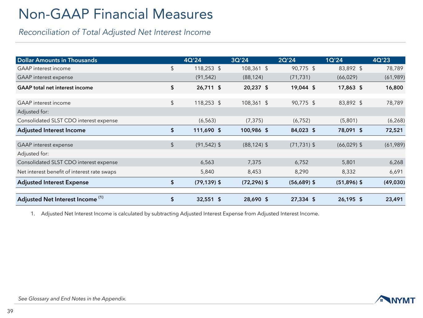 非美国通用会计准则财务措施调整后净利息收入总额的调节1。调整后净利息收入的计算方法是从调整后的利息收入中减去调整后的利息费用。以千美元计的金额Q4‘24 Q3’24 Q2‘24 Q1’24 Q4 ' 23 GAAP利息收入118,253美元108,361美元90,775美元83,892美元78,789美元GAAP利息支出(91,542)(88,124)(71,731)(66,029)(61,989)GAAP总净利息收入26,711美元20,237美元19,044美元17,863美元16,800美元GAAP利息收入118,253美元108,361美元90,775美元83,892美元78,789美元调整后:合并SLST CDO利息支出(6,563)(7,375)(6,752)(5,801)(6,268)调整后利息收入111,690美元100,986美元84,023美元78,SLST CDO利息支出6,5637,3756,7525,8016,268利率互换的净利息收益5,8408,4538,2908,3326,691调整后利息支出$(79,139)$(72,296)$(56,689)$(51,896)$(49,030)调整后净利息收入(1)$ 32,551 $ 28,690 $ 27,334 $ 26,195 $ 23,491见附录中的词汇表和结尾注。39
