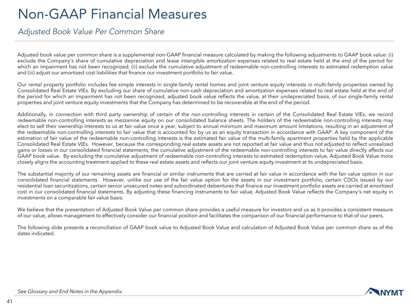 非GAAP财务指标调整后的每股普通股账面价值调整后的每股普通股账面价值是一种补充非GAAP财务指标,通过对GAAP账面价值进行以下调整计算得出:(i)不包括公司应占与期末持有的未确认减值的房地产相关的累计折旧和租赁无形摊销费用,(ii)不包括可赎回非控股权益对估计赎回价值的累计调整,以及(iii)将为我们的投资组合提供资金的摊余成本负债调整为公允价值。我们的出租物业组合包括单户出租房屋的收费简单权益和综合房地产VIE拥有的多户物业的合资股权。通过排除我们在期末持有的与未确认减值的房地产相关的累计非现金折旧和摊销费用的份额,调整后的账面价值反映了公司确定在期末可收回的我们的单户出租物业和合资企业股权投资的价值,按其未折旧基础计算。此外,就第三方拥有某些合并房地产VIE中的某些非控制性权益而言,我们将可赎回的非控制性权益作为夹层权益记录在我们的合并资产负债表中。可赎回非控股权益持有人可以选择每年一次以公允价值向我们出售其所有权权益,但须遵守年度最低和最高金额限制,从而导致可赎回非控股权益调整为公允价值,我们根据公认会计原则将其作为股权交易入账。可赎回非控股权益公允价值估计的一个关键组成部分是适用的综合房地产VIE持有的多户公寓物业的估计公允价值。然而,由于相应的房地产资产没有以公允价值报告,因此没有调整以在我们的合并财务报表中反映未实现的损益,因此将可赎回的非控股权益累计调整为公允价值直接影响我们的GAAP账面价值。通过排除可赎回非控股权益对估计赎回价值的累计调整,调整后的账面价值更紧密地与适用于这些房地产资产的会计处理保持一致,并以未折旧的基础反映我们的合资企业股权投资。我们剩余的大部分资产是根据我们综合财务报表中的公允价值选择权以公允价值列账的金融或类似工具。然而,与我们对投资组合中的资产使用公允价值期权不同,我们的住宅贷款证券化发行的某些CDO、为我们的投资组合资产提供资金的某些高级无抵押票据和次级债券在我们的综合财务报表中以摊余成本列示。通过将这些融资工具调整为公允价值,调整后的账面价值反映了公司在可比公允价值基础上的投资净权益。我们认为,调整后每股普通股账面价值的列报为投资者和我们提供了一个有用的衡量标准,因为它提供了对我们价值的一致衡量,使管理层能够有效考虑我们的财务状况,并有助于将我们的财务业绩与同行进行比较。下一张幻灯片展示了GAAP账面价值与调整后账面价值的对账,以及截至所示日期调整后每股普通股账面价值的计算。见附录中的词汇表和结尾注。41
