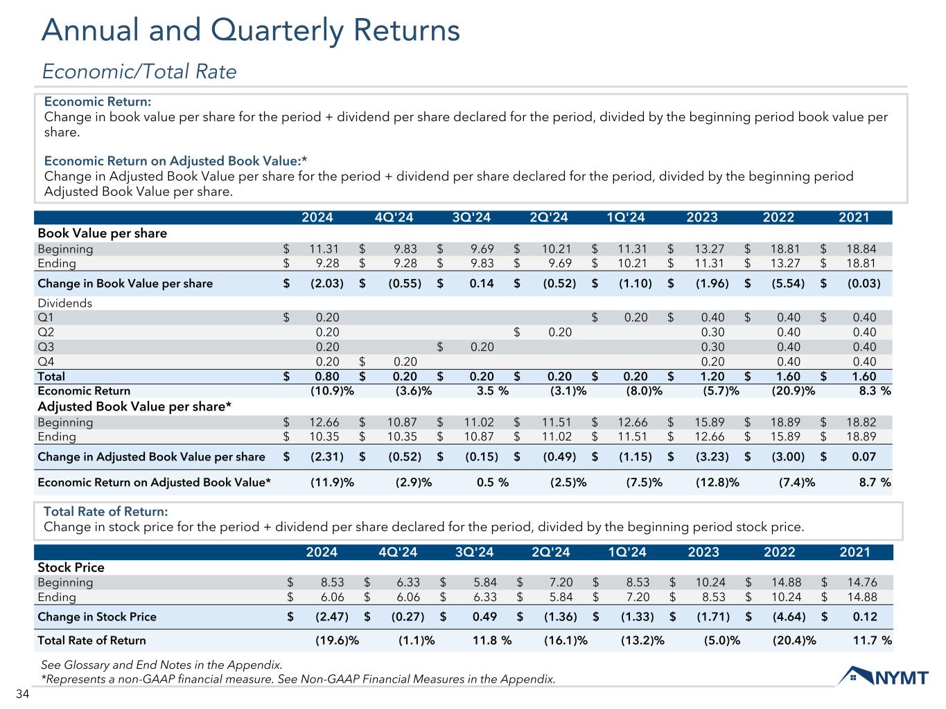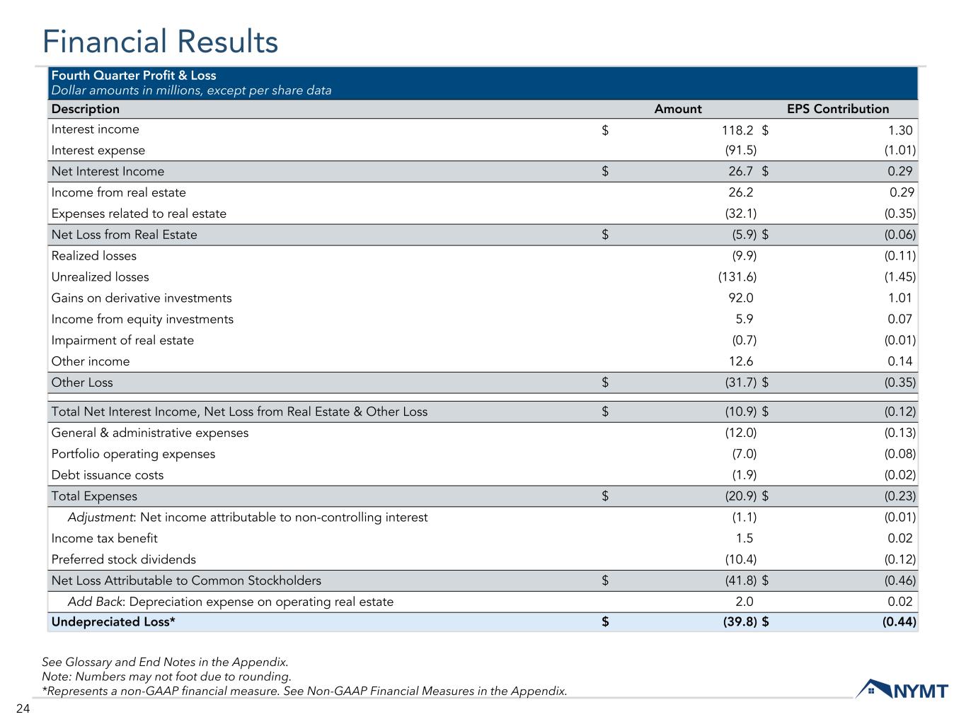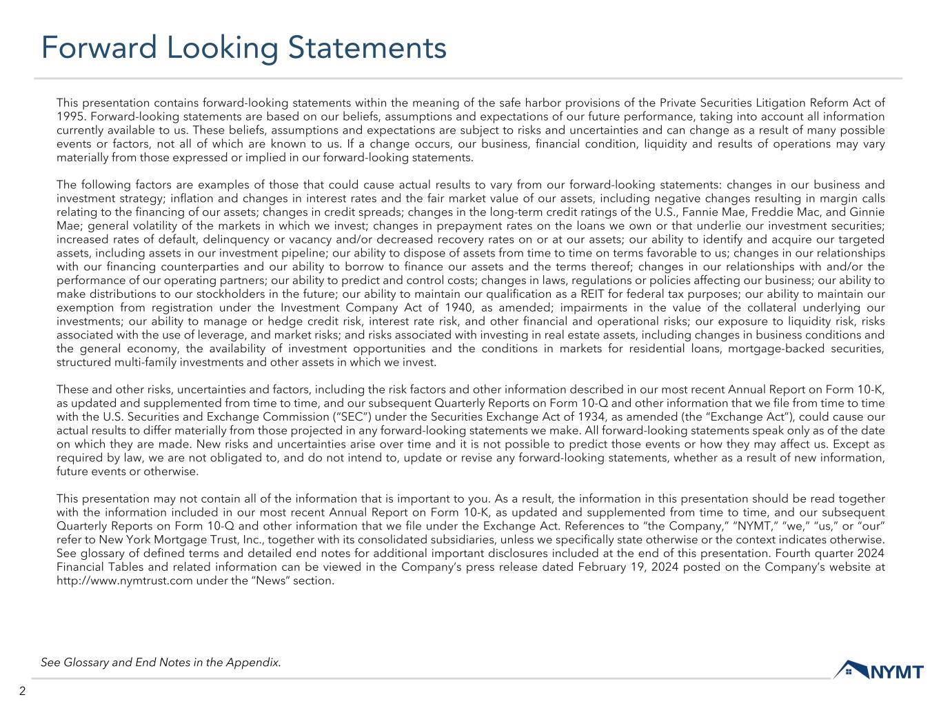 前瞻性陈述本演示文稿包含1995年《私人证券诉讼改革法案》安全港条款含义内的前瞻性陈述。前瞻性陈述基于我们对未来业绩的信念、假设和预期,并考虑到我们目前可获得的所有信息。这些信念、假设和期望受到风险和不确定性的影响,并可能因许多可能发生的事件或因素而发生变化,但并非所有这些都为我们所知。如果发生变化,我们的业务、财务状况、流动性和经营业绩可能与我们的前瞻性陈述中明示或暗示的内容存在重大差异。以下因素是可能导致实际结果与我们的前瞻性陈述不同的例子:我们的业务和投资策略的变化;通货膨胀和利率的变化以及我们资产的公平市场价值,包括导致与我们的资产融资相关的追加保证金的负面变化;信用利差的变化;美国、房利美、房地美的长期信用评级的变化,和Ginnie Mae;我们投资的市场普遍波动;我们拥有的贷款或作为我们投资证券基础的贷款的提前还款率变化;违约率、拖欠率或空置率增加和/或我们资产的回收率下降;我们识别和获取目标资产的能力,包括我们投资管道中的资产;我们不时以对我们有利的条款处置资产的能力;我们与融资对手方的关系的变化以及我们为资产融资的能力及其条款;我们与运营伙伴的关系和/或业绩的变化;我们预测和控制成本的能力;法律的变化,影响我们业务的法规或政策;我们未来向股东进行分配的能力;我们保持作为联邦税收目的的REIT资格的能力;我们保持根据经修订的1940年《投资公司法》免于注册的能力;我们投资基础抵押品的价值减值;我们管理或对冲信用风险、利率风险以及其他财务和运营风险的能力;我们面临的流动性风险、与使用杠杆相关的风险以及市场风险;以及与投资房地产资产相关的风险,包括商业条件和总体经济的变化、投资机会的可得性以及住宅贷款、抵押贷款支持证券、结构性多户家庭投资和我们投资的其他资产的市场条件。这些和其他风险、不确定性和因素,包括我们最近的10-K表格年度报告中描述的风险因素和其他信息(不时更新和补充),以及我们随后的10-Q表格季度报告和我们根据经修订的1934年证券交易法(“交易法”)不时向美国证券交易委员会(“SEC”)提交的其他信息,可能会导致我们的实际结果与我们所做的任何前瞻性陈述中预测的结果存在重大差异。所有前瞻性陈述仅在作出之日发表。新的风险和不确定性随着时间的推移而出现,无法预测这些事件或它们可能如何影响我们。除法律要求外,我们没有义务、也不打算更新或修改任何前瞻性陈述,无论是由于新信息、未来事件或其他原因。此演示文稿可能不包含对您很重要的所有信息。因此,本演示文稿中的信息应与我们最近的10-K表格年度报告中包含的信息(不时更新和补充)以及我们随后的10-Q表格季度报告和我们根据《交易法》提交的其他信息一起阅读。凡提及“公司”、“NYMT”、“我们”、“我们”或“我们的”,均指纽约抵押信托股份有限公司及其合并子公司,除非我们另有特别说明或上下文另有说明。有关本演示文稿末尾包含的其他重要披露,请参阅定义术语词汇表和详细的结尾注。2024年第四季度财务表格和相关信息可在公司网站http://www.nymtrust.com的“新闻”部分下的日期为2024年2月19日的公司新闻稿中查看。见附录中的词汇表和结尾注。2
