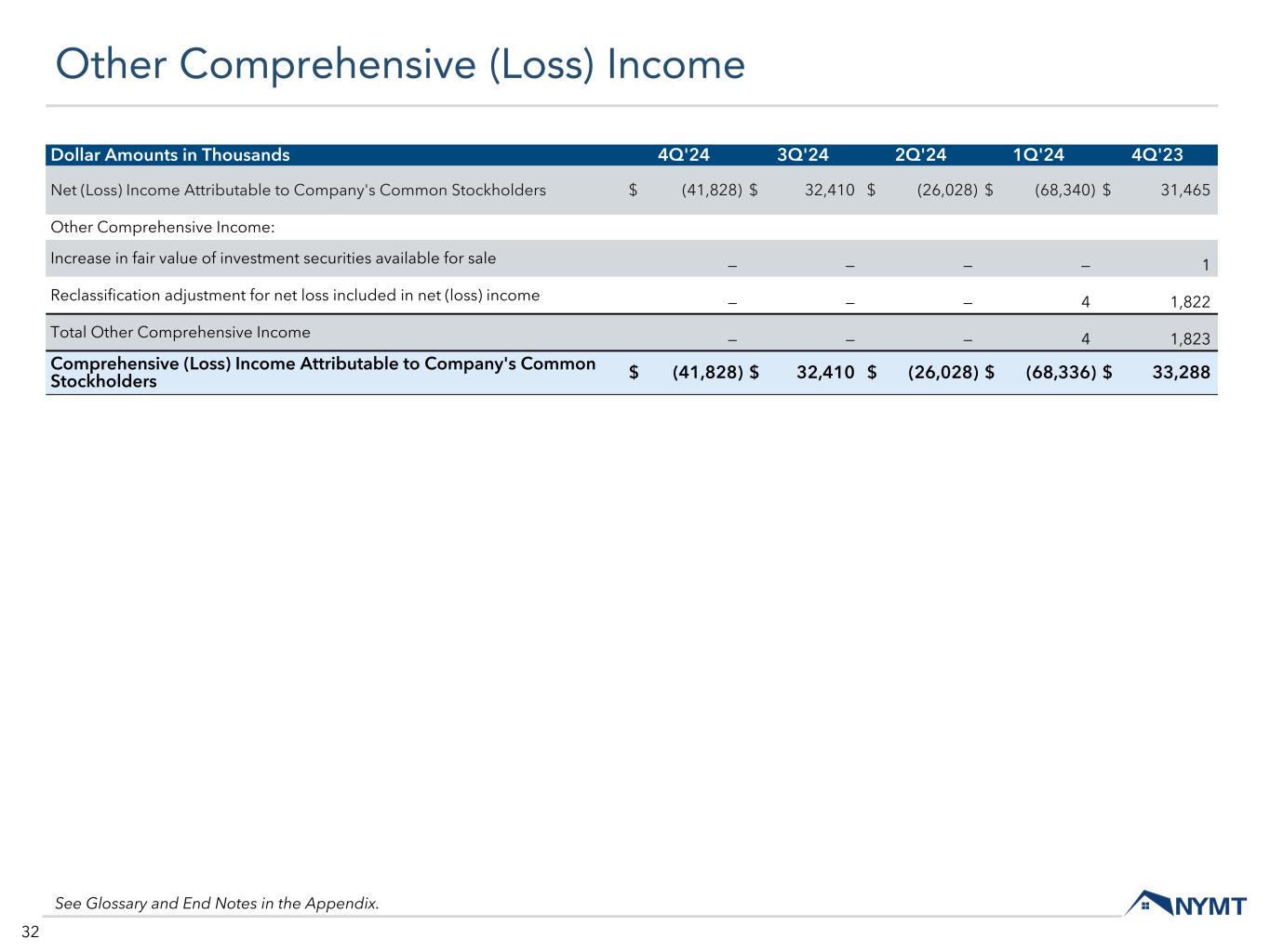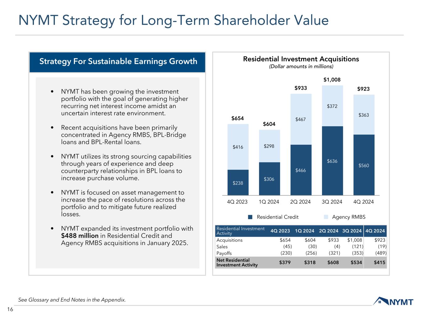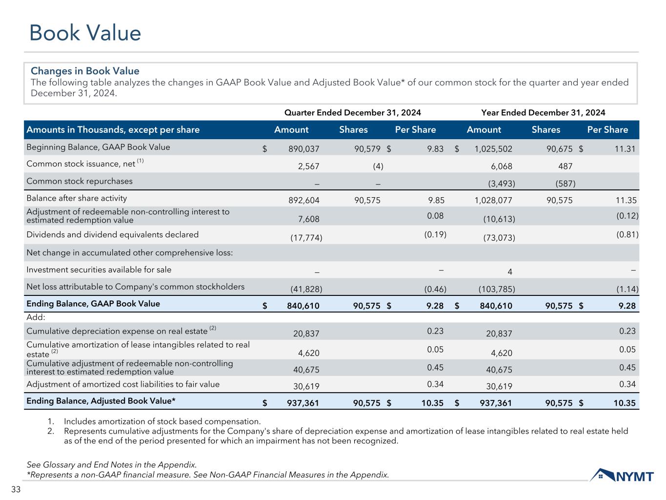 前瞻性陈述本演示文稿包含1995年《私人证券诉讼改革法案》安全港条款含义内的前瞻性陈述。前瞻性陈述基于我们对未来业绩的信念、假设和预期,并考虑到我们目前可获得的所有信息。这些信念、假设和期望受到风险和不确定性的影响,并可能因许多可能发生的事件或因素而发生变化,但并非所有这些都为我们所知。如果发生变化,我们的业务、财务状况、流动性和经营业绩可能与我们的前瞻性陈述中明示或暗示的内容存在重大差异。以下因素是可能导致实际结果与我们的前瞻性陈述不同的例子:我们的业务和投资策略的变化;通货膨胀和利率的变化以及我们资产的公平市场价值,包括导致与我们的资产融资相关的追加保证金的负面变化;信用利差的变化;美国、房利美、房地美的长期信用评级的变化,和Ginnie Mae;我们投资的市场普遍波动;我们拥有的贷款或作为我们投资证券基础的贷款的提前还款率变化;违约率、拖欠率或空置率增加和/或我们资产的回收率下降;我们识别和获取目标资产的能力,包括我们投资管道中的资产;我们不时以对我们有利的条款处置资产的能力;我们与融资对手方的关系的变化以及我们为资产融资的能力及其条款;我们与运营伙伴的关系和/或业绩的变化;我们预测和控制成本的能力;法律的变化,影响我们业务的法规或政策;我们未来向股东进行分配的能力;我们保持作为联邦税收目的的REIT资格的能力;我们保持根据经修订的1940年《投资公司法》免于注册的能力;我们投资基础抵押品的价值减值;我们管理或对冲信用风险、利率风险以及其他财务和运营风险的能力;我们面临的流动性风险、与使用杠杆相关的风险以及市场风险;以及与投资房地产资产相关的风险,包括商业条件和总体经济的变化、投资机会的可得性以及住宅贷款、抵押贷款支持证券、结构性多户家庭投资和我们投资的其他资产的市场条件。这些和其他风险、不确定性和因素,包括我们最近的10-K表格年度报告中描述的风险因素和其他信息(不时更新和补充),以及我们随后的10-Q表格季度报告和我们根据经修订的1934年证券交易法(“交易法”)不时向美国证券交易委员会(“SEC”)提交的其他信息,可能会导致我们的实际结果与我们所做的任何前瞻性陈述中预测的结果存在重大差异。所有前瞻性陈述仅在作出之日发表。新的风险和不确定性随着时间的推移而出现,无法预测这些事件或它们可能如何影响我们。除法律要求外,我们没有义务、也不打算更新或修改任何前瞻性陈述,无论是由于新信息、未来事件或其他原因。此演示文稿可能不包含对您很重要的所有信息。因此,本演示文稿中的信息应与我们最近的10-K表格年度报告中包含的信息(不时更新和补充)以及我们随后的10-Q表格季度报告和我们根据《交易法》提交的其他信息一起阅读。凡提及“公司”、“NYMT”、“我们”、“我们”或“我们的”,均指纽约抵押信托股份有限公司及其合并子公司,除非我们另有特别说明或上下文另有说明。有关本演示文稿末尾包含的其他重要披露,请参阅定义术语词汇表和详细的结尾注。2024年第四季度财务表格和相关信息可在公司网站http://www.nymtrust.com的“新闻”部分下的日期为2024年2月19日的公司新闻稿中查看。见附录中的词汇表和结尾注。2