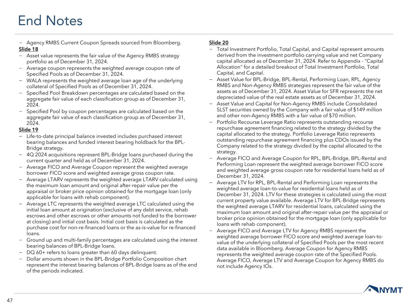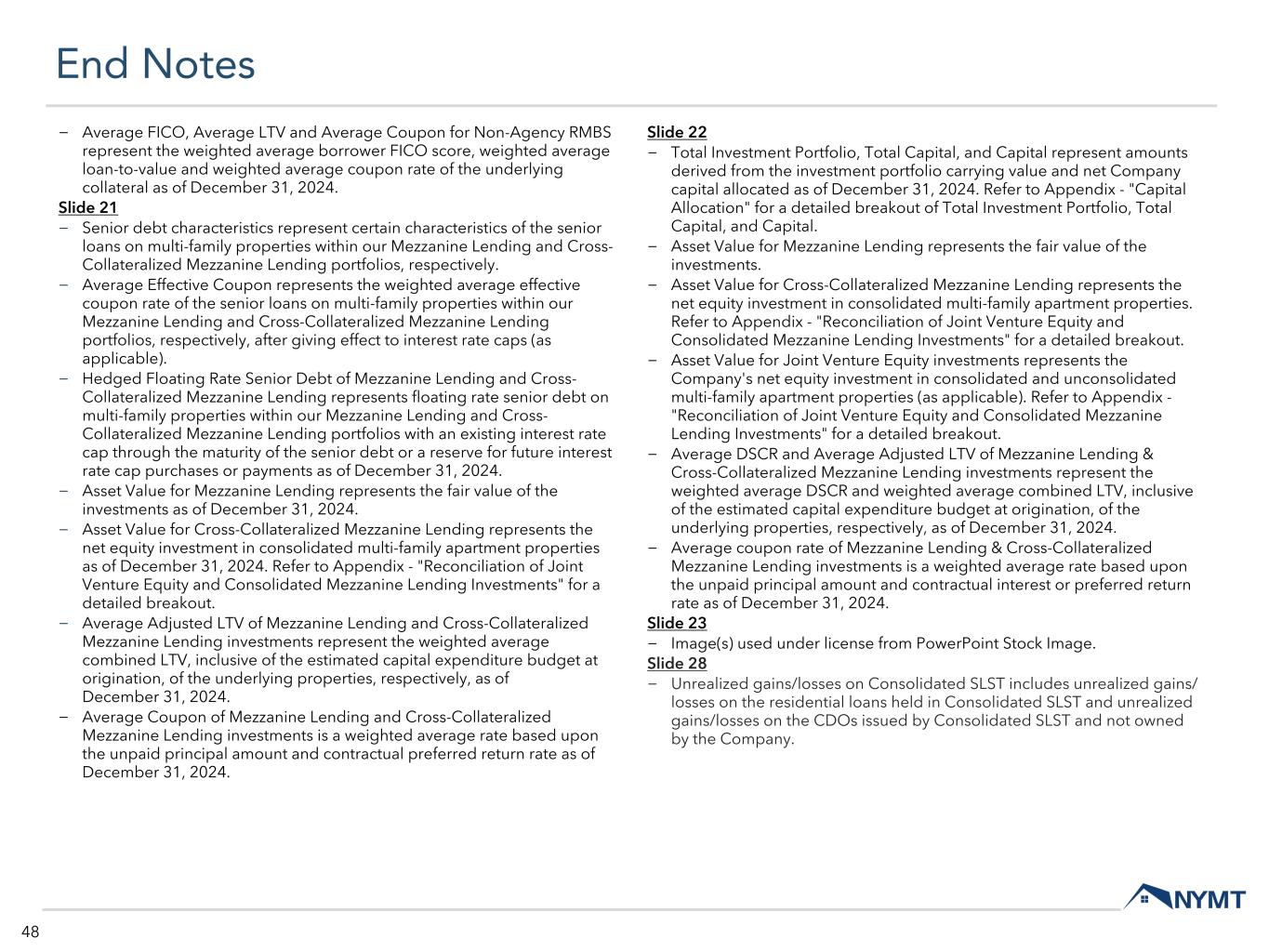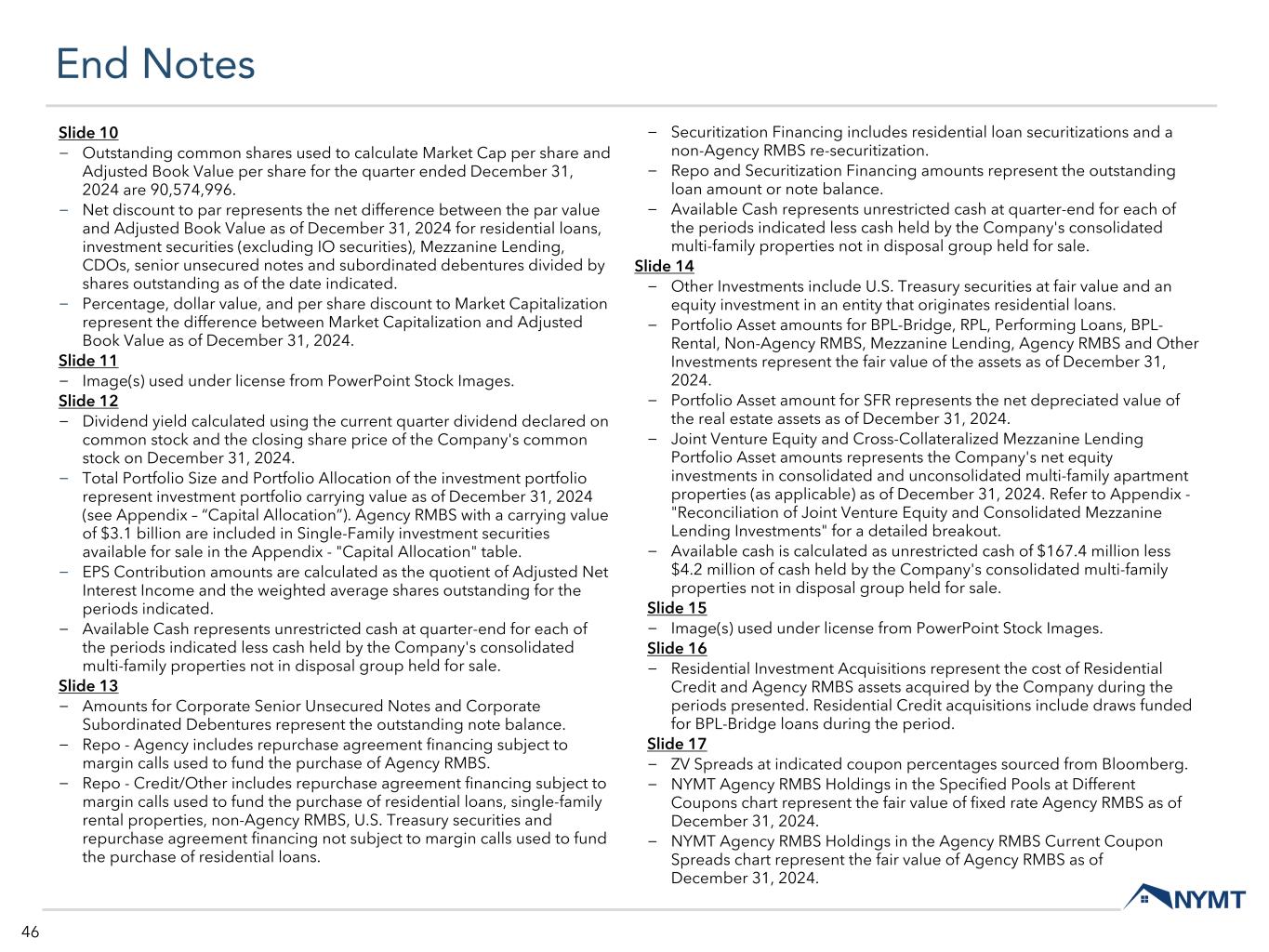 尾注46 −证券化融资包括住宅贷款证券化和一种非机构的RMBS再证券化。−回购和证券化融资金额代表未偿还贷款金额或票据余额。−可用现金指在所示各期间的季度末未受限制的现金减去公司未在处置组中持有待售的综合多户物业持有的现金。幻灯片14 −其他投资包括按公允价值计算的美国国债和对发起住宅贷款的实体的股权投资。−投资组合BPL-Bridge、RPL、Performing Loans、BPL-Rental、非机构RMBS、夹层贷款、机构RMBS和其他投资的资产金额代表截至2024年12月31日资产的公允价值。− SFR的Portfolio Asset金额表示截至2024年12月31日的房地产资产折旧净值。−合资股权和交叉抵押夹层贷款组合资产金额代表公司截至2024年12月31日对合并和未合并多户公寓物业(如适用)的净股权投资。详见附录-《合资公司股权与合并夹层借贷投资的对账》详细分拆。−可用现金计算为1.674亿美元的非限制性现金减去公司未在处置组中的待售综合多户物业持有的420万美元现金。幻灯片15 −图片(s)经许可使用,来自PowerPoint股票图片。幻灯片16 −住宅投资收购代表公司在所述期间收购的住宅信贷和代理RMBS资产的成本。住宅信贷收购包括在此期间为BPL-Bridge贷款提供资金的提款。幻灯片17 − ZV利差以指示的票息百分比来源彭博。− NYMT各机构在不同票息图下在规定池中的RMBS持有量代表截至2024年12月31日固定利率机构RMBS的公允价值。− NYMT各机构RMBS在各机构RMBS当前券种价差走势图中的RMBS持有量代表截至2024年12月31日各机构TERM3的公允价值。幻灯片10 −用于计算截至2024年12月31日的季度每股市值和调整后每股账面价值的已发行普通股为90,574,996股。−较面值的净折让表示截至2024年12月31日住宅贷款、投资证券(不包括IO证券)、夹层借贷、CDO、高级无抵押票据和次级债券的面值与调整后账面价值之间的净差额除以截至所示日期的已发行股份。−百分比、美元价值和每股市值折让代表截至2024年12月31日市值与调整后账面价值之间的差额。幻灯片11 −图像(s)根据PowerPoint股票图像的许可使用。幻灯片12 −股息收益率使用普通股宣布的当前季度股息和公司普通股2024年12月31日的收盘股价计算得出。−投资组合的总投资组合规模和投资组合分配代表截至2024年12月31日的投资组合账面价值(见附录–“资本分配”)。账面价值为31亿美元的代理RMBS包含在附录-“资本分配”表中可供出售的单户投资证券中。− EPS贡献金额计算为所示期间的调整后净利息收入和加权平均已发行股份的商。−可用现金指在所示各期间的季度末未受限制的现金减去公司不在处置组中的持有待售的综合多户物业持有的现金。公司优先无抵押票据和公司次级债券的幻灯片13 −金额代表未偿票据余额。−回购-代理包括以追加保证金为条件的回购协议融资,用于为代理购买RMBS提供资金。− Repo-Credit/Other包括用于为购买住宅贷款提供资金的受追加保证金限制的回购协议融资、单户出租物业、非代理RMBS、美国国债和不受追加保证金限制的回购协议融资,用于为购买住宅贷款提供资金。