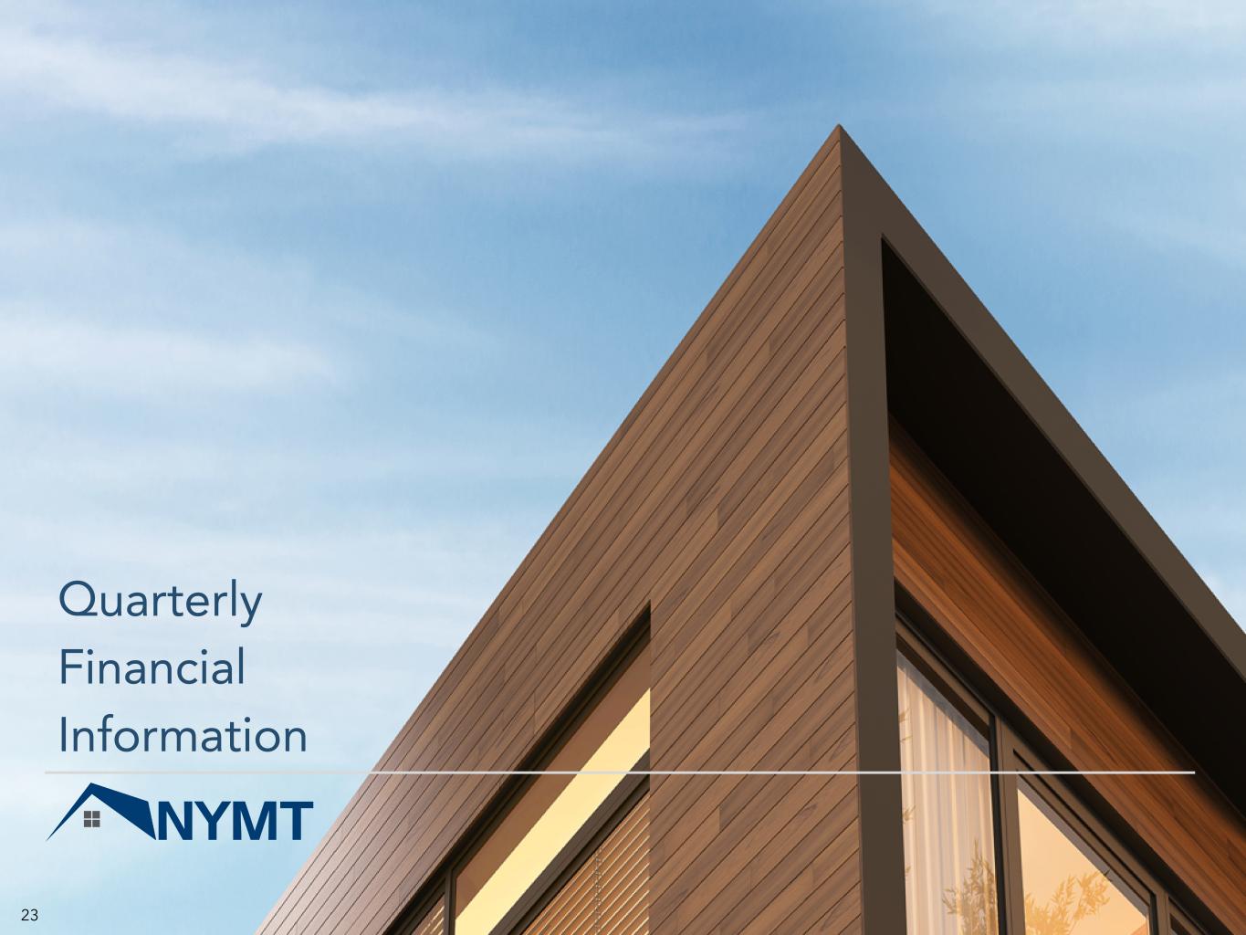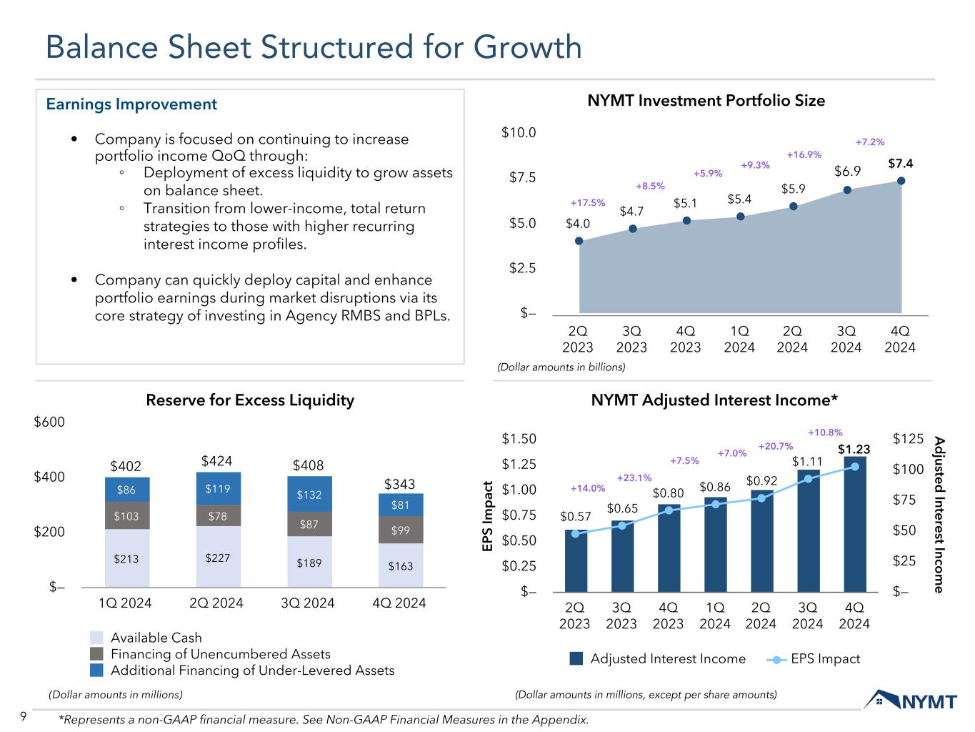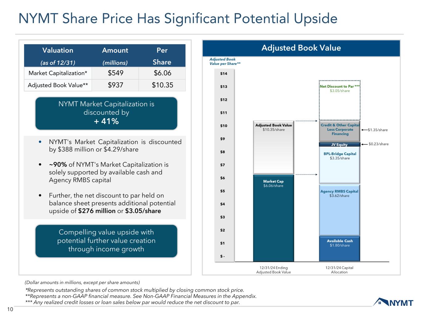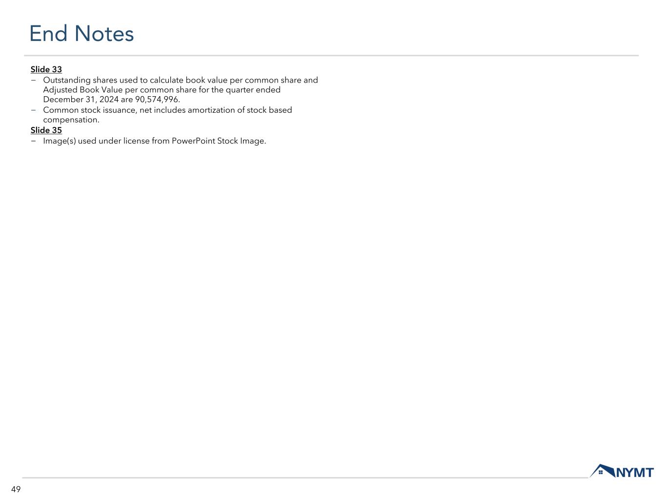 尾注46 −证券化融资包括住宅贷款证券化和一种非机构的RMBS再证券化。−回购和证券化融资金额代表未偿还贷款金额或票据余额。−可用现金指在所示各期间的季度末未受限制的现金减去公司未在处置组中持有待售的综合多户物业持有的现金。幻灯片14 −其他投资包括按公允价值计算的美国国债和对发起住宅贷款的实体的股权投资。−投资组合BPL-Bridge、RPL、Performing Loans、BPL-Rental、非机构RMBS、夹层贷款、机构RMBS和其他投资的资产金额代表截至2024年12月31日资产的公允价值。− SFR的Portfolio Asset金额表示截至2024年12月31日的房地产资产折旧净值。−合资股权和交叉抵押夹层贷款组合资产金额代表公司截至2024年12月31日对合并和未合并多户公寓物业(如适用)的净股权投资。详见附录-《合资公司股权与合并夹层借贷投资的对账》详细分拆。−可用现金计算为1.674亿美元的非限制性现金减去公司未在处置组中的待售综合多户物业持有的420万美元现金。幻灯片15 −图片(s)经许可使用,来自PowerPoint股票图片。幻灯片16 −住宅投资收购代表公司在所述期间收购的住宅信贷和代理RMBS资产的成本。住宅信贷收购包括在此期间为BPL-Bridge贷款提供资金的提款。幻灯片17 − ZV利差以指示的票息百分比来源彭博。− NYMT各机构在不同票息图下在规定池中的RMBS持有量代表截至2024年12月31日固定利率机构RMBS的公允价值。− NYMT各机构RMBS在各机构RMBS当前券种价差走势图中的RMBS持有量代表截至2024年12月31日各机构TERM3的公允价值。幻灯片10 −用于计算截至2024年12月31日的季度每股市值和调整后每股账面价值的已发行普通股为90,574,996股。−较面值的净折让表示截至2024年12月31日住宅贷款、投资证券(不包括IO证券)、夹层借贷、CDO、高级无抵押票据和次级债券的面值与调整后账面价值之间的净差额除以截至所示日期的已发行股份。−百分比、美元价值和每股市值折让代表截至2024年12月31日市值与调整后账面价值之间的差额。幻灯片11 −图像(s)根据PowerPoint股票图像的许可使用。幻灯片12 −股息收益率使用普通股宣布的当前季度股息和公司普通股2024年12月31日的收盘股价计算得出。−投资组合的总投资组合规模和投资组合分配代表截至2024年12月31日的投资组合账面价值(见附录–“资本分配”)。账面价值为31亿美元的代理RMBS包含在附录-“资本分配”表中可供出售的单户投资证券中。− EPS贡献金额计算为所示期间的调整后净利息收入和加权平均已发行股份的商。−可用现金指在所示各期间的季度末未受限制的现金减去公司不在处置组中的持有待售的综合多户物业持有的现金。公司优先无抵押票据和公司次级债券的幻灯片13 −金额代表未偿票据余额。−回购-代理包括以追加保证金为条件的回购协议融资,用于为代理购买RMBS提供资金。− Repo-Credit/Other包括用于为购买住宅贷款提供资金的受追加保证金限制的回购协议融资、单户出租物业、非代理RMBS、美国国债和不受追加保证金限制的回购协议融资,用于为购买住宅贷款提供资金。