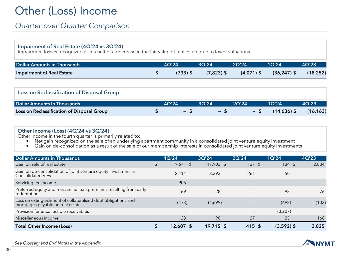 衍生工具其他(亏损)收入季度环比比较收益(亏损),净额(4Q‘24 vs 3Q’24)第四季度衍生工具投资净收益主要与:•利率上升导致利率掉期未实现收益•利率掉期结算已实现收益美元金额以千计4Q‘24 3Q’24 2Q‘24 1Q’24 4Q'23衍生工具未实现收益(亏损)$ 89,638 $(56,282)$ 5,509 $ 45,034 $(63,927)衍生工具已实现收益(亏损)2,316(4,358)9,9624,177(655)衍生工具总收益(亏损),净额91,954美元(60,640)15,471美元49,211美元(64,582)见附录中的词汇表和结尾注。29股权投资收入(亏损)(4Q‘24 vs 3Q’24)第四季度股权投资收入主要涉及:•由于持续盈利能力和公允价值增加,对产生住宅贷款的实体的股权投资确认的收入和未实现收益•我们的优先股权投资确认的优先回报以千美元计4Q‘24 3Q’24 2Q‘24 1Q’24 4Q'23优先股权投资的优先回报计入权益$ 2,334 $ 3,401 $ 3,522 $ 3,517 $ 4,485未实现收益(亏损),计入权益的优先股投资净额367(4,537)(778)86317多户物业未合并合资股权投资收入(亏损)104(421)(15)(4,050)647来自产生住宅贷款的实体的收入(亏损)3,1807,6113,379(1,689)3,113股权投资总收入(亏损)$ 5,985 $ 6,054 $ 6,108 $(2,136)$ 8,562