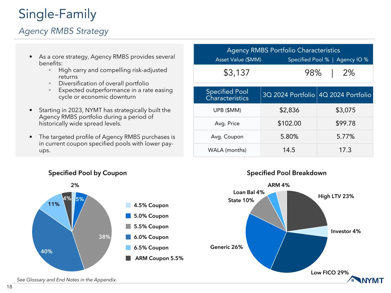 单户机构RMBS市场•本季度,活期券抵押贷款利差扩大6bps至135bps,因市场对2025年美联储降息路径存在不确定性。•本季度,NYMT战略性地增加了对代理机构RMBS的购买,以利用更大的价差。•代理RMBS仍然是核心投资重点,我们预计该组合将持续增长。17息票(%)N Y M T A G en cy R M B S($ M)Z V SP read(b p)NYMT机构RMBS控股市场ZV价差收购ZV价差2.0 2.5 3.0 3.54.04.55.05.56.06.57.005001,0001,0001,50005050100150200不同息票的特定池见附录中的词汇表和尾注。M illio ns机构RMBS当前券利差