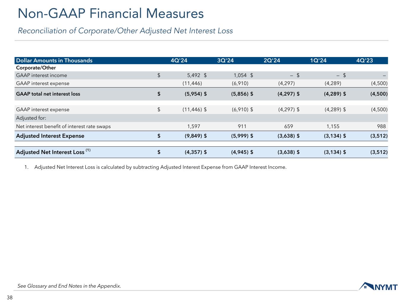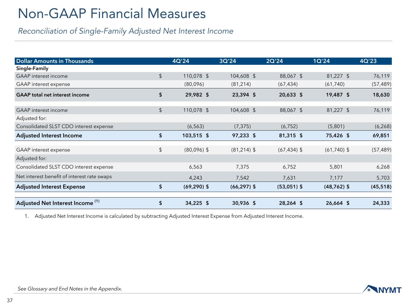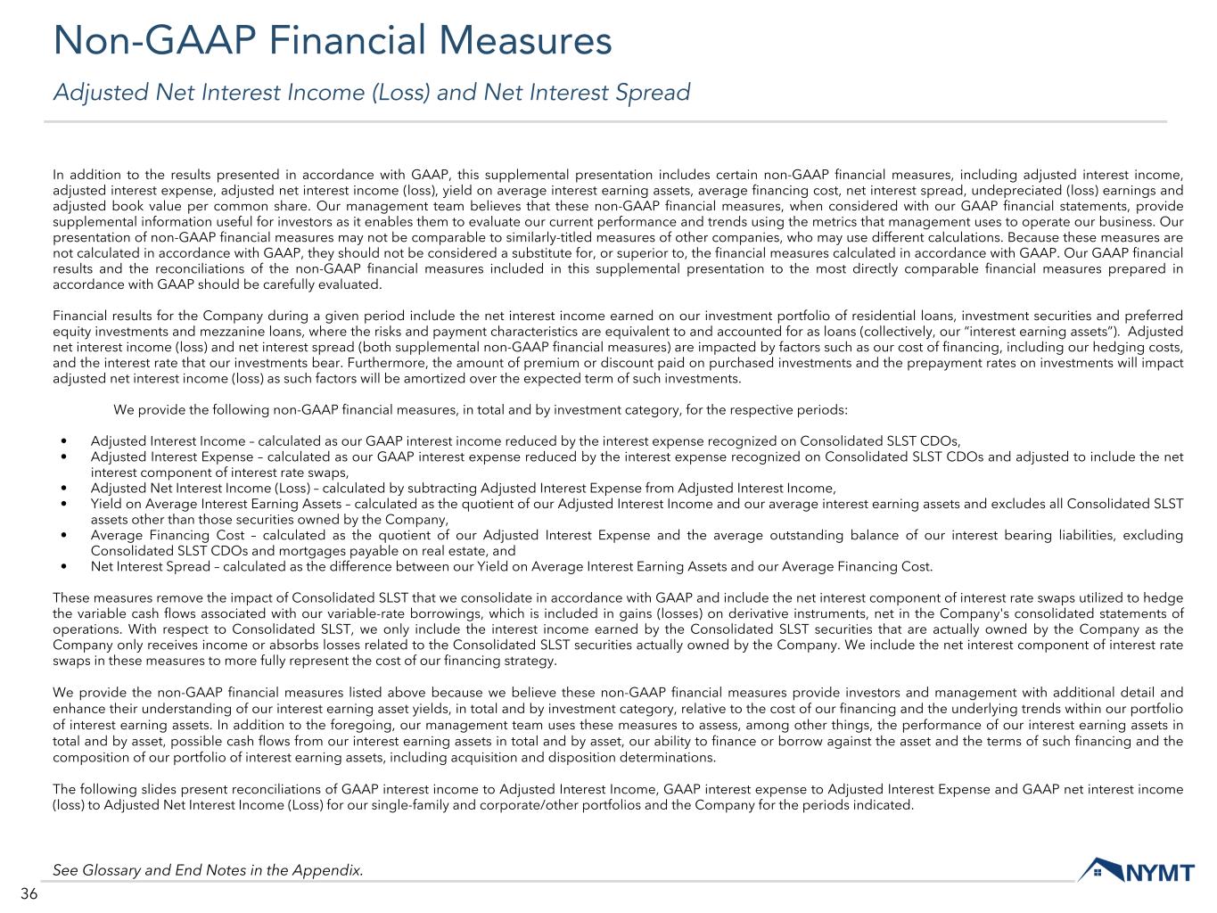 非GAAP财务指标调整后的净利息收入(亏损)和净利差除了根据GAAP列报的结果外,本补充报表还包括某些非GAAP财务指标,包括调整后的利息收入、调整后的利息费用、调整后的净利息收入(亏损)、平均生息资产收益率、平均融资成本、净利差、未折旧(亏损)收益和调整后的每股普通股账面价值。我们的管理团队认为,当与我们的GAAP财务报表一起考虑时,这些非GAAP财务指标提供了对投资者有用的补充信息,因为它使他们能够使用管理层用于运营我们业务的指标来评估我们当前的业绩和趋势。我们对非GAAP财务指标的表述可能无法与其他公司的类似名称的指标进行比较,后者可能会使用不同的计算方法。由于这些计量不是按照公认会计原则计算的,因此不应被视为替代或优于按照公认会计原则计算的财务计量。我们的GAAP财务业绩以及本补充演示文稿中包含的非GAAP财务指标与根据GAAP编制的最直接可比财务指标的对账应进行仔细评估。公司在特定时期的财务业绩包括我们的住宅贷款、投资证券和优先股投资以及夹层贷款投资组合所赚取的净利息收入,其中风险和支付特征与贷款(统称为我们的“生息资产”)相当并作为贷款入账。调整后的净利息收入(亏损)和净利差(均为补充的非公认会计准则财务指标)受到我们的融资成本(包括我们的对冲成本)以及我们的投资所承担的利率等因素的影响。此外,就购买的投资支付的溢价或折价金额以及投资的提前还款率将影响调整后的净利息收入(亏损),因为这些因素将在此类投资的预期期限内摊销。我们提供了相应期间的以下非GAAP财务指标,按总额和投资类别分列:•调整后利息收入——计算方式为我们的GAAP利息收入减去合并SLST CDO确认的利息费用,•调整后利息费用——计算方式为我们的GAAP利息费用减去合并SLST CDO确认的利息费用,并调整为包括利率互换的净利息部分;•调整后净利息收入(亏损)——计算方式为从调整后利息收入中减去调整后的利息费用,•平均生息资产收益率–计算为我们调整后的利息收入和我们的平均生息资产的商,不包括公司拥有的证券以外的所有合并SLST资产,•平均融资成本–计算为我们调整后的利息费用和我们有息负债的平均未偿余额的商,不包括合并SLST CDO和房地产应付抵押贷款,以及•净利差–计算为我们的平均生息资产收益率与我们的平均融资成本之间的差额。这些措施消除了我们根据公认会计原则合并的合并SLST的影响,并包括用于对冲与我们的可变利率借款相关的可变现金流的利率掉期的净利息部分,该部分包含在衍生工具的收益(损失)中,净额在公司的合并经营报表中。关于合并SLST,我们仅将公司实际拥有的合并SLST证券赚取的利息收入计入为公司仅获得与公司实际拥有的合并SLST证券相关的收入或吸收损失。我们将利率互换的净利息部分包括在这些措施中,以更全面地代表我们融资策略的成本。我们提供上面列出的非GAAP财务指标是因为我们认为这些非GAAP财务指标为投资者和管理层提供了额外的细节,并增强了他们对我们的生息资产收益率的理解,总体上和按投资类别,相对于我们的融资成本和我们生息资产组合中的基本趋势。除上述情况外,我们的管理团队使用这些措施来评估(其中包括)我们的生息资产的总表现和按资产分类的表现,我们的生息资产可能产生的总现金流和按资产分类的现金流,我们针对该资产进行融资或借款的能力以及此类融资的条款以及我们的生息资产组合的构成, 包括收购和处置决定。以下幻灯片展示了我们的单户家庭和公司/其他投资组合以及公司在所示期间的GAAP利息收入与调整后利息收入、GAAP利息支出与调整后利息费用以及GAAP净利息收入(亏损)与调整后净利息收入(亏损)的对账。见附录中的词汇表和结尾注。36