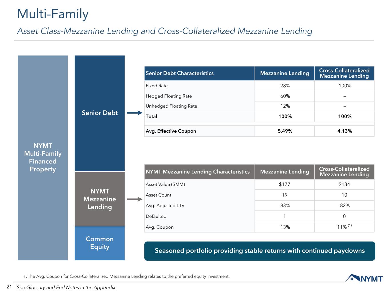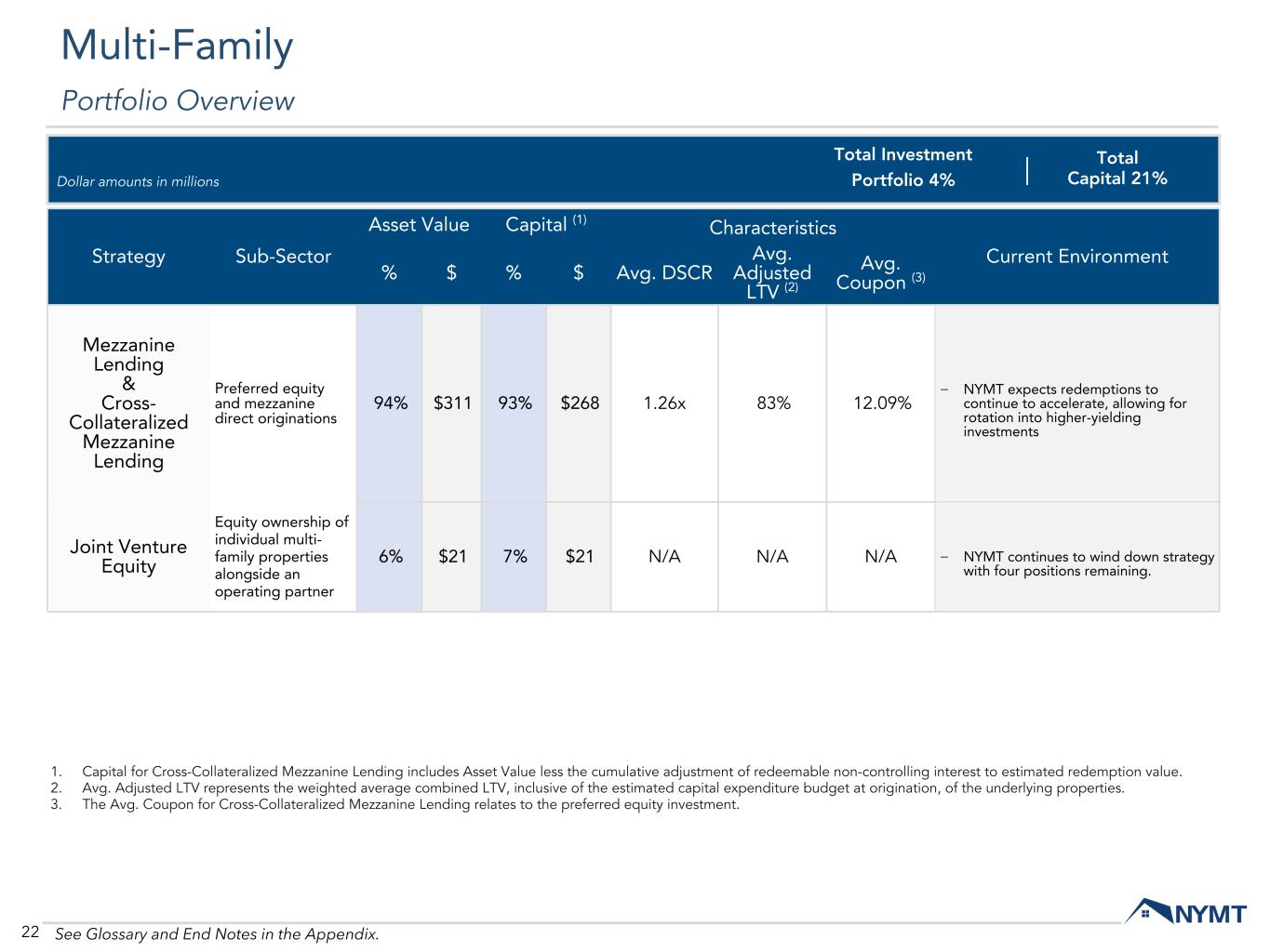 见附录中的词汇表和结尾注。21多户资产类别-夹层借贷和交叉抵押夹层借贷1。平均。交叉抵押夹层贷款的息票涉及优先股权投资。高级债项NYMT夹层借贷普通股权NYMT多户家庭融资物业NYMT夹层借贷特征夹层借贷交叉抵押夹层借贷资产价值(百万美元)177美元134美元资产计数1910平均。调整后LTV 83% 82%违约10平均。票息13% 11%(1)优先债务特征夹层借贷交叉抵押夹层借贷固定利率28% 100%对冲浮利率60% —未对冲浮利率12% —合计100% 100%平均。有效票息5.49% 4.13%季度性组合提供持续回报的稳定回报