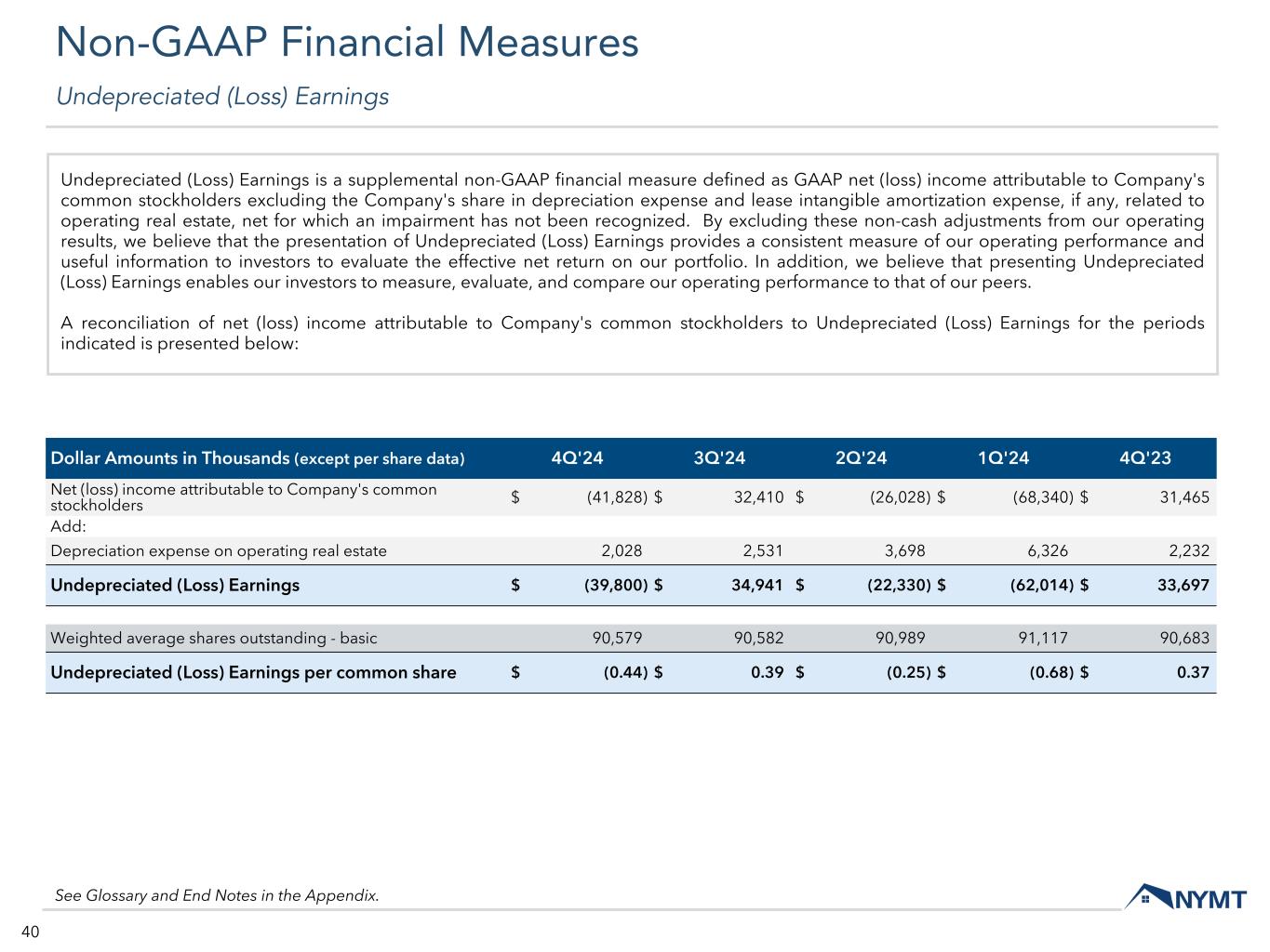 非GAAP财务指标未折旧(亏损)收益未折旧(亏损)收益是一种补充性非GAAP财务指标,定义为归属于公司普通股股东的GAAP净(亏损)收入,不包括公司在折旧费用和租赁无形摊销费用中所占的份额(如果有的话),与经营性房地产相关,未确认减值的净额。通过从我们的经营业绩中排除这些非现金调整,我们认为,未折旧(亏损)收益的列报提供了我们经营业绩的一致衡量标准,并为投资者评估我们投资组合的有效净回报提供了有用的信息。此外,我们认为,列报未折旧(亏损)收益使我们的投资者能够衡量、评估并将我们的经营业绩与同行进行比较。归属于公司普通股股东的净(亏损)收入与未折旧(亏损)收益的对账所示期间的美元金额如下:千美元(每股数据除外)Q4‘24 Q3’24 Q2‘24 Q1’24 Q4 ' 23归属于公司普通股股东的净(亏损)收入$(41,828)$ 32,410 $(26,028)$(68,340)$ 31,465加:经营房地产折旧费用2,0282,5313,6986,3262,232未折旧(亏损)收益$(39,800)$ 34,941 $(22,330)$(62,014)$ 33,697加权平均流通股-基本90,57990,58290,98991,11790,683每普通股未折旧(亏损)收益$(0.44)$ 0.39 $(0.25)$(0.68)$ 0.37见附录中的词汇表和结尾注。40
