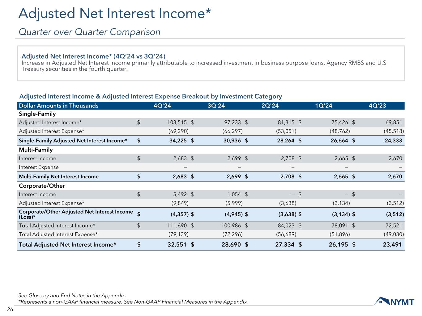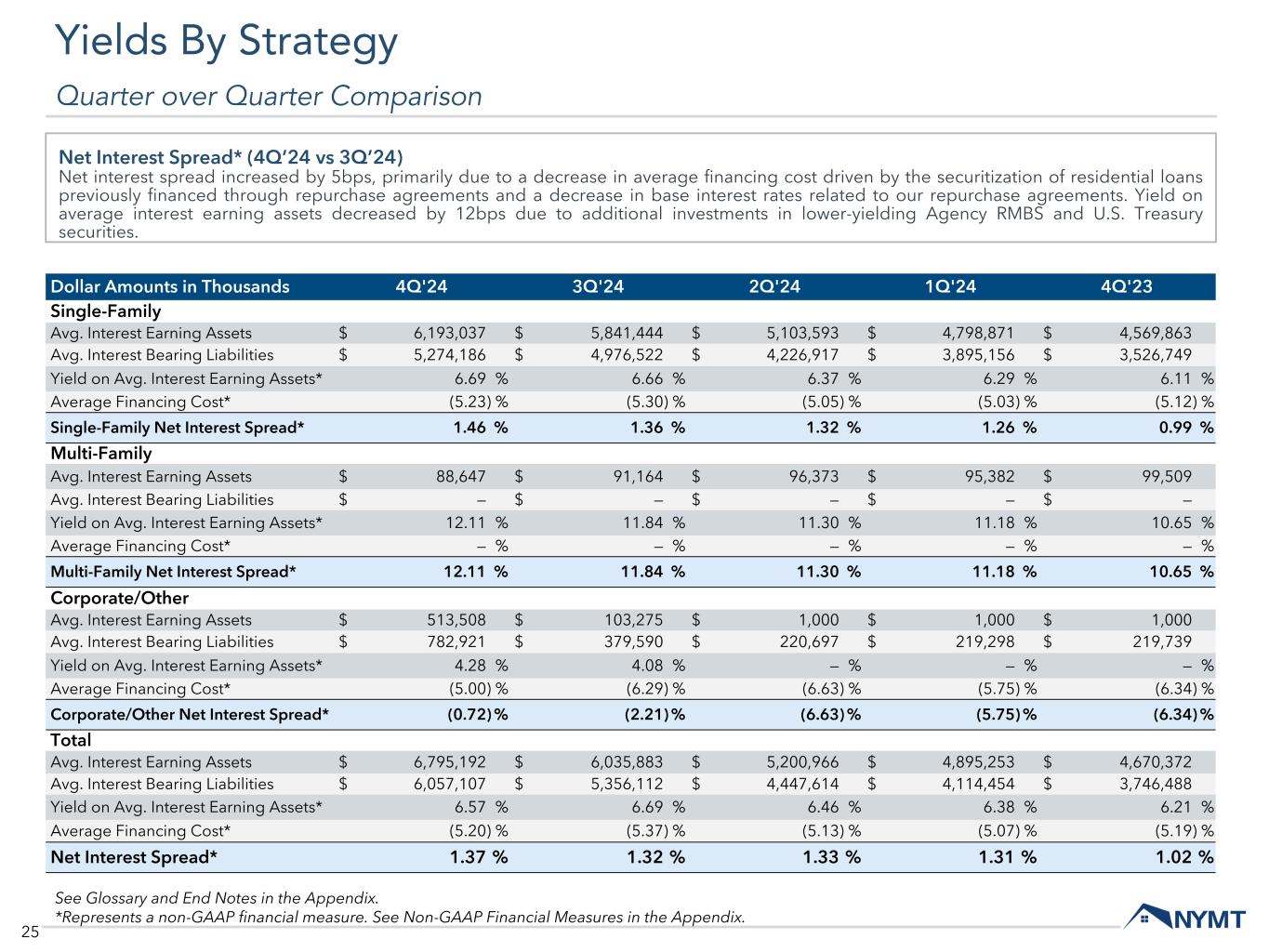 按策略划分的收益率季度对比净息差*(Q4’24 vs Q3’24)净利差增加5bps,主要是由于此前通过回购协议融资的住宅贷款证券化推动平均融资成本下降,以及与我们的回购协议相关的基础利率下降。平均生息资产收益率下降12bps,原因是对收益较低的机构RMBS和美国国债进行了额外投资。见附录中的词汇表和结尾注。*表示非GAAP财务指标。见附录中的非GAAP财务指标。千美元金额Q4‘24 Q3’24 Q2‘24 Q1’24 Q4 ' 23单户平均生息资产$ 6,193,037 $ 5,841,444 $ 5,103,593 $ 4,798,871 $ 4,569,863平均。有息负债$ 5,274,186 $ 4,976,522 $ 4,226,917 $ 3,895,156 $ 3,526,749平均收益率。生息资产*6.69% 6.66% 6.37% 6.29% 6.11%平均融资成本*(5.23)%(5.30)%(5.05)%(5.03)%(5.12)%单户净利差*1.46% 1.36% 1.32% 1.26% 0.99%多户平均生息资产$ 88,647 $ 91,164 $ 96,373 $ 95,382 $ 99,509平均。计息负债$ — $ — $ — $ —平均收益率。生息资产*12.11% 11.84% 11.30% 11.18% 10.65%平均融资成本*——% ——% ——% ——% ——%多户净息差*12.11% 11.84% 11.30% 11.18% 10.65%公司/其他平均生息资产$ 513,508 $ 103,275 $ 1,000 $ 1,000 $ 1,000平均计息负债782,921美元379,590美元220,697美元219,298美元219,739美元平均收益率。生息资产*4.28% 4.08% —% —% —%平均融资成本*(5.00)%(6.29)%(6.63)%(5.75)%(6.34)%企业/其他净利差*(0.72)%(2.21)%(6.63)%(5.75)%(6.34)%总平均生息资产$ 6,795,192 $ 6,035,883 $ 5,200,966 $ 4,895,253 $ 4,670,372平均。计息负债$ 6,057,107 $ 5,356,112 $ 4,447,614 $ 4,114,454 $ 3,746,488平均收益率。生息资产*6.57% 6.69% 6.46% 6.38% 6.21%平均融资成本*(5.20)%(5.37)%(5.13)%(5.07)%(5.19)%净利差*1.37 % 1.32 % 1.33 % 1.31 % 1.02 % 25