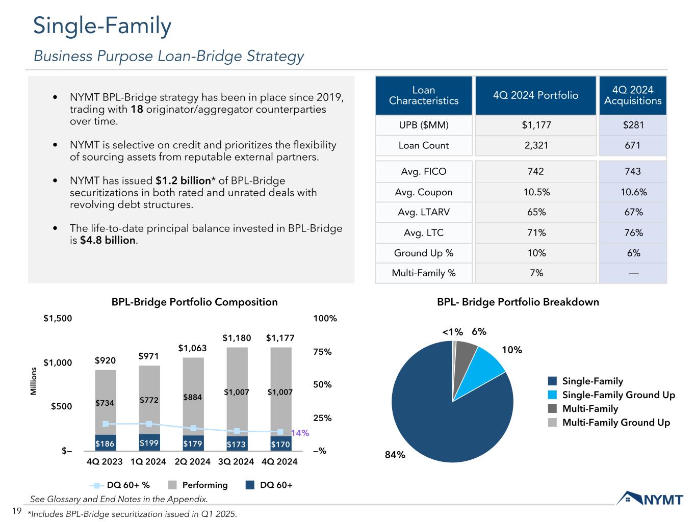 6% 10% 84% Single-family Single-family Ground Up Multi-family Multi-family Ground Up BPL-Bridge Portfolio Breakdown Single-family Business Purpose Loan-Bridge Strategy • NYMT BPL-Bridge Strategy自2019年起实施,随着时间的推移与18个发起/聚合交易对手进行交易。• NYMT对信贷有选择性,并优先考虑从有信誉的外部合作伙伴处采购资产的灵活性。• NYMT已发行12亿美元*具有循环债务结构的有评级和无评级交易中的BPL-Bridge证券化。•投资于BPL-Bridge的终生本金余额为48亿美元。见附录中的词汇表和结尾注。贷款特征2024年第四季度投资组合2024年第四季度收购UPB($ mm)$ 1,177 $ 281贷款数2,321671平均FICO 742743平均票息10.5% 10.6%平均LTARV 65% 67%平均LTC 71% 76% Ground Up % 10% 6% Multi-Family % 7% — $ 920 $ 971 $ 1,063 $ 1,180 $ 1,177 $ 186 $ 199 $ 179 $ 173 $ 170 $ 734 $ 772 $ 884 $ 1,007 $ 1,007 DQ 60 +% Performing DQ 60 + 4Q 2023 1Q 2024 2Q 2024 3Q 2024 4Q 2024 $ — $ 500 $ 1,000 $ 1,500—% 25% 50% 75% 100% BPL-Bridge Portfolio Composition 19*包括2025年Q1发行的BPL-Bridge证券化。M病io ns 14% < 1%