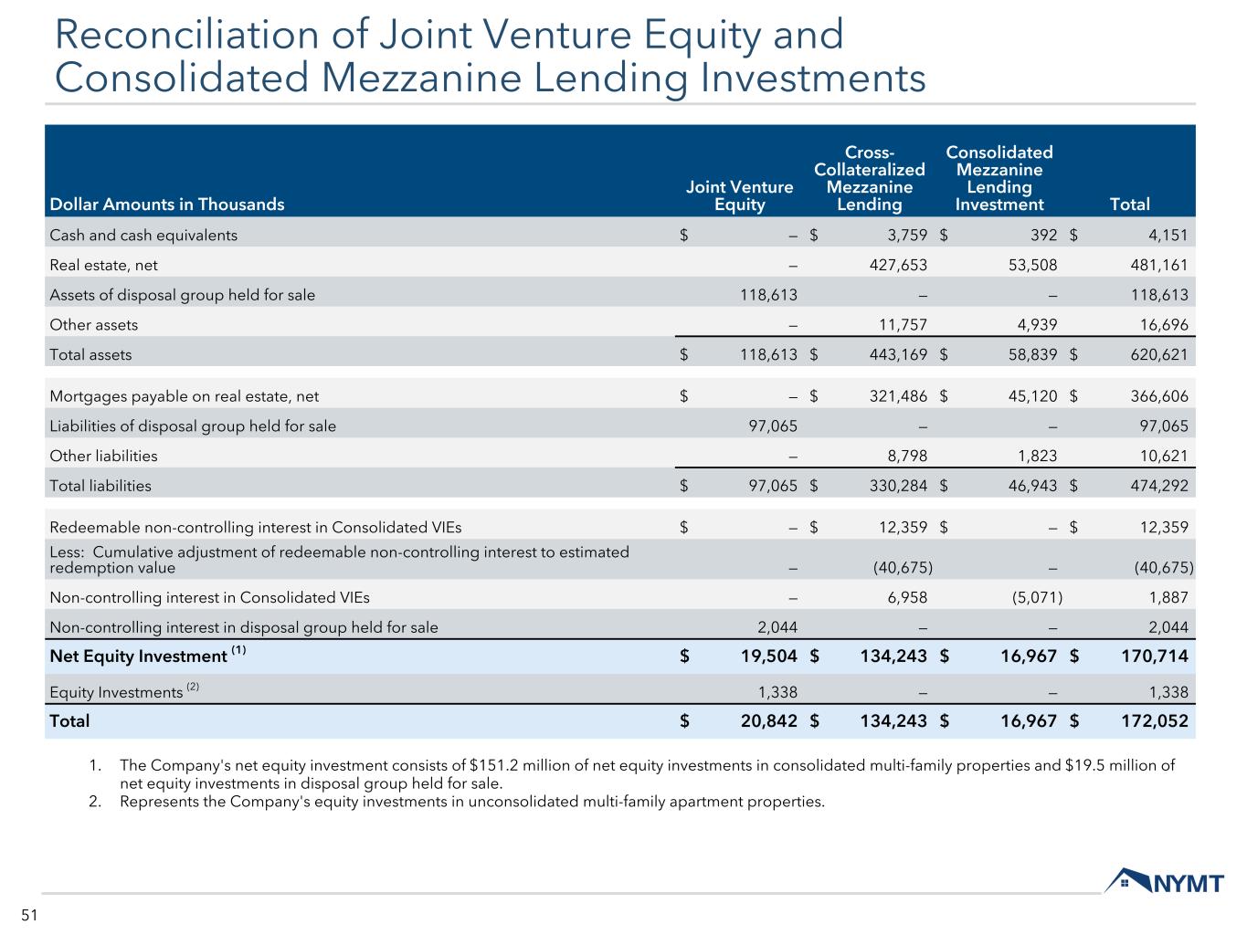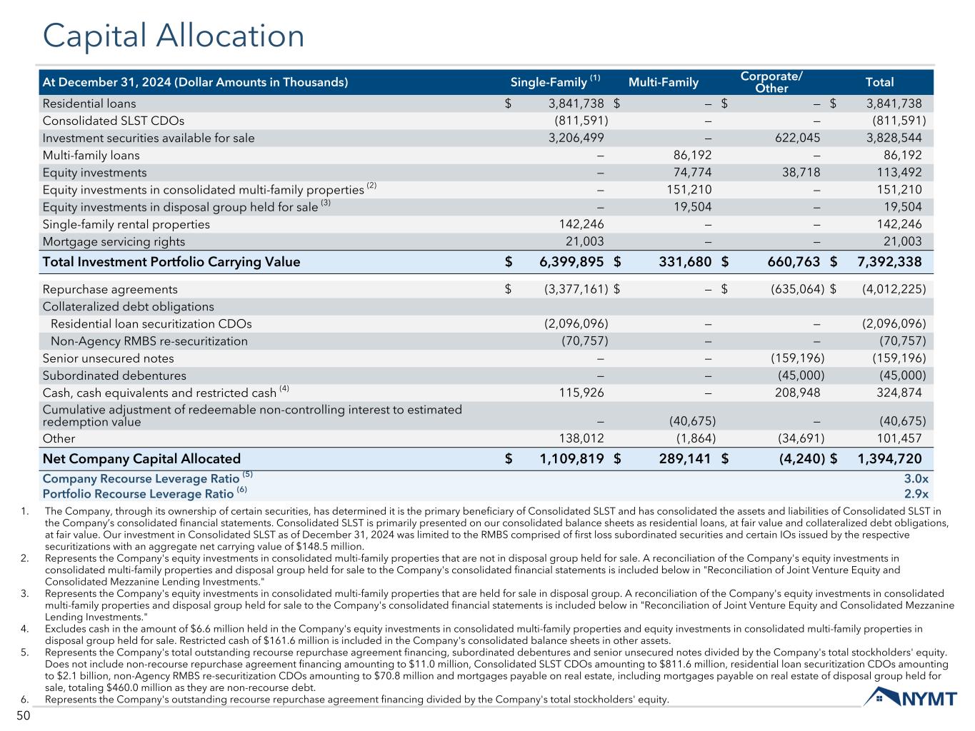 12月31日资金配置,2024年(千美元)单户(1)多户企业/其他住宅贷款总额$ 3,841,738 $ — $ — $ 3,841,738合并SLST CDO(811,591)——(811,591)可供出售的投资证券3,206,499 — 622,0453,828,544多户贷款— 86,192 — 86,192股权投资— 74,77438,718113,492合并多户物业的股权投资(2)— 151,210 — 151,210处置集团持有的股权投资待售(3)— 19,504 — 19,504单户出租物业142,246 —— 142,246抵押贷款服务权21,003 —— 21,003总投资组合账面价值$ 6,399,895 $ 331,680 $ 660,763 $ 7,392,338回购协议$(3,377,161)$ — $(635,064)$(4,012,225)抵押债务住宅贷款证券化CDO(2,096)——(2,096,096)非机构RMBS再证券化(70,757)——(70,757)高级无抵押票据——(159,196)(159,196)次级债券——(45,000)(45,000)现金,现金等价物和受限制现金(4)115,926 — 208,948324,874可赎回非控股权益对估计赎回价值的累计调整—(40,675)—(40,675)其他138,012(1,864)(34,691)101,457分配的公司资本净额$ 1,109,819 $ 289,141 $(4,240)$ 1,394,720公司追索杠杆比率(5)3.0x投资组合追索杠杆比率(6)2.9x 1。公司通过其对某些证券的所有权,确定其为合并SLST的主要受益人,并将合并SLST的资产和负债合并在公司的合并财务报表中。合并SLST在我们的合并资产负债表中主要以住宅贷款、公允价值和抵押债务债务、公允价值列报。截至2024年12月31日,我们对Consolidated SLST的投资仅限于由首次亏损次级证券和相应证券化发行的某些IO组成的RMBS,账面净值合计为1.485亿美元。2.代表公司对不在处置组中的合并多户物业的股权投资持有待售。公司持有待售的合并多户物业和处置集团的股权投资与公司合并财务报表的对账载于下文“合营企业股权和合并夹层借贷投资的对账”。3.代表公司于处置集团持有待售的综合多户物业的权益投资。公司持有待售的合并多户物业和处置集团的股权投资与公司合并财务报表的对账载于下文“合资公司股权和合并夹层借贷投资的对账”。4.不包括公司在合并多户物业的股权投资中持有的金额为660万美元的现金以及在处置集团中持有待售的合并多户物业的股权投资。受限制现金1.616亿美元计入公司合并资产负债表中的其他资产。5.表示公司未偿还的追索权回购协议融资、次级债券和高级无抵押票据总额除以公司股东权益总额。不包括金额为1100万美元的无追索权回购协议融资、金额为8.116亿美元的合并SLST CDO、金额为21亿美元的住宅贷款证券化CDO、金额为7080万美元的非机构RMBS再证券化CDO以及应付房地产抵押贷款,包括应付处置集团持作出售的房地产抵押贷款,因为它们是无追索权债务,因此总计4.60亿美元。6.表示公司未偿还的追索权回购协议融资除以公司股东权益总额。50