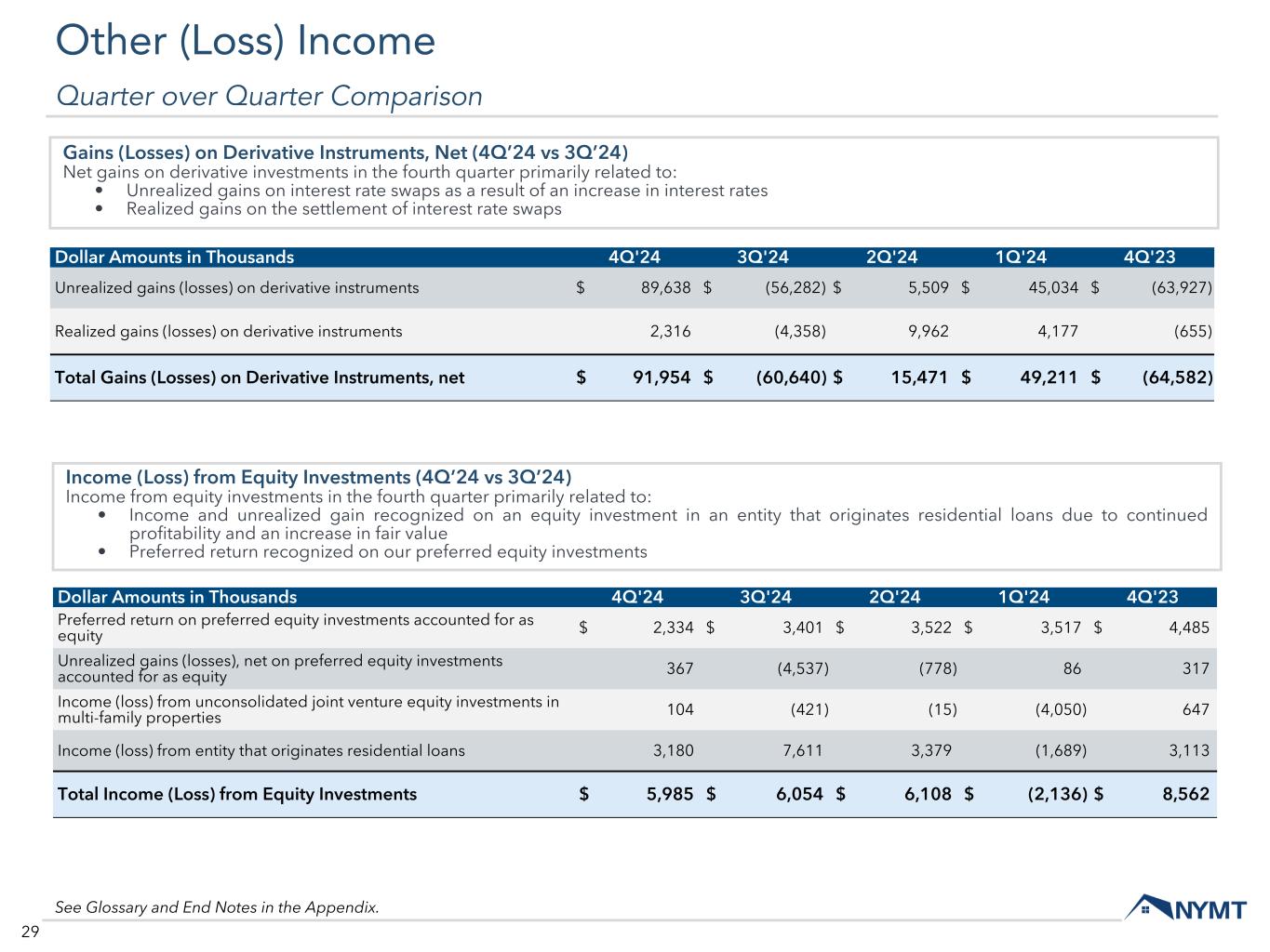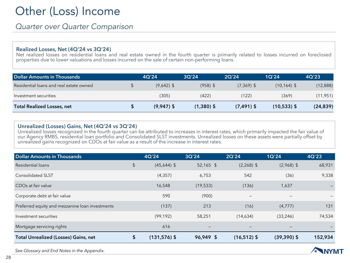 其他(亏损)收入季度与季度比较已实现亏损,净额(4Q‘24 vs 3Q’24)第四季度住宅贷款和拥有的房地产的净已实现亏损主要与估值较低导致的止赎房产产生的亏损和出售某些不良贷款产生的亏损有关。未实现(亏损)收益,净额(4Q‘24 vs 3Q’24)第四季度确认的未实现亏损可归因于利率上升,这主要影响了我们机构的RMBS、住宅贷款组合和合并SLST投资的公允价值。由于利率上升,这些资产的未实现损失被以公允价值确认的CDO未实现收益部分抵消。以千美元计的金额Q4‘24 Q3’24 Q2‘24 Q1’24 Q4 ' 23住宅贷款和房地产拥有$(9,642)$(958)$(7,369)$(10,164)$(12,888)投资证券(305)(422)(122)(369)(11,951)已实现损失总额,净额$(9,947)$(1,380)$(7,491)$(10,533)$(24,839)见附录中的词汇表和结尾注。千美元金额Q4‘24 Q3’24 Q2‘24 Q1’24 Q4 ' 23住宅贷款$(45,644)$ 52,165 $(2,268)$(2,968)$ 68,931合并SLST(4,357)6,753542(36)9,338公允价值CDO 16,548(19,533)(136)1,637 —公允价值公司债590(900)——优先股权和夹层贷款投资(137)213(16)(4,777)131投资证券(99,192)58,251(14,634)(33,246)74,534抵押贷款服务权616 ————未实现(损失)收益总额,净额$(131,576)$ 96,949 $(16,512)$(39,312)