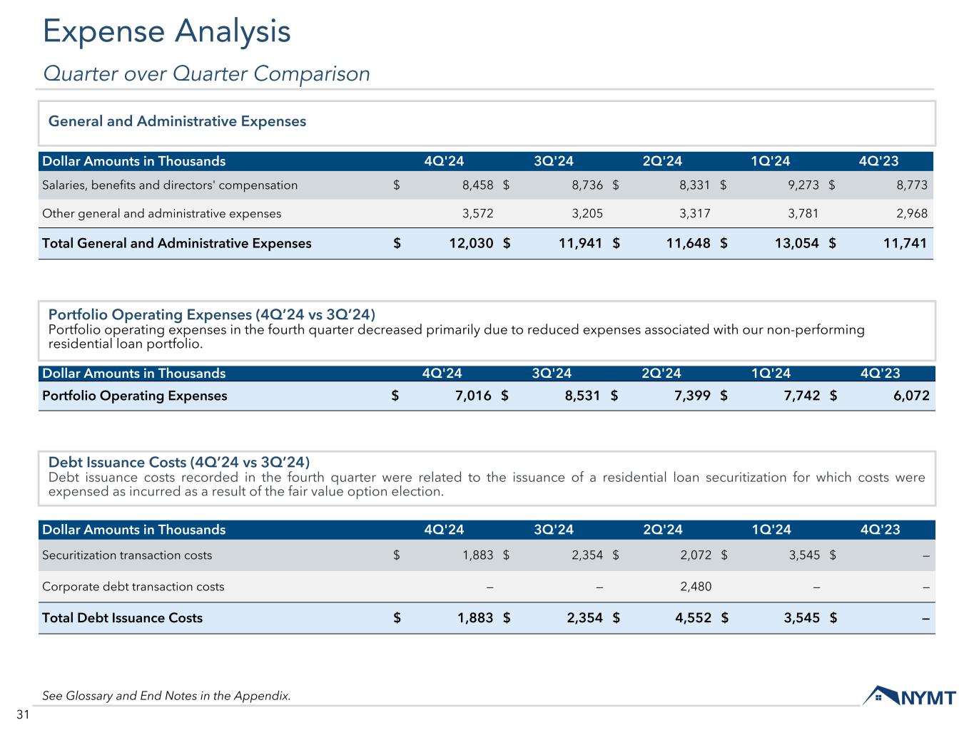 费用分析季度对比一般和管理费用投资组合运营费用(Q4’24 vs Q3’24)第四季度投资组合运营费用下降主要是由于与我们的不良住宅贷款投资组合相关的费用减少。千美元4Q‘24 3Q’24 2Q‘24 1Q’24 4Q'23薪资,福利和董事薪酬8,458美元8,736美元8,331美元9,273美元8,773美元其他一般和行政费用3,5723,2053,3173,7812,968美元一般和行政费用总额12,030美元11,941美元11,648美元13,054美元11,741美元以千计4Q‘24 3Q’24 2Q‘24 1Q’24 4Q'23证券化交易成本1,883美元2,354美元2,072美元3,545美元—公司债务交易成本—— 2,480 ——债务发行总成本1,883美元2,354美元4,552美元3,545美元—见附录中的词汇表和结尾注。31美元,单位:千美元Q4‘24 Q3’24 Q2‘24 Q1’24 Q4‘23投资组合运营费用7,016美元8,531美元7,399美元7,742美元6,072美元发债成本(Q4’24 vs Q3 ' 24)第四季度记录的发债成本与发行住宅贷款证券化有关,其成本在公允价值选择产生时计入费用。