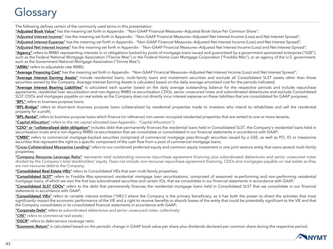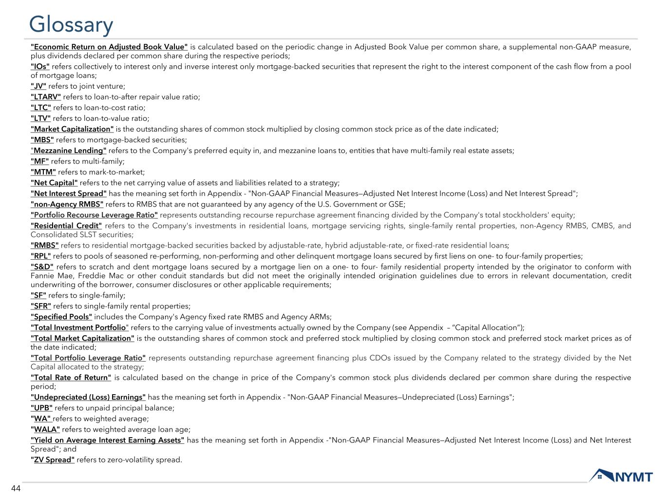 词汇表43以下定义了本演示文稿中的某些常用术语:“调整后账面价值”具有附录中规定的含义——“非GAAP财务指标——调整后每股普通股账面价值”;“调整后利息收入”具有附录中规定的含义——“非GAAP财务指标——调整后净利息收入(亏损)和净利差”;“调整后利息费用”具有附录中规定的含义——“非GAAP财务指标——调整后净利息收入(亏损)和净利差”;“调整后净利息收入”具有附录中规定的含义——“非GAAP财务指标——调整后净利息收入(亏损)和净利差”;“代理”是指在由政府资助的企业(“GSE”),例如联邦国民抵押贷款协会(“Fannie Mae”)或联邦Home Loan抵押贷款公司(“Freddie Mac”),或美国政府的一个机构,例如政府国民抵押贷款协会(“Ginnie Mae”)发行和担保的抵押贷款池中代表权益或由其支持的债务的RMBS;“ARM”是指可调整利率的RMBS;“平均融资成本”具有附录中规定的含义——“非公认会计准则财务指标——调整后的净利息收入(亏损)和净利差”;“平均生息资产”包括住宅贷款,多户贷款和投资证券,不包括公司拥有的证券以外的所有合并SLST资产。平均生息资产是根据所示期间的日均摊余成本计算的;“平均有息负债”是根据各个期间的日均未偿余额每季度计算的,包括回购协议、住宅贷款证券化和非代理的RMBS再证券化CDO,高级无抵押票据和次级债券,不包括合并的SLST CDO和应付房地产的抵押贷款,因为公司不会直接对这些按公认会计原则合并的负债产生利息费用;“BPL”是指商业目的贷款;“BPL-Bridge”是指以住宅物业为抵押的短期商业目的贷款,提供给打算修复并出售住宅物业以获取利润的投资者;“BPL-Rental”是指为非业主自用住宅物业融资(或再融资)的商业目的贷款出租给一个或多个租户;“资本分配”是指分配的净资本(见附录-“资本分配”);“CDO”或“抵押债务义务”包括为在Consolidated SLST中持有的住宅贷款、公司在证券化信托中持有的住宅贷款以及我们根据公认会计原则在我们的财务报表中合并或合并的非代理RMBS再证券化提供永久融资的债务;“CMBS”是指由GSE发行的商业抵押转手证券以及PO组成的商业抵押贷款支持证券,IO或夹层证券,代表从商业抵押贷款池中获得现金流特定组成部分的权利;“交叉抵押夹层贷款”是指我们对一个拥有多户房产的合资实体的合并优先股和普通股股权投资;“公司追索杠杆率”是指未偿还的追索回购协议融资总额加上次级债券和高级无担保票据除以公司股东权益总额。不包括无追索权回购协议融资、CDO和应付房地产抵押贷款,因为它们是对公司的无追索权债务;“合并房地产VIE”是指拥有多户房产的合并VIE;“合并SLST”是指房地美担保的住宅抵押贷款证券化,由经验丰富的再履约和不良住宅抵押贷款组成,其中我们拥有第一损失次级证券和某些IO,我们根据公认会计原则在财务报表中合并;“合并SLST CDO”是指为我们根据公认会计原则在财务报表中合并的合并SLST中持有的住宅抵押贷款提供永久融资的债务;“合并VIE”是指公司是主要受益人的可变利益实体(“VIE”),由于它既有权指导对VIE经济绩效影响最大的活动,也有权获得对VIE可能具有重大影响的实体的利益或吸收损失,并且公司根据公认会计原则在其合并财务报表中合并;“公司债”是指次级债券和高级无担保票据, 统称;“CRE”指商业地产;“DSCR”指偿债覆盖率;“经济回报”根据GAAP每股账面价值的周期性变化加上相应期间每股普通股宣布的股息计算;
