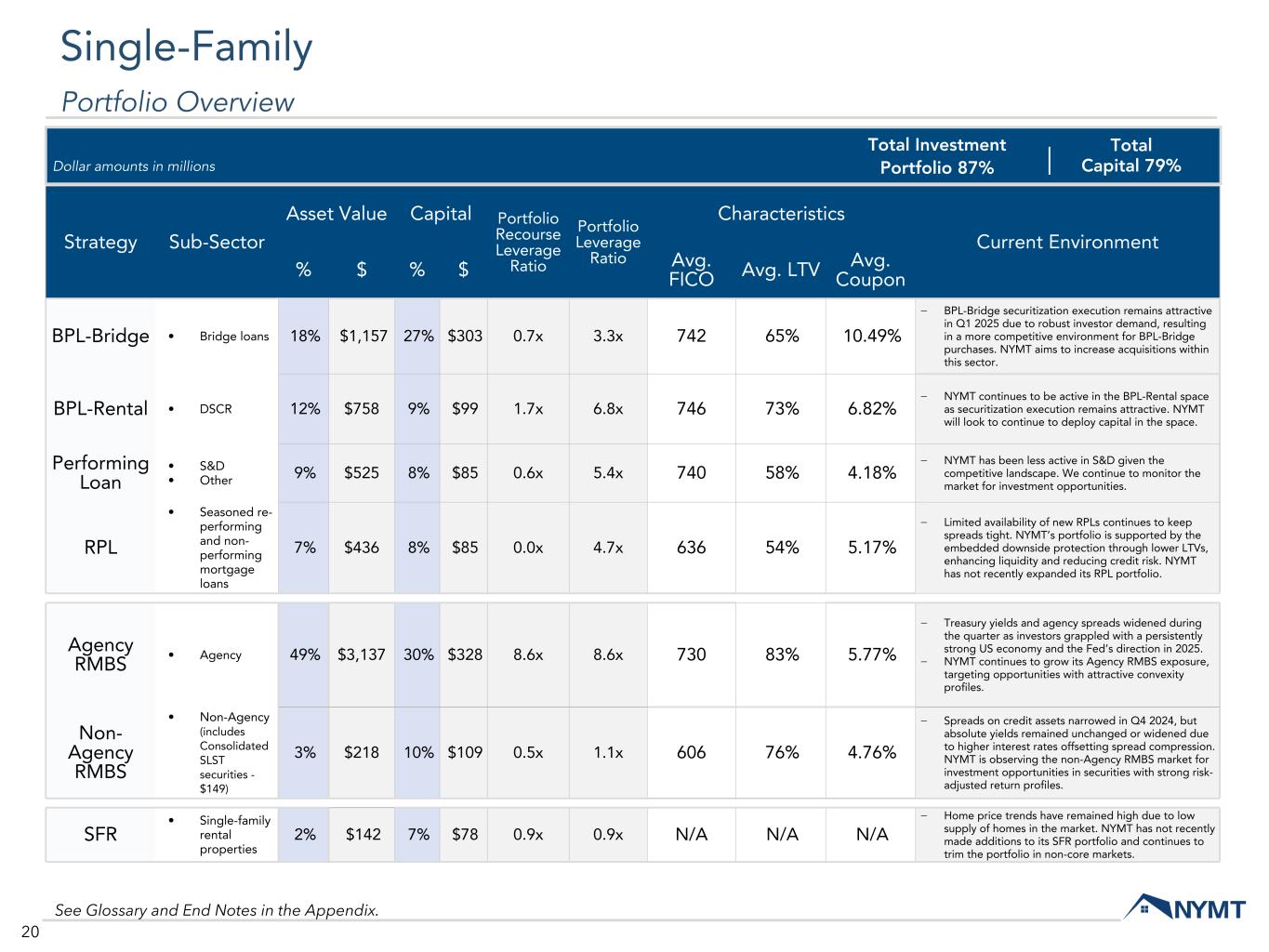 美元金额百万总投资组合87%策略子行业资产价值资本组合追索杠杆率组合杠杆率特征当前环境% $% $平均。FICO平均LTV平均。息票BPL-Bridge •过桥贷款18% $ 1,15727% $ 303 0.7x 3.3x 74265% 10.49% −由于投资者需求强劲,BPL-Bridge证券化执行在2025年第一季度仍然具有吸引力,导致BPL-Bridge购买的竞争环境更加激烈。NYMT的目标是增加该行业内的收购。BPL-Rental • DSCR12 % $ 7589% $ 99 1.7x 6.8x 74673% 6.82% − NYMT继续活跃在BPL-Rental领域,因为证券化执行仍然具有吸引力。NYMT将寻求继续在该领域进行资本布局。履约贷• S & D •其他9% $ 5258% $ 85 0.6x 5.4x 74058% 4.18% − NYMT鉴于竞争格局,在S & D方面的活跃度一直较低。我们继续监测市场的投资机会。RPL •过时的再表现和不良抵押贷款7% $ 4368% $ 85 0.0x 4.7x 63654% 5.17% −有限的新RPLs可用性继续保持利差紧张。NYMT的投资组合通过降低LTV、增强流动性和降低信用风险而获得内嵌下行保护的支持。NYMT最近没有扩大其RPL投资组合。机构RMBS •机构49% $ 3,13730% $ 328 8.6x 8.6x 73083% 5.77% −当季美国国债收益率和机构利差扩大,因投资者努力应对持续强劲的美国经济和美联储2025年的方向。− NYMT继续增加其机构RMBS敞口,瞄准具有吸引人的凸度轮廓的机会。非机构RMBS •非机构(包括合并SLST证券-149美元)3% $ 21810% $ 109 0.5x 1.1x 60676% 4.76% − 2024年第四季度信贷资产利差收窄,但绝对收益率保持不变或扩大,原因是较高的利率抵消了利差压缩。NYMT正在观察非机构RMBS市场,寻找具有较强风险调整后收益情况的证券的投资机会。SFR •单户出租物业2% $ 1427% $ 78 0.9x 0.9x N/A N/A N/A −由于市场房屋供应较少,房价趋势一直保持高位。NYMT最近没有对其SFR投资组合进行任何补充,并继续削减非核心市场的投资组合。总资本79%见附录中的词汇表和结尾注。20个单户家庭投资组合概览