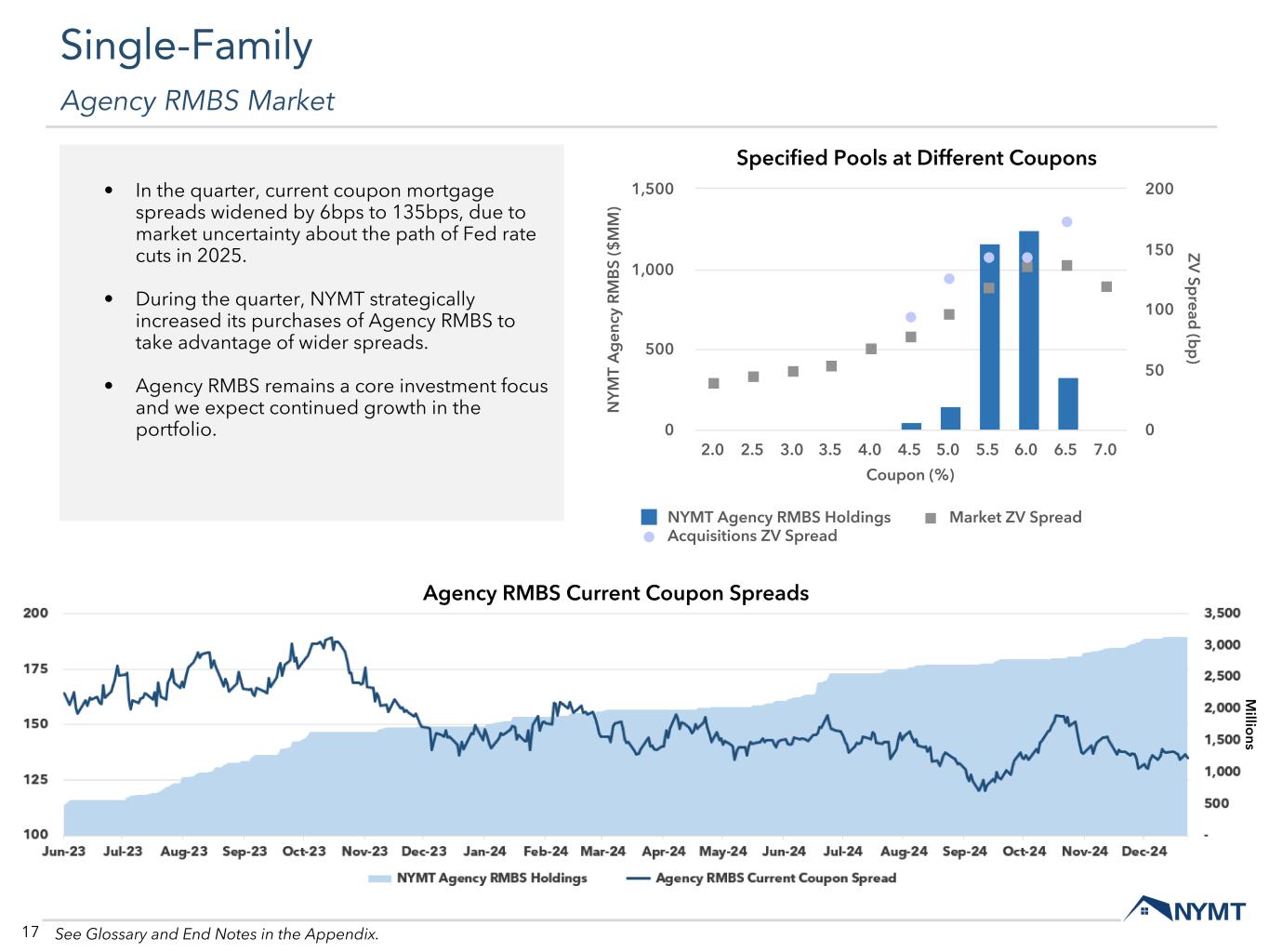 654美元604美元933美元1,008美元923美元238美元306美元466美元636美元560美元416美元298美元467美元372美元363美元2023年第四季度2024年第一季度2024年第二季度2024年第三季度2024年第四季度2024年第四季度《长期股东价值战略》之长期股东价值战略促进可持续盈利增长• NYMT一直在扩大投资组合,目标是在不确定的利率环境中产生更高的经常性净利息收入。•最近的收购主要集中在代理RMBS、BPL-过桥贷款和BPL-租金贷款。• NYMT通过在BPL贷款方面的多年经验和深厚的交易对手关系,利用其强大的采购能力来增加采购量。• NYMT专注于资产管理,以加快整个投资组合的决议速度并减轻未来已实现的损失。• NYMT于2025年1月扩大了其投资组合,在住宅信贷和机构RMBS收购方面提供了4.88亿美元。住宅投资收购(百万美元金额)住宅信贷机构RMBS住宅投资活动2023年第四季度2024年第一季度2024年第二季度2024年第三季度2024年第四季度收购654美元604美元933美元1,008美元923美元销售(45)(30)(4)(121)(19)收益(230)(256)(321)(353)(489)净住宅投资活动379美元318美元608美元534美元415见附录中的词汇表和结尾注。16