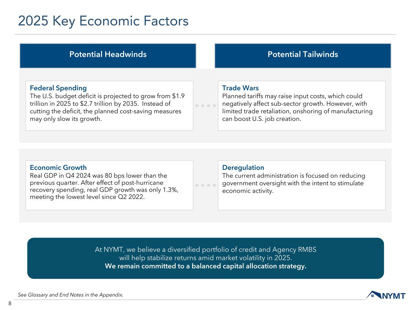 2025年关键经济因素8见附录中的词汇表和结尾注。潜在的尾风潜在的逆风联邦支出美国预算赤字预计将从2025年的1.9万亿美元增长到2035年的2.7万亿美元。计划中的节约成本措施非但没有削减赤字,反而可能只会减缓其增长。贸易战计划中的关税可能会提高投入成本,这可能会对细分行业的增长产生负面影响。然而,在贸易报复有限的情况下,制造业的本土外包可以促进美国创造就业机会。经济增长2024年Q4实际GDP较上季度下降80个基点。经过飓风后复苏支出的影响,实际GDP增长仅为1.3%,达到了2022年第二季度以来的最低水平。放松管制本届政府专注于减少政府监管,意图刺激经济活动。在NYMT,我们认为信贷和代理RMBS的多元化投资组合将有助于在2025年市场波动的情况下稳定回报。我们仍然致力于均衡的资本配置策略。