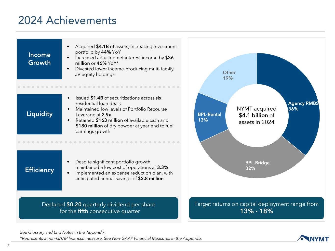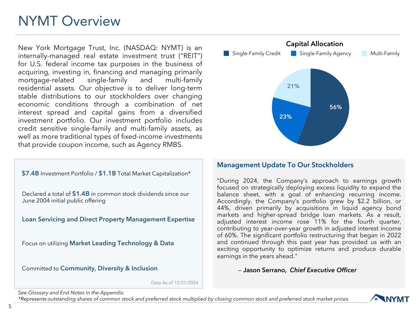 NYMT概述纽约抵押信托股份有限公司(纳斯达克股票代码:NYMT)是一家内部管理的房地产投资信托基金(“REIT”),用于美国联邦所得税目的,主要从事与抵押贷款相关的单户和多户住宅资产的收购、投资、融资和管理业务。我们的目标是通过净利差和多元化投资组合的资本收益相结合,在不断变化的经济条件下向我们的股东提供长期稳定的分配。我们的投资组合包括对信用敏感的单户和多户资产,以及提供票息收入的更传统的固定收益投资类型,例如代理RMBS。数据截至2024年12月31日专注于利用市场领先的技术和数据致力于社区、多元化和包容性贷款服务和直接物业管理专业知识$ 7.4B投资组合/$ 1.1B总市值*单户信贷单户机构多户资本配置见附录中的词汇表和结尾注。*表示普通股和优先股的流通股乘以收盘普通股和优先股市场价格。523% 56% 21%自2004年6月首次公开募股管理层向我们的股东更新以来,共宣布了1.4B美元的普通股股息“在2024年期间,公司的盈利增长方法侧重于战略性地部署过剩的流动性以扩大资产负债表,目标是提高经常性收入。因此,该公司的投资组合增长了22亿美元,即44%,这主要是由流动性强的机构债券市场和更高利差的过桥贷款市场的收购推动的。因此,第四季度调整后利息收入增长11%,推动调整后利息收入同比增长60%。从2022年开始并持续到过去一年的重大投资组合重组为我们提供了一个令人兴奋的机会,可以在未来几年优化回报并产生持久收益。”— Jason Serrano,首席执行官