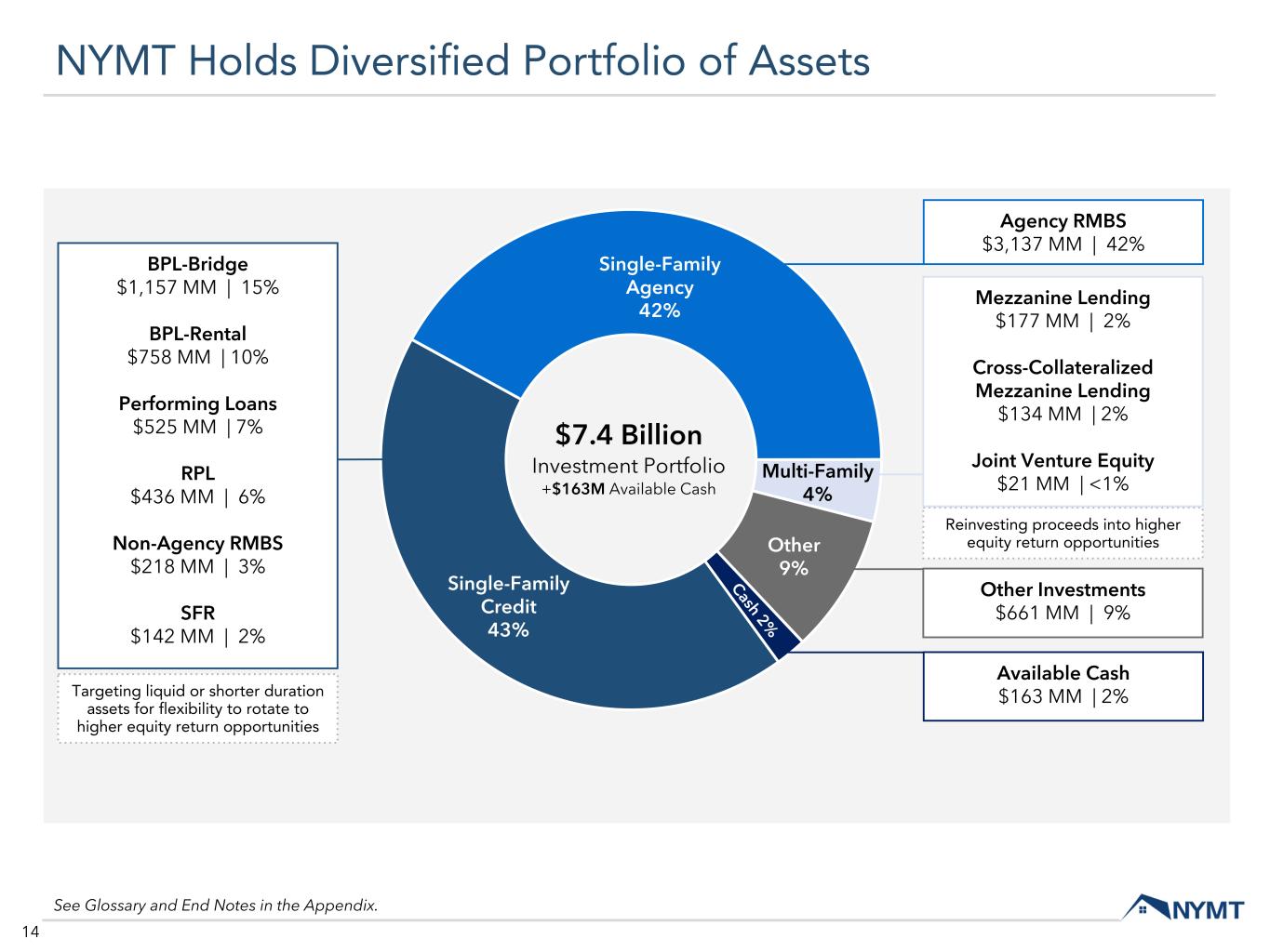 机构RMBS 3,137美元mm | 42%见附录中的词汇表和尾注。以流动性或较短存续期资产为目标为了灵活地轮换以获得更高的股权回报机会将收益再投资于更高的股权回报机会1474亿美元的投资组合+ 1.63亿美元的可用现金BPL-Bridge 1157mm美元| 15% BPL-租金758mm美元| 10%履约贷款525mm美元| 7% RPL 436mm美元| 6%非机构RMBS 218mm美元| 3% SFR 142mm | 2% 丨NYMT持有多元化资产组合单户信贷43%多户4%夹层贷款177mm美元| 2%交叉抵押夹层贷款134mm美元| 2%合资企业股权21mm美元| < 1%单户代理42%其他投资661mm美元| 9%可用现金163mm美元| 2%其他9%现金2%