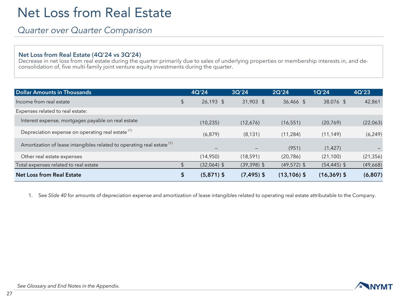 房地产净亏损环比比较房地产净亏损(24年第四季度与24年第三季度)本季度房地产净亏损减少,主要是由于本季度出售了基础物业或五个多户合资企业股权投资的会员权益,并解除了合并。1.关于归属于公司的与经营性房地产相关的租赁无形资产的折旧费用和摊销金额,请参见幻灯片40。见附录中的词汇表和结尾注。以千美元计的金额Q4‘24 Q3’24 Q2‘24 Q1’24 Q4 ' 23房地产收入26,193美元31,903美元36,466美元38,076美元42,861美元与房地产相关的支出:利息支出,应付不动产抵押贷款(10,235)(12,676)(16,551)(20,769)(22,063)经营性不动产折旧费用(1)(6,879)(8,131)(11,284)(11,149)(6,249)与经营性不动产相关的租赁无形资产摊销(1)——(951)(1,427)——其他不动产费用(14,950)(18,591)(20,786)(21,100)(21,356)与不动产相关的费用总额$(32,064)$(39,398)$(49,572)$(54,445)$(49,668)房地产净亏损$(5,871)$(7,495)$(13,106)$(16,369)$(6,