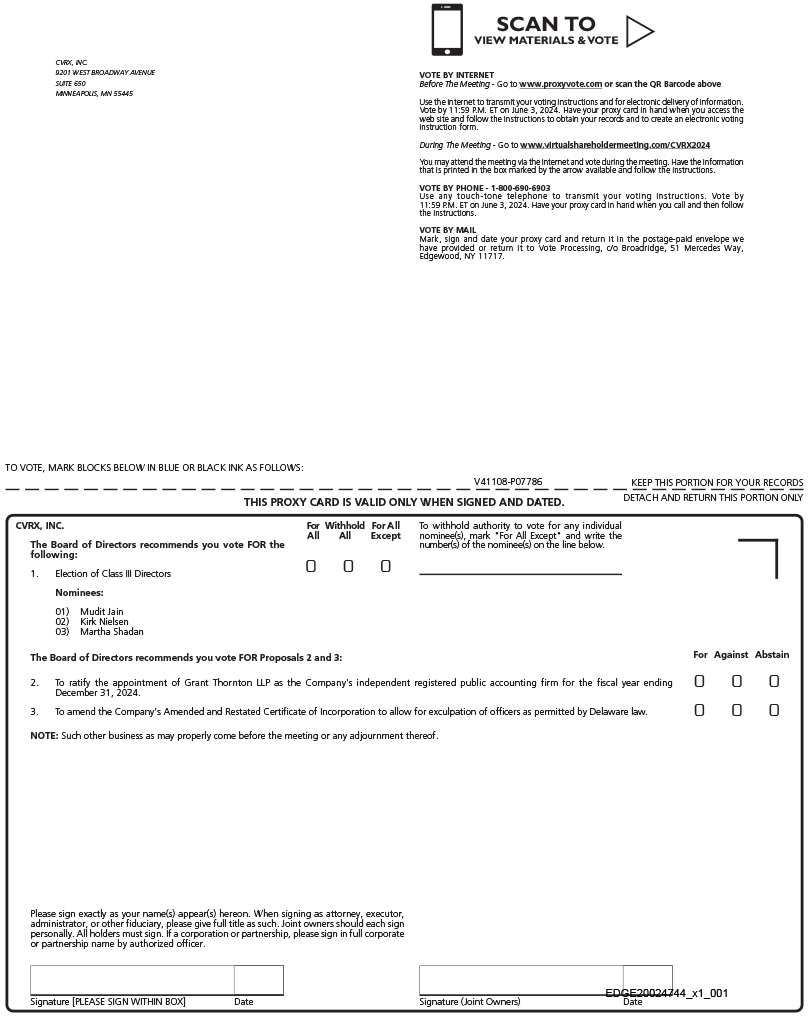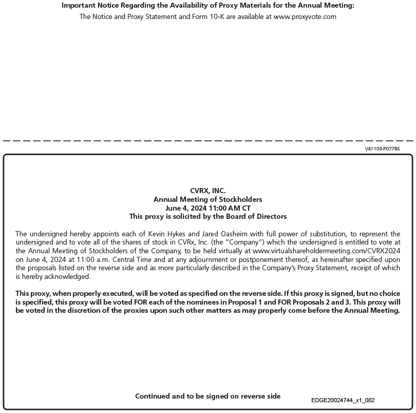 诚邀您参加特拉华州公司CVRx, Inc.(“我们”、“我们”、“CVRx”或“公司”)2024年年度股东大会(“年度会议”)。年会将于2024年6月4日(星期二)上午11:00(美国中部时间)以虚拟会议形式举行,目的如下: