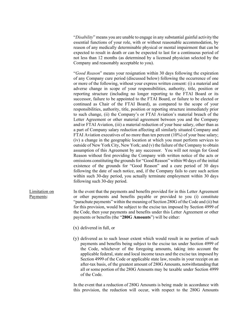 “残疾”是指,由于任何可预期导致死亡或可预期持续时间不少于12个月的医学上可确定的身体或精神损害(由公司选定并为您合理接受的持牌医生确定),您无法从事任何实质性的有酬活动/您的角色的基本职能,无论是否有合理的便利。“正当理由”是指您在发生以下一项或多项情况后,在任何公司补救期(下文讨论)届满后30天内辞职,且未经您明确书面同意:(i)您的职责范围、权限、职称、职位或报告结构发生重大不利变化(包括不再向FTAI董事会或其继任者报告,未能被任命为FTAI董事会成员,或未能当选或继续担任FTAI董事会主席),与您的职责范围、权限、职称、在紧接此类变更之前,(ii)公司或FTAI Aviation严重违反您与公司和/或FTAI Aviation之间的信函协议或其他重大协议,(iii)大幅削减您的基本工资,但作为公司减薪的一部分影响所有类似情况的公司和FTAI Aviation高管的不超过您基本工资的百分之十(10%)的情况除外;(iv)您必须在纽约市以外的地区提供服务的地理位置发生变化,纽约;及(v)公司未能取得任何继承者对本协议的承担。未在“正当理由”理由最初存在的90天内以及自该通知发出之日起30天的补救期内向公司提供构成“正当理由”理由的作为或不作为的书面通知,您将不会因正当理由辞职,如果公司未能在该30天期限内纠正该行为,您实际上将在该30天期限后的30天内终止雇用。付款限制:如果本信函协议中规定的付款和福利或应付或提供给您的其他付款和福利(i)构成《守则》第280G条含义内的“降落伞付款”,并且(ii)如果没有这一规定,将需要缴纳《守则》第4999节规定的消费税,则您在本信函协议下的付款和福利或其他付款或福利(“280G金额”)将是:(x)全额交付,或(y)交付的程度较轻,将导致此类付款和福利的任何部分根据《守则》第4999节无需缴纳消费税,上述金额中的任何一个,考虑到适用的联邦、州和地方所得税以及《守则》第4999节或适用的州法律规定的消费税,导致您在税后基础上收到最大金额280G金额,尽管根据《守则》第4999节,280G金额的全部或部分可能需要纳税。如果按照这一规定正在减少280G的金额,则将发生减少,相对于280G的金额
