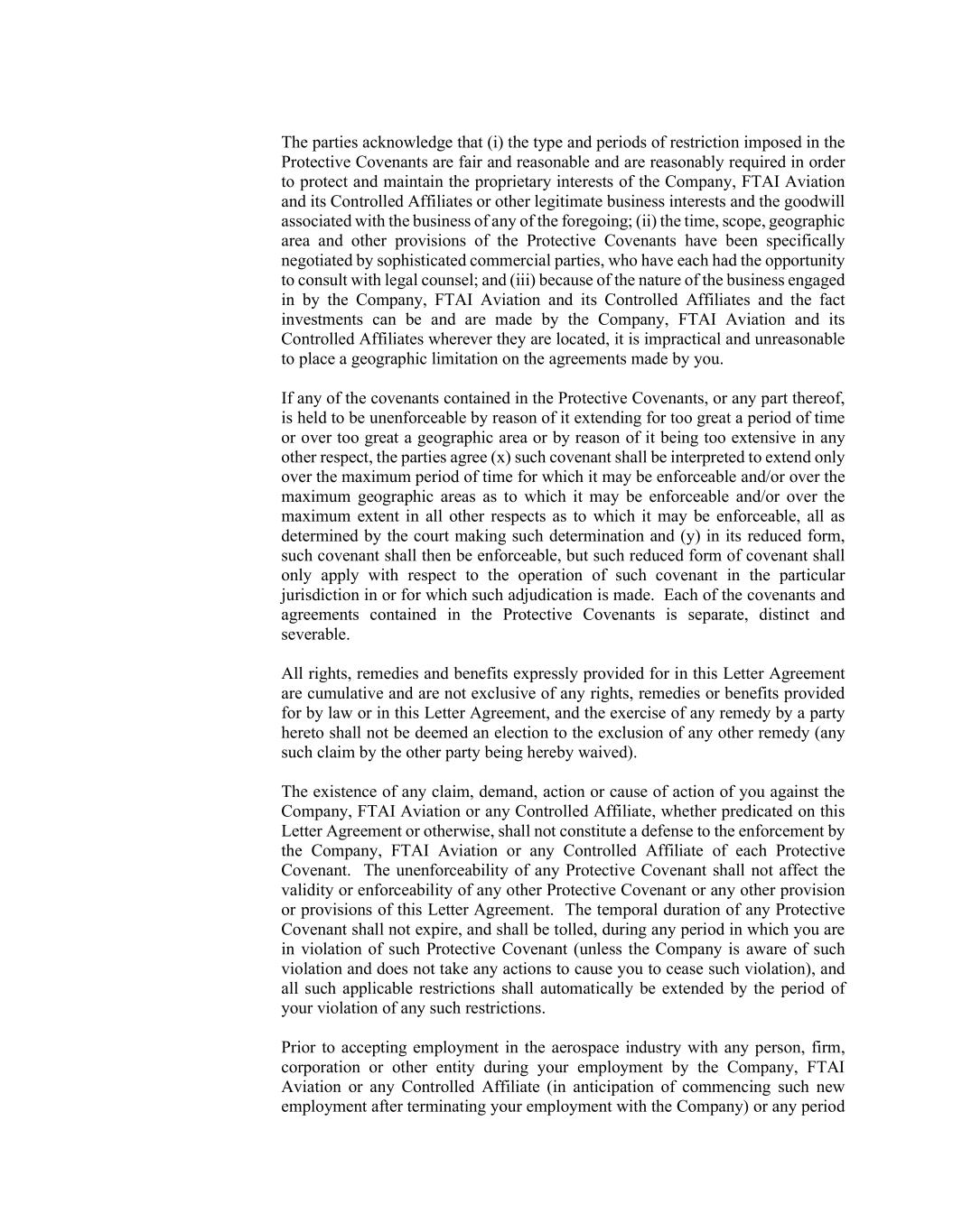各方承认,(i)保护性契约中施加的限制类型和期限是公平合理的,并且是为保护和维护公司、FTAI Aviation及其受控关联公司的专有利益或其他合法商业利益以及与上述任何一项业务相关的商誉而合理要求的;(ii)保护性契约的时间、范围、地理区域和其他规定已由老练的商业各方具体协商,彼等各自曾有机会谘询法律顾问;及(iii)由于公司、FTAI Aviation及其控制的联属公司所从事业务的性质,以及公司、FTAI Aviation及其控制的联属公司可进行及现已进行投资的事实,不论其位于何处,故对贵公司所订立的协议设置地域限制是不切实际及不合理的。如果保护性盟约所载的任何盟约或其任何部分因其延伸时间过长或地域范围过大或因其在任何其他方面过于广泛而被认定为不可执行,双方同意(x)该契诺应被解释为仅在其可强制执行的最长期限内延长和/或在其可强制执行的最大地理区域和/或在其可强制执行的所有其他方面的最大范围内延长,所有这些均由作出该决定的法院确定,并且(y)以其简化形式,则该契诺应随后可强制执行,但该等缩减形式的契诺仅适用于该契诺在作出该等裁定的特定司法管辖区或为其作出该等裁定的特定司法管辖区的实施。保护性盟约所载的每一项盟约和协议都是独立的、不同的和可分割的。本信函协议中明确规定的所有权利、补救措施和利益是累积的,不排除法律或本信函协议中规定的任何权利、补救措施或利益,并且本协议一方行使任何补救措施不应被视为排除任何其他补救措施的选择(另一方在此放弃任何此类索赔)。贵公司针对公司、FTAI Aviation或任何受控关联公司的任何索赔、要求、诉讼或诉讼因由的存在,无论是否基于本信函协议或其他,均不构成对公司、FTAI Aviation或每项保护性契约的任何受控关联公司强制执行的抗辩。任何保护性盟约的不可执行性不影响任何其他保护性盟约或本函协议的任何其他条款或规定的有效性或可执行性。任何保护性盟约的时间期限不会在你违反该保护性盟约的任何期间内到期,并应收费(除非公司知悉该违反且未采取任何行动促使你停止该违反),而所有该等适用限制应自动由你违反任何该等限制的期间延长。在您受雇于公司期间,在接受航空航天行业的任何个人、事务所、公司或其他实体的雇佣之前,FTAI Aviation或任何受控关联公司(在您终止与公司的雇佣关系后预期开始此类新的雇佣)或任何时期