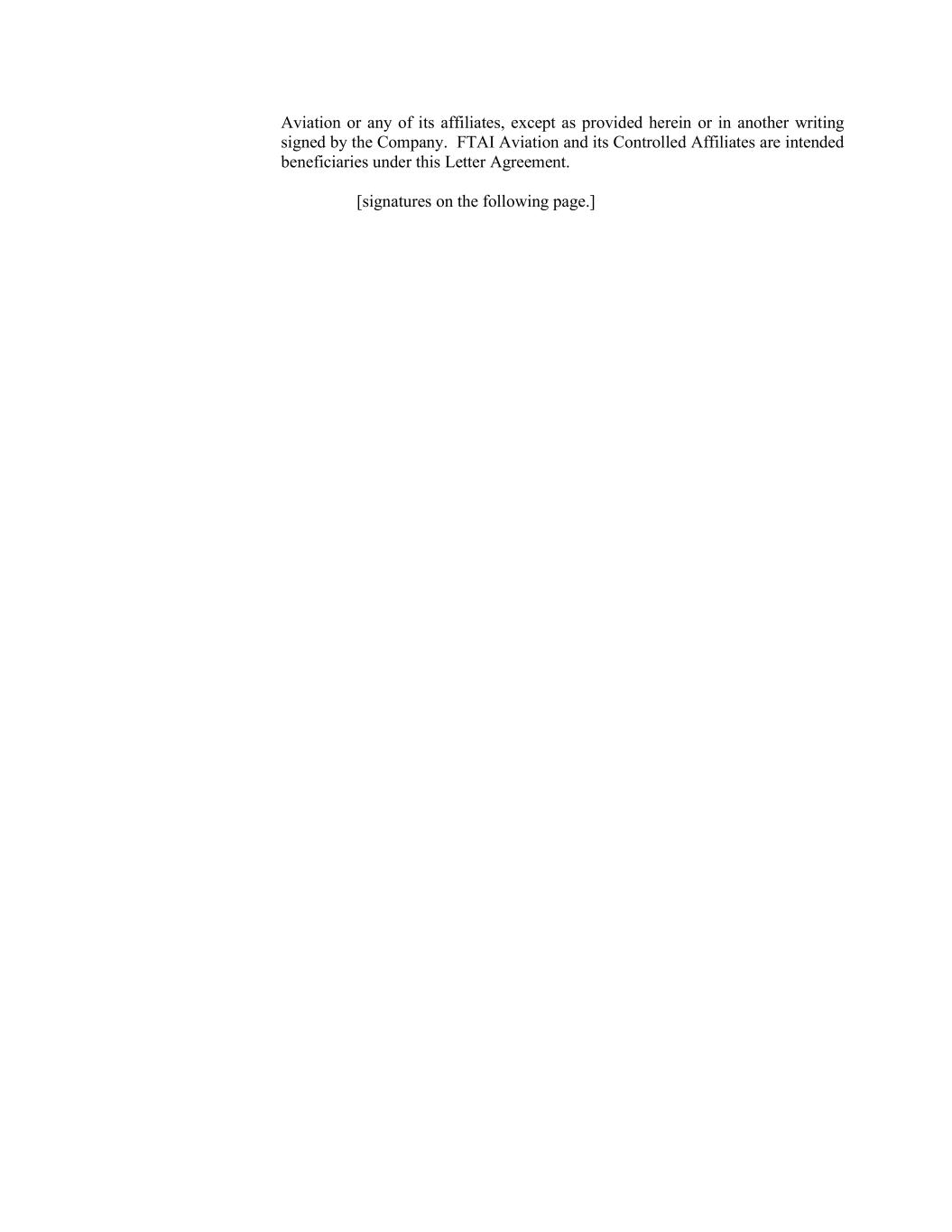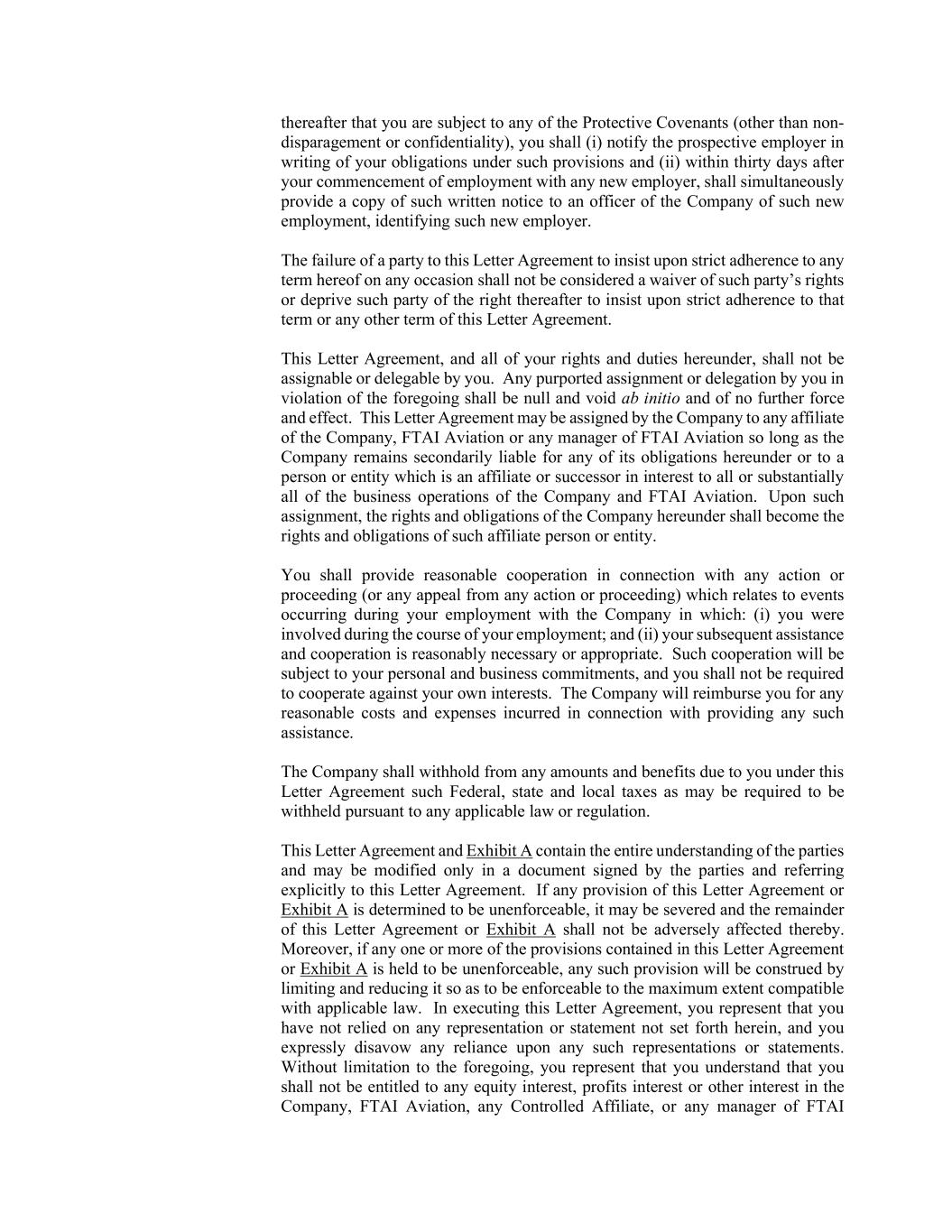 其后,如你须遵守任何保护性契诺(非贬损或保密除外),你须(i)以书面通知准雇主你在该等条文下的义务,及(ii)在你开始受雇于任何新雇主后三十天内,须同时向该公司的高级人员提供该等书面通知的副本,指明该新雇主。本函件协议的一方未能在任何场合坚持严格遵守本协议的任何条款,不应被视为放弃该方的权利或剥夺该方此后坚持严格遵守该条款或本函件协议的任何其他条款的权利。本函件协议,以及贵方在本协议项下的所有权利和义务,不得由贵方转让或转授。你方违反前述规定所进行的任何声称的转让、转授,自发生之日起无效,不再具有效力和效力。本信函协议可由公司转让给公司的任何关联方、FTAI Aviation或FTAI Aviation的任何管理人,只要公司仍对其在本协议项下的任何义务承担次要责任,或对作为公司全部或几乎全部业务运营的关联方或利益继承者的个人或实体以及FTAI Aviation承担次要责任。在该转让后,公司在本协议项下的权利和义务应成为该关联人或实体的权利和义务。你须就与你受雇于公司期间发生的事件有关的任何诉讼或程序(或任何诉讼或程序的任何上诉)提供合理合作,其中:(i)你在受雇期间曾参与;及(ii)你随后的协助和合作是合理必要或适当的。此类合作将以您的个人和业务承诺为准,不得要求您进行违背自身利益的合作。公司将向您偿还与提供任何此类援助有关的任何合理成本和费用。公司应从本信函协议项下应付给您的任何金额和利益中预扣根据任何适用法律或法规可能要求预扣的联邦、州和地方税款。本信函协议和附件 A包含各方当事人的全部谅解,只能在各方当事人签署并明确提及本信函协议的文件中进行修改。如果本信函协议或附件 A的任何条款被确定为不可执行,则可能会被切断,本信函协议或附件 A的其余部分不应因此受到不利影响。此外,如果本信函协议或附件 A所载的任何一项或多项规定被认为是不可执行的,则任何该等规定将被解释为对其进行限制和减少,以便在与适用法律相符的最大范围内具有可执行性。在执行本信函协议时,贵公司声明并未依赖任何未在此列出的陈述或陈述,并且贵公司明确否认对任何此类陈述或陈述的任何依赖。在不受上述限制的情况下,您代表理解,您无权获得公司、FTAI Aviation、任何受控关联公司或FTAI的任何管理人的任何股权、利润权益或其他权益
