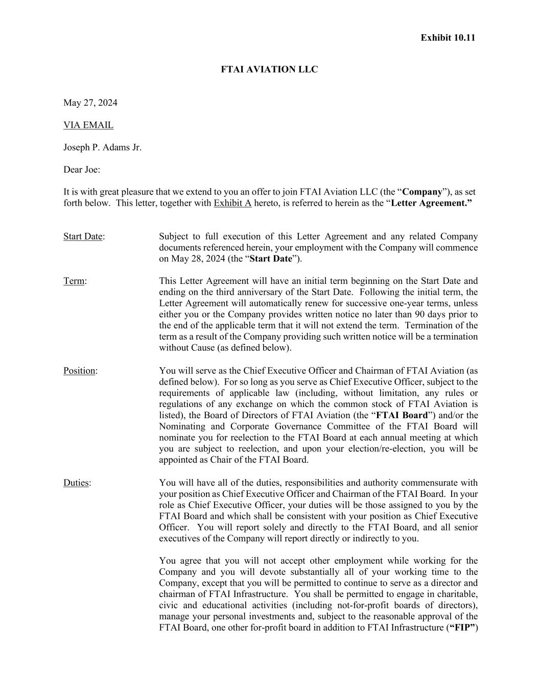 附件 10.11 FTAI AVIATION LLC 2024年5月27日VIA EMAIL Joseph P. Adams Jr.尊敬的Joe:我们非常高兴地向您发出加入FTAI Aviation LLC(“公司”)的邀请,具体如下。这封信,连同本协议的附件 A,在此简称为“信函协议”。开始日期:在充分执行本信函协议和此处引用的任何相关公司文件的前提下,您在公司的受雇将于2024年5月28日(“开始日期”)开始。期限:本函件协议初始期限自起始日起,至起始日满三周年止。在初始期限之后,信函协议将自动续展连续一年的期限,除非贵公司或本公司不迟于适用期限结束前90天提供书面通知,表示不会延长期限。因公司提供该等书面通知而终止任期将属无故终止(定义见下文)。职位:您将担任FTAI Aviation(定义见下文)的首席执行官兼董事长。只要你担任首席执行官,在符合适用法律(包括但不限于FTAI Aviation普通股上市的任何交易所的任何规则或条例)的要求下,FTAI Aviation董事会(“FTAI董事会”)和/或FTAI董事会的提名和公司治理委员会将在每次你需要连任的年度会议上提名你连任FTAI董事会成员,并在你当选/连任后,任命你为FTAI董事会主席。职责:您将拥有与您作为首席执行官兼FTAI董事会主席的职位相称的所有职责、责任和权力。在您担任首席执行官期间,您的职责将与FTAI董事会指派给您的职责一致,并与您担任首席执行官的职位一致。您将向FTAI董事会单独、直接汇报,公司全体高级管理人员将直接或间接向您汇报。您同意在为公司工作期间不接受其他雇佣并且您将基本上所有的工作时间都投入到公司,但将被允许继续担任FTAI Infrastructure的董事和董事长除外。您将被允许从事慈善、公民和教育活动(包括非营利性董事会),管理您的个人投资,并且在获得FTAI董事会合理批准的情况下,除FTAI Infrastructure(“FIP”)外,还将获得另一个营利性董事会