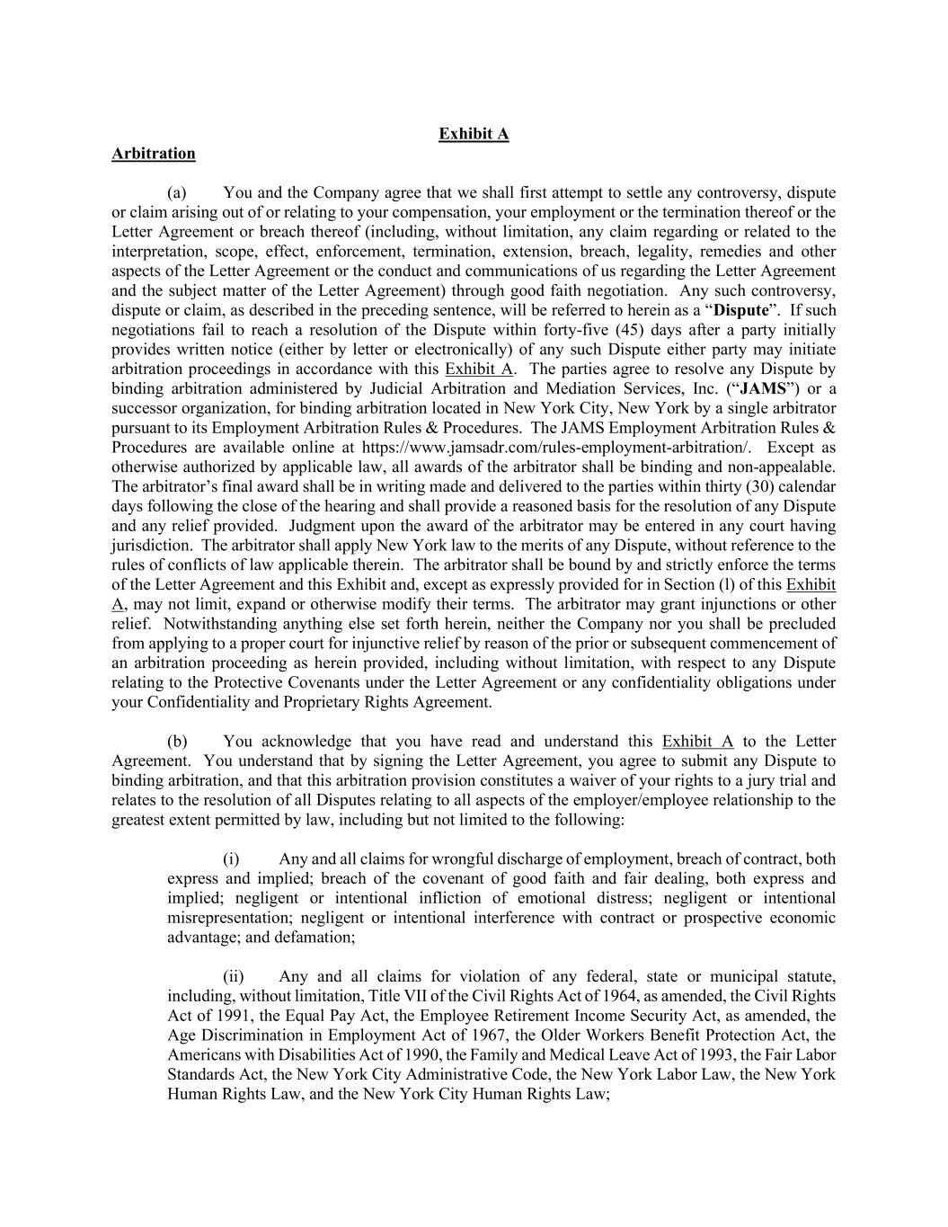 附件 A仲裁(a)您和公司同意,我们将首先尝试通过善意协商解决因您的赔偿、您的受雇或其终止或信函协议或其违约而引起或与之相关的任何争议、争议或索赔(包括但不限于有关或与信函协议的解释、范围、效力、强制执行、终止、延期、违约、合法性、补救措施和其他方面或我们就信函协议和信函协议标的事项的行为和沟通有关的任何索赔)。任何此类争议、争议或索赔,如前一句所述,在此将被称为“争议”。如果此类谈判未能在一方当事人最初就任何此类争议提供书面通知(通过信函或电子方式)后的四十五(45)天内达成争议解决,任何一方当事人均可根据本附件 A启动仲裁程序。双方当事人同意,对于位于纽约州纽约市的具有约束力的仲裁,由单一仲裁员根据其《就业仲裁规则与程序》,通过由Judicial Arbitration and Mediation Services,Inc.(“JAMS”)或继任组织管理的具有约束力的仲裁解决任何争议。JAMS就业仲裁规则和程序可在线查阅,网址为:https://www.jamsadr.com/rules-employment-arbitration/。除适用法律另有授权外,仲裁员的所有裁决均具有约束力,不可上诉。仲裁员的最终裁决应以书面形式作出,并在听讯结束后三十(30)个日历日内交付各方当事人,并应为任何争议的解决和所提供的任何救济提供合理的依据。对仲裁员的裁决可以在任何有管辖权的法院作出判决。仲裁员应对任何争议的是非曲直适用纽约法律,而无需参考其中适用的法律冲突规则。仲裁员应受信函协议和本附件条款的约束并严格执行,且除本附件 A第(l)节明确规定外,不得限制、扩展或以其他方式修改其条款。仲裁员可授予禁令或其他救济。尽管本协议另有规定,本公司和贵公司均不得因本协议规定的仲裁程序的事先或事后启动而被排除向适当法院申请禁令救济,包括但不限于与信函协议项下的保护性契约或贵公司保密和专有权利协议项下的任何保密义务有关的任何争议。(b)您承认您已阅读并理解信函协议的这份附件 A。贵方了解,签署信函协议,即表示同意将任何争议提交具有约束力的仲裁,并且本仲裁条款构成对贵方陪审团审判权利的放弃,涉及在法律允许的最大范围内解决与雇主/雇员关系的所有方面有关的所有争议,包括但不限于以下情况:(i)任何和所有关于明示和默示的不当解除雇佣、违约的索赔;违反诚信和公平交易公约,明示和暗示;疏忽或故意造成情绪困扰;疏忽或故意虚假陈述;疏忽或故意干扰合同或预期经济利益;以及诽谤;(ii)任何和所有违反任何联邦、州或市法规的索赔,包括但不限于经修订的1964年《民权法案》第七章、1991年《民权法案》、《同工同酬法》、经修订的《雇员退休收入保障法》、1967年《就业年龄歧视法案》、《老年工人福利保护法》、1990年《美国残疾人法案》,1993年《家庭和病假法案》、《公平劳动标准法》、《纽约市行政法典》、《纽约州劳动法》、《纽约州人权法》、《纽约市人权法》;