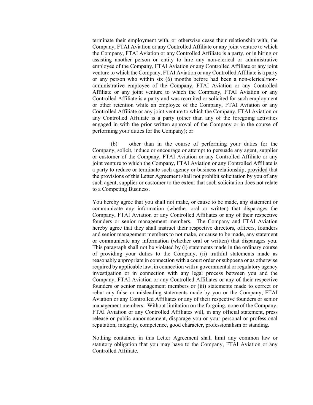 终止或以其他方式终止与公司、FTAI Aviation或任何受控关联公司或公司、FTAI Aviation或任何受控关联公司为其一方的任何合营企业的雇佣关系,或在雇用或协助另一人或实体雇用公司、FTAI Aviation或任何受控关联公司或任何受控关联公司为其一方的任何非文职或行政雇员或任何合营公司、FTAI Aviation或任何受控关联公司为其一方的任何合营公司或在六(6)个月前曾为公司非文职/非行政雇员的任何人,FTAI Aviation或任何受控关联公司或公司、FTAI Aviation或任何受控关联公司为其一方且在担任公司、FTAI Aviation或公司所属任何受控关联公司或任何合营公司的雇员期间被招聘或招揽此类雇用或其他保留的任何合营公司,FTAI Aviation或任何受控关联公司是一方(未经公司事先书面批准或在为公司履行职责过程中从事的前述任何活动除外);或(b)除在为公司履行职责过程中外,招揽、诱导或鼓励或试图说服公司的任何代理、供应商或客户、FTAI Aviation或公司所属的任何受控关联公司或任何合营企业,FTAI Aviation或任何受控关联公司为减少或终止此类代理或业务关系的一方;但本函证协议的规定不应禁止您向任何此类代理、供应商或客户进行招揽,只要此类招揽与竞争性业务无关。您在此同意,您不得作出或促使作出任何贬低公司、FTAI Aviation或任何受控关联公司或其各自的任何创始人或高级管理人员的陈述或传达任何信息(无论是口头或书面)。公司和FTAI Aviation在此同意,彼等应责成其各自的董事、高级职员、创始人和高级管理人员不作出或促使作出任何贬低您的声明或传达任何贬低您的信息(无论是口头的还是书面的)。(i)在向公司提供职责的正常过程中所作的陈述,(ii)就法院命令或传票或适用法律另有规定、就政府或监管机构的调查或就贵公司与公司之间的任何法律程序所作的合理适当的如实陈述,不得违反本款,FTAI Aviation或任何受控关联公司或其各自的任何创始人或高级管理成员,或(iii)为更正或反驳由您或公司、FTAI Aviation或任何受控关联公司或其各自的任何创始人或高级管理成员所作的任何虚假或误导性陈述而作出的陈述。在不限于前述情况下,公司、FTAI Aviation或任何受控关联公司均不会在任何官方声明、新闻稿或公告中贬低您或您的个人或专业声誉、诚信、能力、良好品格、专业精神或地位。本信函协议中所载的任何内容均不得限制您可能对公司、FTAI Aviation或任何受控关联公司承担的任何普通法或法定义务。