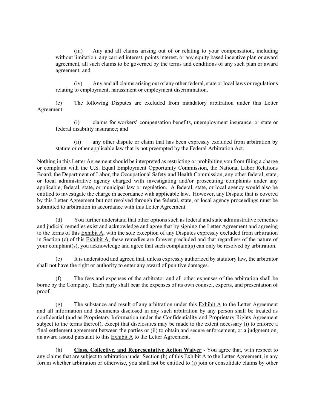 (iii)因贵公司的补偿而产生或与之有关的任何及所有索偿,包括但不限于任何附带权益、积分权益或任何股权激励计划或奖励协议,所有该等索偿须受任何该等计划或奖励协议的条款及条件所规限;及(iv)因任何其他联邦、州或地方有关雇佣、骚扰或就业歧视的法律或条例而产生的任何及所有索偿。(c)根据本信函协议,以下争议被排除在强制仲裁之外:(i)对工人赔偿福利、失业保险或州或联邦残疾保险的索赔;(ii)任何其他已被法规或其他适用法律明确排除在仲裁之外且未被《联邦仲裁法》优先考虑的争议或索赔。本信函协议中的任何内容均不应被解释为限制或禁止您向美国平等就业机会委员会、国家劳动关系委员会、劳工部、职业安全和健康委员会、负责根据任何适用的、联邦、州或市法律或法规调查和/或起诉投诉的任何其他联邦、州或地方行政机构提出指控或投诉。联邦、州或地方机构也有权根据适用法律调查这项指控。然而,任何本信函协议涵盖但未通过联邦、州或地方机构程序解决的争议必须根据本信函协议提交仲裁。(d)您进一步了解存在其他选择,例如联邦和州行政补救措施以及司法补救措施,并承认并同意,通过签署信函协议并同意本附件 A的条款,除了本附件 A第(c)节中明确排除在仲裁之外的任何争议外,这些补救措施将永远被排除,并且无论您的投诉的性质如何,您承认并同意此类投诉只能通过仲裁解决。(e)经理解和同意,除非成文法明确授权,仲裁员无权或有权进入任何惩罚性赔偿裁决。(f)仲裁员的费用和开支以及仲裁的所有其他费用由公司承担。各方当事人各自承担律师、专家、举证等费用。(g)根据信函协议的本附件 A项下的任何仲裁的实质内容和结果,以及任何人在任何该等仲裁中披露的所有信息和文件,均应被视为机密信息(以及根据保密和专有权利协议受其条款约束下的专有信息),但可能会在必要的范围内进行披露(i)以强制执行双方之间的最终和解协议,或(ii)以获得并确保强制执行或就根据信函协议的本附件 A项下签发的裁决作出判决。(h)集体、集体和代表诉讼豁免-您同意,就根据信函协议本附件 A节(b)项下须予仲裁的任何索赔而言,在任何法院无论仲裁或其他情况,您均无权(i)加入或合并由其他