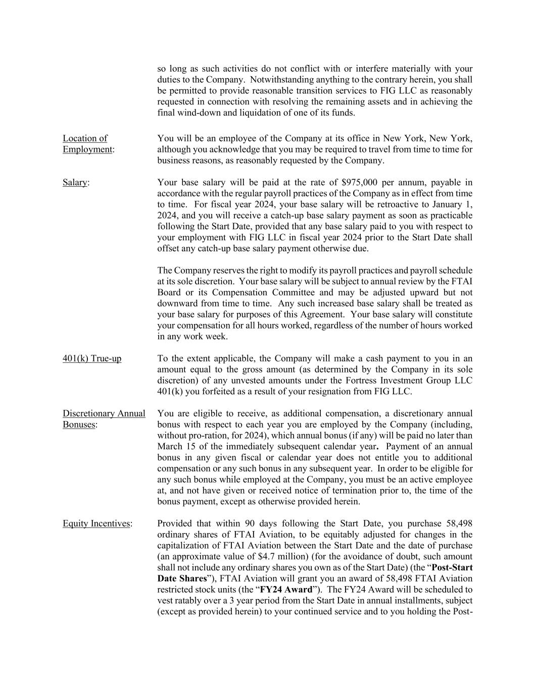 只要此类活动不与您对公司的职责相冲突或实质性干扰。尽管有任何与此相反的规定,你们应被允许根据合理要求向FIG LLC提供合理的过渡服务,以解决剩余资产并实现其一只基金的最终清盘和清算。工作地点:您将在公司位于纽约州纽约市的办公室担任公司的雇员,尽管您承认,根据公司的合理要求,您可能会因业务原因不时被要求出差。工资:您的基本工资将按每年975,000美元的费率支付,根据公司不时生效的常规工资惯例支付。对于2024财年,您的基本工资将追溯至2024年1月1日,并且您将在开始日期之后在切实可行的范围内尽快收到追赶基本工资付款,但前提是,在开始日期之前的2024财年,就您在FIG LLC的工作向您支付的任何基本工资应抵消任何否则应支付的追赶基本工资。公司保留自行决定修改其发薪惯例和发薪时间表的权利。您的基本工资将接受FTAI董事会或其薪酬委员会的年度审查,并可能不时向上调整但不得向下调整。就本协议而言,任何此类增加的基本工资应视为您的基本工资。你的基本工资将构成你对所有工作时间的补偿,无论任何工作周的工作小时数。401(k)校准(在适用范围内),公司将向您支付现金,金额等于您因从FIG LLC辞职而被没收的Fortress投资 LLC 401(k)下任何未归属金额的总额(由公司全权酌情决定)。酌情年度奖金:作为额外补偿,您有资格就您受雇于公司的每一年(包括不按比例分配的2024年)获得酌情年度奖金,该年度奖金(如有)将不迟于紧随其后的日历年度的3月15日支付。在任何给定的财政年度或日历年度支付年度奖金不会使您有权在随后的任何年度获得额外补偿或任何此类奖金。为了有资格在公司受雇时获得任何此类奖金,您必须是在奖金支付时间的在职员工,并且在此之前没有发出或收到终止通知,除非本文另有规定。股权激励:前提是在开始日期后的90天内,您购买了58,498股FTAI Aviation普通股,将根据开始日期和购买日期之间FTAI Aviation的资本化变化(价值约为470万美元)进行公平调整(为免生疑问,该金额不包括您在开始日期拥有的任何普通股)(“开始日期后的股份”),FTAI Aviation限制性股票单位的奖励将由FTAI Aviation授予您58,498股(“FY24奖励”)。24财年奖励计划将按比例在自开始日期起计的3年期间内按年度分期授予,但须视乎(除此处提供的情况外)您的持续服务和您持有的邮政-