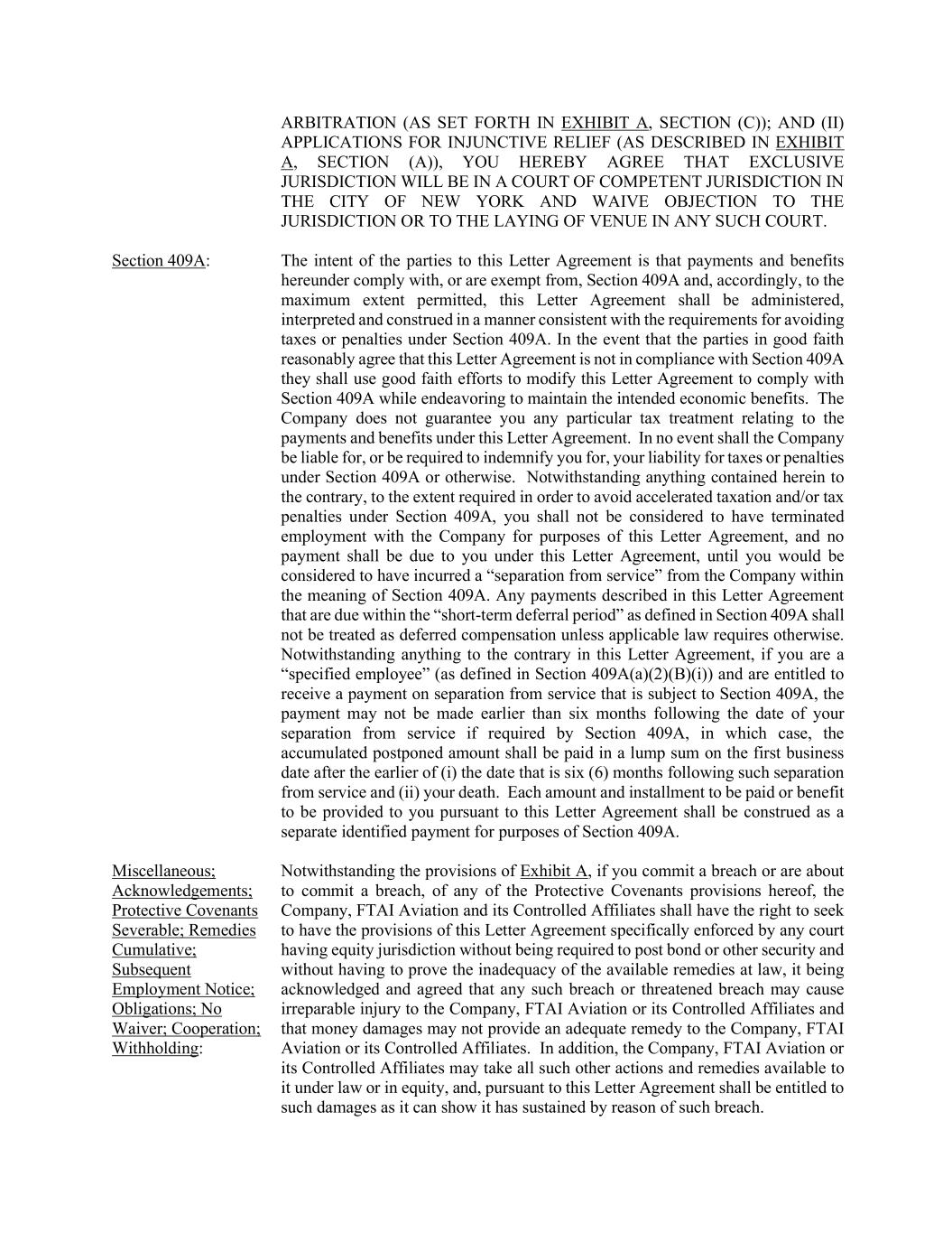 仲裁(见附件A,第(c)款);(ii)申请强制性救济(见附件A,第(a)款),兹同意专属管辖权将在纽约市的主管管辖法院,并放弃对管辖权的异议或对任何此类法院的场地铺设的异议。第409A条:本信函协议各方的意图是,本协议项下的付款和利益符合或豁免于第409A条,因此,在允许的最大范围内,本信函协议应以符合第409A条下的避税或罚款要求的方式管理、解释和解释。如果各方善意合理地同意本信函协议不符合第409A条的规定,他们应通过善意努力修改本信函协议以符合第409A条的规定,同时努力保持预期的经济利益。本公司不向贵公司保证与本信函协议项下的付款和福利有关的任何特定税务处理。在任何情况下,公司均不对您根据第409A条或其他规定承担的税款或罚款责任承担责任,或被要求赔偿您。尽管本文中有任何相反的内容,但在为避免根据第409A条加速征税和/或税务处罚所要求的范围内,就本信函协议而言,您不应被视为已终止与公司的雇佣关系,并且根据本信函协议不应向您支付任何款项,直到您被视为已招致第409A条所指的与公司的“离职”。除非适用法律另有规定,否则本函协议中所述的在第409A条所定义的“短期延期期限”内到期的任何付款不应被视为延期赔偿。尽管本函件协议另有相反规定,如你是一名“指明雇员”(定义见第409A(a)(2)(b)(i)条),并有权收取受第409A条规限的离职偿金,如第409A条规定,则该偿金不得早于你离职日期后六个月支付,在此情况下,累积的延期付款须于(i)离职后六(6)个月的日期及(ii)你的死亡后较早的日期后的首个营业日期一次付清。根据本信函协议将支付给您的每笔金额和分期付款或将向您提供的利益应被解释为为第409A条所指的单独确定的付款。杂项;承认;保护性契约可分割;补救措施累加;后续雇佣通知;义务;不放弃;合作;拒绝:尽管有附件 A的规定,如果您违反或即将违反本协议的任何保护性契约条款,公司、FTAI Aviation及其控制的关联公司有权寻求由任何具有股权管辖权的法院具体执行本函协议的规定,而无需邮寄保证金或其他担保,也无需在法律上证明可用补救措施的不足之处,承认并同意,任何该等违约或威胁违约均可能对公司、FTAI Aviation或其控制的关联公司造成无法弥补的损害,且金钱损失可能无法对公司、FTAI Aviation或其控制的关联公司提供充分的补救措施。此外,公司、FTAI Aviation或其控制的关联公司可能会根据法律或股权采取其可用的所有其他行动和补救措施,并且,根据本信函协议,有权获得其能够证明的因此类违约行为而遭受的损害赔偿。