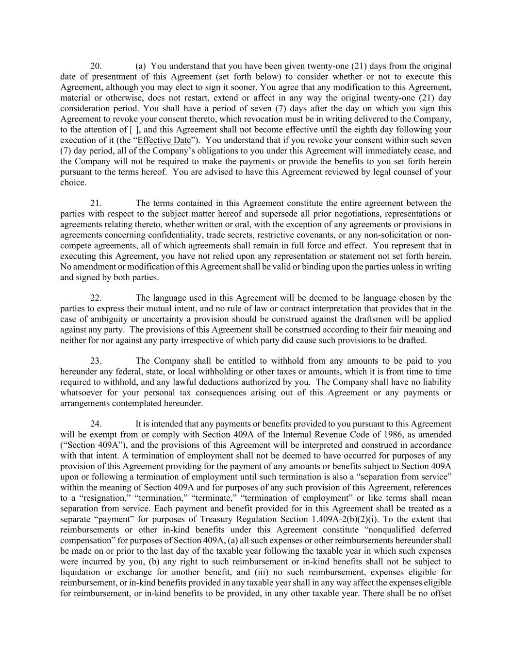 20.(a)你方明白,自本协议的原始提交日期(如下所述)起,已给予你二十一(21)天的时间来考虑是否执行本协议,尽管你可以选择更早签署。你们同意,对本协议的任何修改,无论是重大的还是其他的,都不会以任何方式重新开始、延长或影响原二十一(21)天的考虑期限。你方自签署本协议之日起有七(7)天的时间撤销你对协议的同意,而该撤销必须以书面送达公司,并须提请[ ]方注意,而本协议须于你方签署后的第八天(“生效日期”)方可生效。你方理解,如果你在这七(7)天期限内撤销你的同意,公司根据本协议对你承担的所有义务将立即终止,公司将无需根据本协议的条款向你支付本协议规定的款项或提供本协议规定的利益。建议您让您选择的法律顾问审查本协议。21.本协议所载条款构成双方就本协议标的事项达成的全部协议,并取代之前所有与之相关的谈判、陈述或协议,无论是书面的还是口头的,但协议中有关保密、商业秘密、限制性契约或任何不招揽或不竞争协议的任何协议或规定除外,所有这些协议均应保持完全有效。贵公司声明,在执行本协议时,您没有依赖任何未在此阐述的陈述或声明。除非以书面形式并经双方签署,否则本协议的任何修改或修改均不对双方有效或具有约束力。22.本协议中使用的语言将被视为各方为表达其共同意图而选择的语言,任何规定在模棱两可或不确定的情况下应对起草人解释条款的法治或合同解释将不会适用于任何一方。本协议的条款应根据其公平含义进行解释,不支持也不反对任何一方,无论是哪一方促成了此类条款的起草。23.公司有权从根据任何联邦、州或地方预扣税或其他不时被要求预扣的税款或金额下支付给您的任何金额中预扣,以及您授权的任何合法扣除。本公司对贵公司因本协议或本协议项下所设想的任何付款或安排而产生的个人税务后果不承担任何责任。24.本意是,根据本协议向你们提供的任何付款或福利将被豁免或遵守经修订的1986年《国内税收法典》第409A条(“第409A条”),本协议的规定将按照该意图进行解释和解释。就本协议的任何条款而言,终止雇用不应被视为已发生,该条款规定在终止雇用时或之后支付受第409A条约束的任何金额或福利,直到该终止也是第409A条含义内的“离职”,并且就本协议的任何此类条款而言,提及“辞职”、“终止”、“终止”、“终止雇用”或类似条款应意味着离职。本协议中规定的每一笔付款和福利应被视为财政部条例第1.409A-2(b)(2)(i)节的单独“付款”。就第409A条而言,如果本协议项下的补偿或其他实物福利构成“不合格的递延补偿”,(a)本协议项下的所有此类费用或其他补偿应在您发生此类费用的纳税年度的下一个纳税年度的最后一天或之前进行,(b)获得此类补偿或实物福利的任何权利不得被清算或交换为其他福利,以及(iii)没有此类补偿,符合补偿条件的费用,或者在任何一个纳税年度提供的实物福利,应当以任何方式影响其他任何一个纳税年度符合报销条件的费用或者应当提供的实物福利。不得有抵销