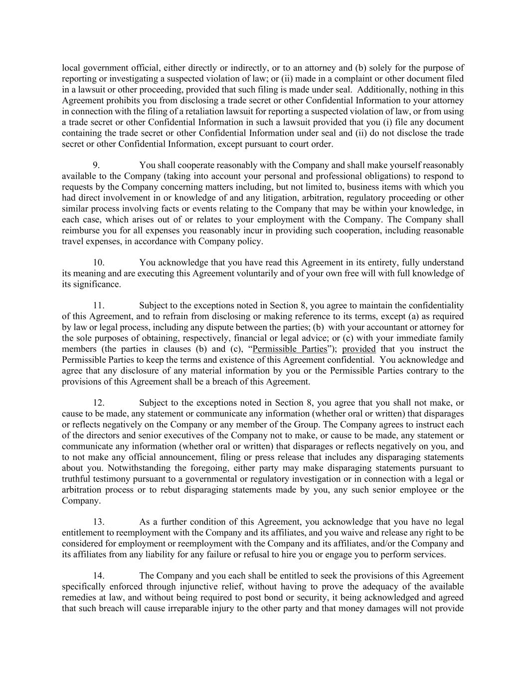 当地政府官员,直接或间接地,或向律师和(b)仅为报告或调查涉嫌违法行为的目的;或(ii)在诉讼或其他程序中提交的投诉或其他文件中作出,前提是此种提交是在盖章的情况下作出的。此外,本协议中的任何规定均不禁止您就举报涉嫌违法行为提起报复诉讼向您的律师披露商业秘密或其他机密信息,或在此类诉讼中使用商业秘密或其他机密信息,前提是您(i)将任何包含该商业秘密或其他机密信息的文件归档并盖章,并且(ii)不披露该商业秘密或其他机密信息,除非根据法院命令。9.你应与公司合理合作,并应让自己合理地与公司(考虑到你的个人和专业义务)联系,以回应公司有关事项的请求,这些事项包括但不限于你直接参与或知悉的业务项目以及在每种情况下因你受雇于公司而产生或与之有关的涉及与公司有关的事实或事件的任何诉讼、仲裁、监管程序或其他类似程序,在每种情况下。公司将根据公司政策,向您报销您在提供此类合作中合理产生的所有费用,包括合理的差旅费。10.您承认您已完整阅读本协议,完全理解其含义,并在完全了解其重要性的情况下自愿和自愿地执行本协议。11.除第8节中指出的例外情况外,你们同意对本协议进行保密,并且不披露或提及其条款,除非(a)根据法律或法律程序的要求,包括各方之间的任何争议;(b)仅为分别获得财务或法律建议的目的与你们的会计师或律师;或(c)与你们的直系亲属(((b)和(c)条款中的当事人,“允许的当事人”);前提是你们指示允许的当事人对本协议的条款和存在情况保密。你们承认并同意,你们或允许方违反本协议的规定披露任何重大信息,即为违反本协议。12.除第8节所述的例外情况外,你同意不得作出或促使作出任何声明或传达任何贬低或对公司或集团任何成员产生负面影响的信息(无论是口头或书面)。公司同意指示公司每位董事和高级管理人员不得作出或促使作出任何声明或传达任何贬低或对你产生负面影响的信息(无论是口头或书面),也不得作出任何包含任何贬低你的声明的正式公告、备案或新闻稿。尽管有上述规定,任何一方都可以根据根据政府或监管调查或与法律或仲裁程序有关的真实证词作出贬低性陈述,或反驳您、任何此类高级雇员或公司作出的贬低性陈述。13.作为本协议的另一项条件,贵方承认贵方没有再受雇于本公司及其关联公司的合法权利,贵方放弃并解除任何被考虑受雇于或再受雇于本公司及其关联公司的权利,和/或本公司及其关联公司对任何未能或拒绝雇用贵方或聘用贵方提供服务的任何责任。14.公司和你们各自有权寻求通过禁令救济具体强制执行的本协议条款,而无需在法律上证明可用补救措施的充分性,也无需要求过押保证金或担保,经确认并同意,该违约行为将对另一方造成无法弥补的损害,且金钱损失不会提供