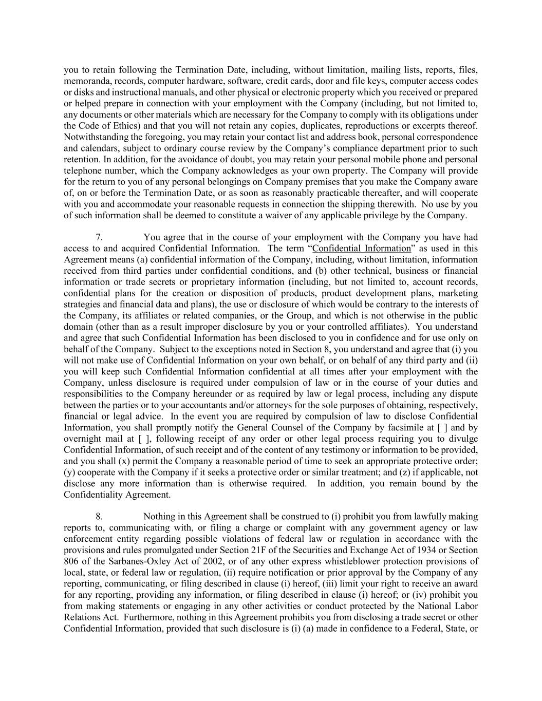 您将在终止日期后保留,包括但不限于邮寄名单、报告、档案、备忘录、记录、计算机硬件、软件、信用卡、门和文件钥匙、计算机存取代码或磁盘以及教学手册,以及您收到或准备或帮助准备的与您受雇于公司有关的其他实物或电子财产(包括但不限于公司为遵守其在Code of Ethics下的义务所必需的任何文件或其他材料),并且您将不保留其任何副本、副本、复制品或节选。尽管有上述规定,您仍可保留您的联系人名单和通讯录、个人通信和日历,但须在保留前接受公司合规部门的普通课程审查。此外,为免生疑问,您可能会保留您的个人手机和个人电话号码,公司确认为您的财产。本公司将规定在终止日期当日或之前,或在其后合理可行的范围内尽快将贵公司知悉的公司处所内的任何个人物品退还予贵公司,并将与贵公司合作并满足贵公司在与其有关的运输方面的合理要求。您使用此类信息的任何行为均不应被视为构成公司对任何适用特权的放弃。7.您同意,在您受雇于公司的过程中,您有权访问和获得机密信息。本协议所使用的“机密信息”一词是指(a)公司的机密信息,包括但不限于在保密条件下从第三方收到的信息,以及(b)其他技术、业务或财务信息或商业秘密或专有信息(包括但不限于账户记录、创建或处置产品的机密计划、产品开发计划、营销策略以及财务数据和计划),其使用或披露将违反公司、其关联公司或相关公司或集团的利益,并且不在公共领域(因此您或您控制的关联公司的不当披露除外)。你方理解并同意该等机密资料已以保密方式向你方披露,并仅供代表公司使用。除第8节中所述的例外情况外,您理解并同意(i)您不会代表您自己或代表任何第三方使用机密信息,以及(ii)在您受雇于公司后,您将始终对此类机密信息进行保密,除非根据法律强制要求或在您根据本协议对公司履行职责和责任的过程中或根据法律或法律程序的要求进行披露,包括各方之间的任何争议或仅为获取目的而向您的会计师和/或律师披露,分别为财务或法律咨询。如遇法律强制要求贵方披露机密信息,贵方应在收到要求贵方披露机密信息的任何命令或其他法律程序后,迅速以传真[ ]和隔夜邮件[ ]的方式通知公司总法律顾问,并将此种收到和将提供的任何证词或信息的内容,而你方应(x)准许公司在合理时间内寻求适当的保护令;(y)如公司寻求保护令或类似待遇,则应与公司合作;及(z)如适用,不得披露比其他要求更多的信息。此外,您仍然受保密协议的约束。8.本协议中的任何内容均不得解释为(i)禁止您根据1934年《证券交易法》第21F条或2002年《萨班斯-奥克斯利法案》第806条颁布的条款和规则,或根据当地、州或联邦法律或法规的任何其他明确的举报人保护条款,就可能违反联邦法律或法规的行为向任何政府机构或执法实体合法报告、与其沟通或提出指控或投诉,(ii)要求公司通知或事先批准任何报告、沟通,或第(i)款所述的归档,(iii)限制您因第(i)款所述的任何报告、提供任何信息或归档而获得奖励的权利;或(iv)禁止您发表声明或从事受《国家劳动关系法》保护的任何其他活动或行为。此外,本协议中没有任何规定禁止您披露商业秘密或其他机密信息, 前提是此类披露是(i)(a)以保密方式向联邦、州或